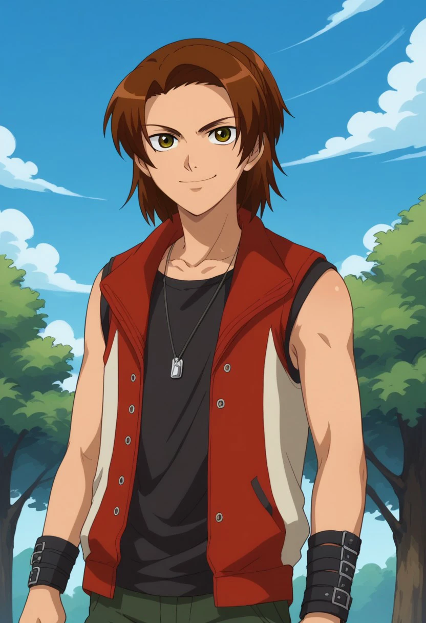 masardaim, 1boy, male focus, solo, green eyes, brown hair, ponytail, shirt, black shirt, jewelry, dog tags, jacket, red jacket, sleeveless jacket, open jacket, open clothes, pants, green pants, wristband, shoes, sneakers,