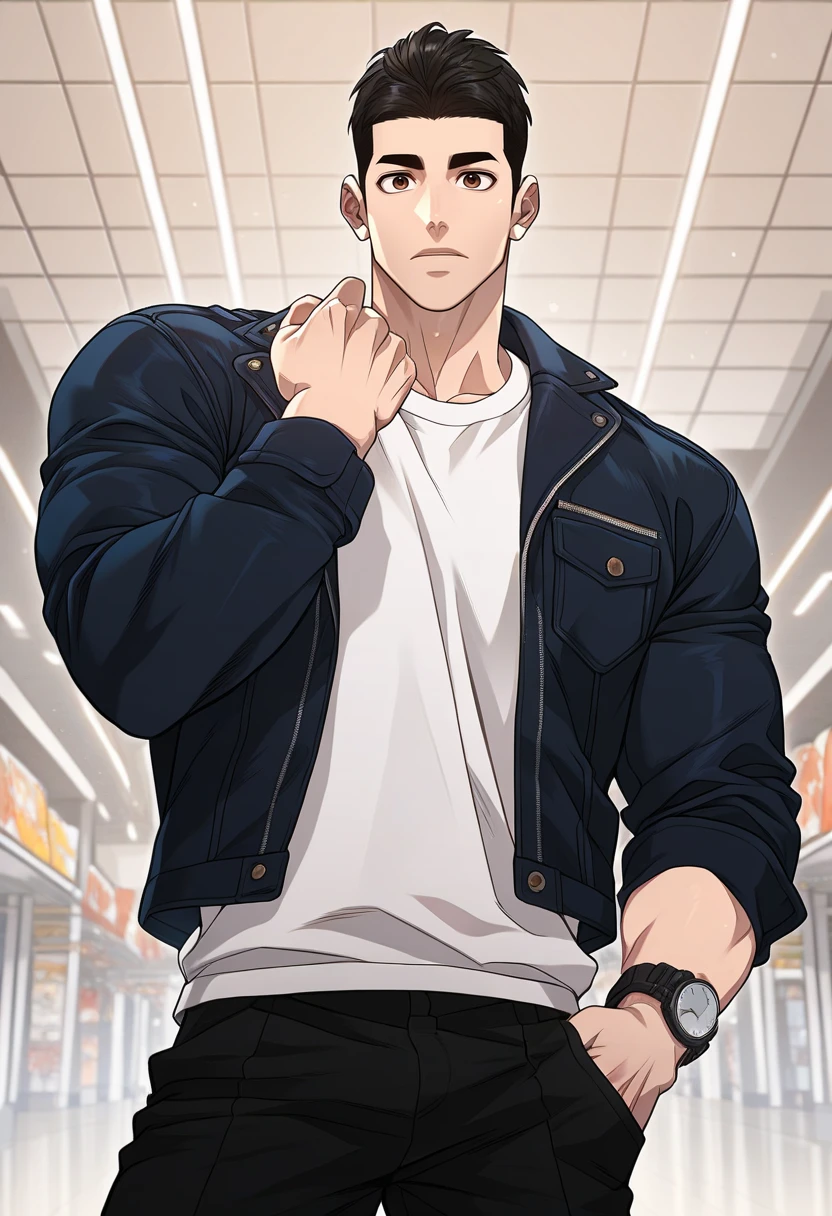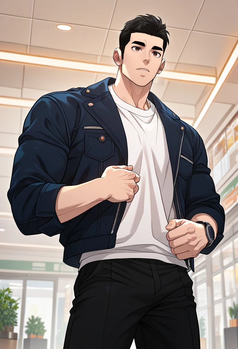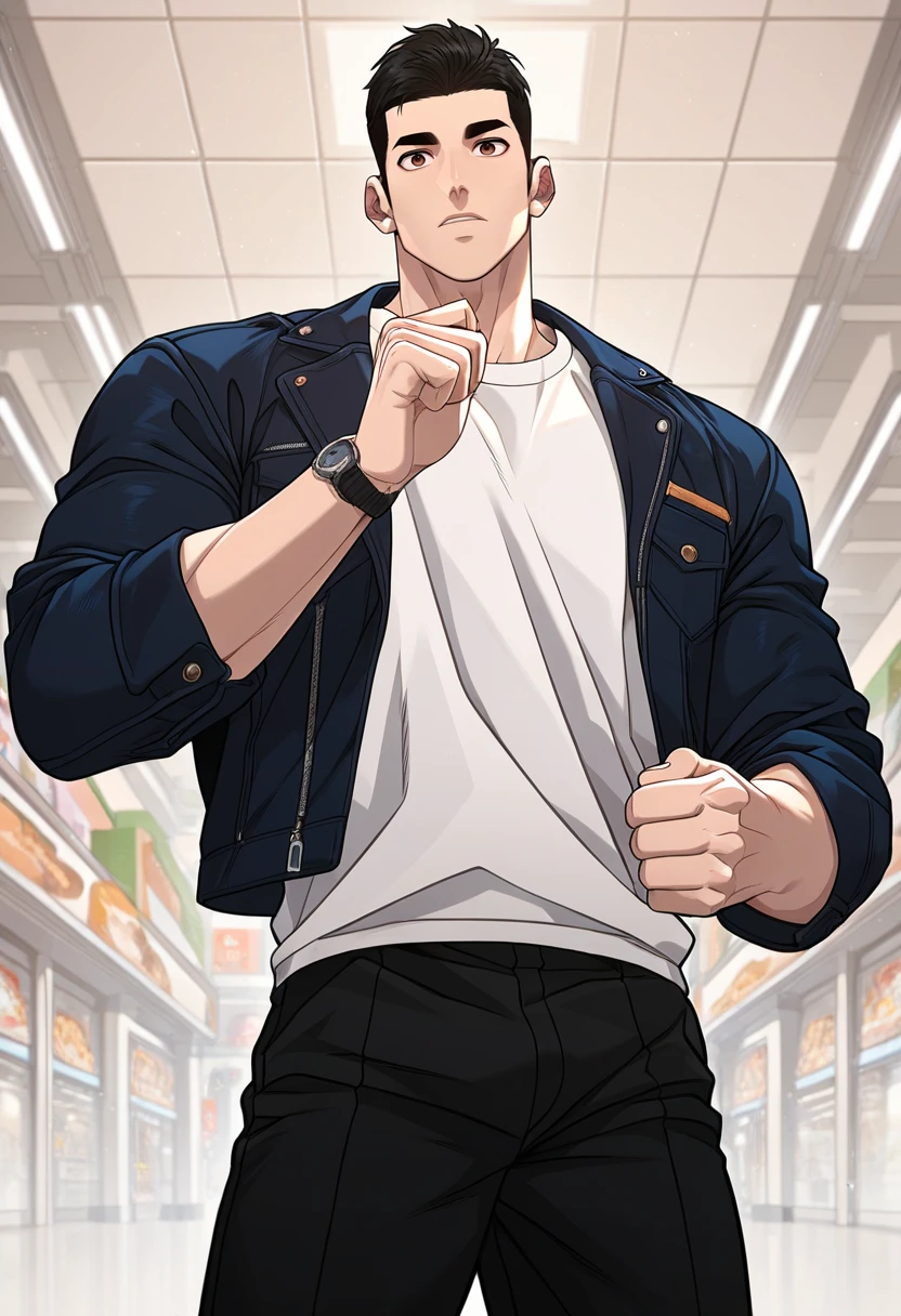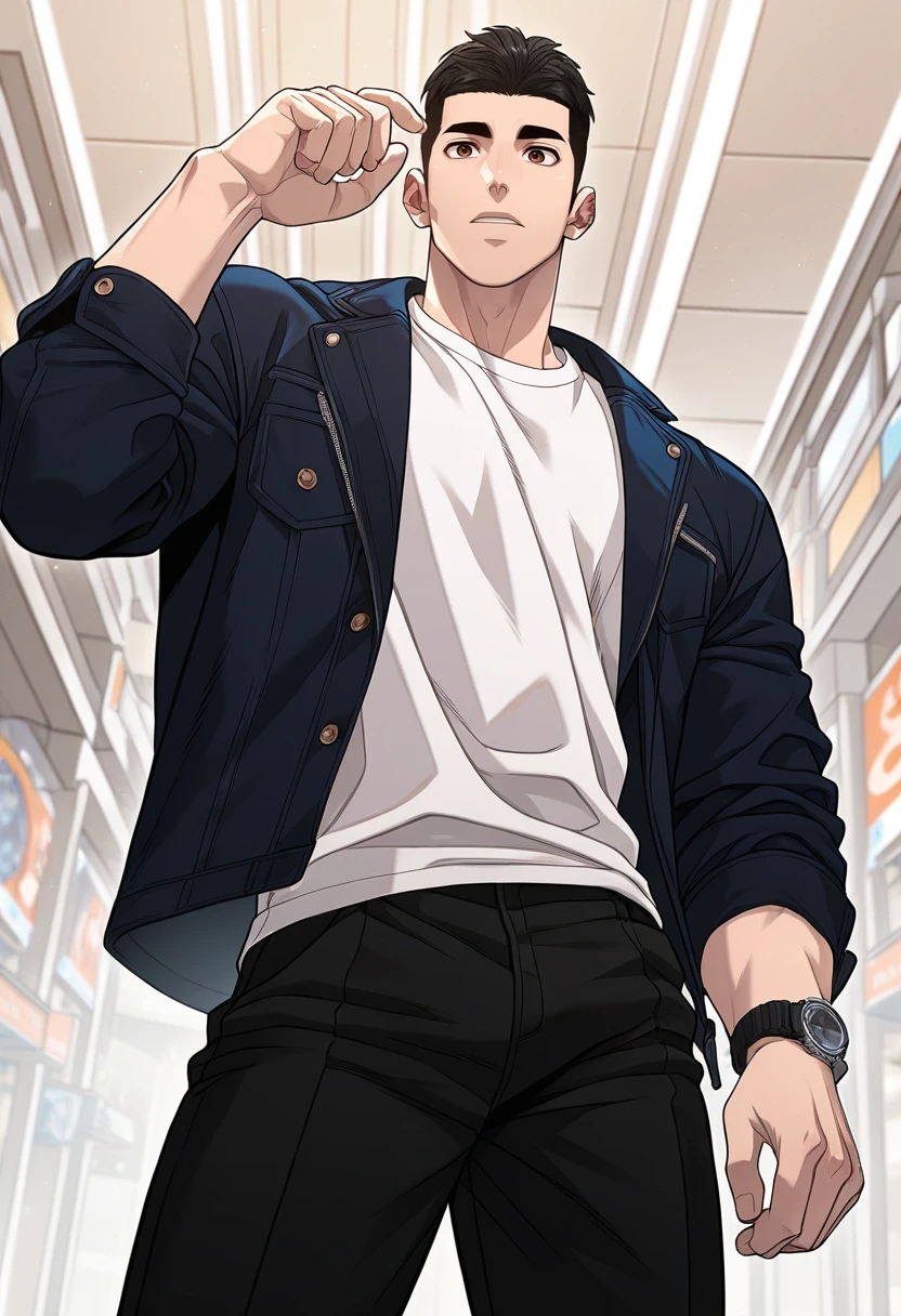 for casual: black jacket, white shirt, black pants, wristwatch