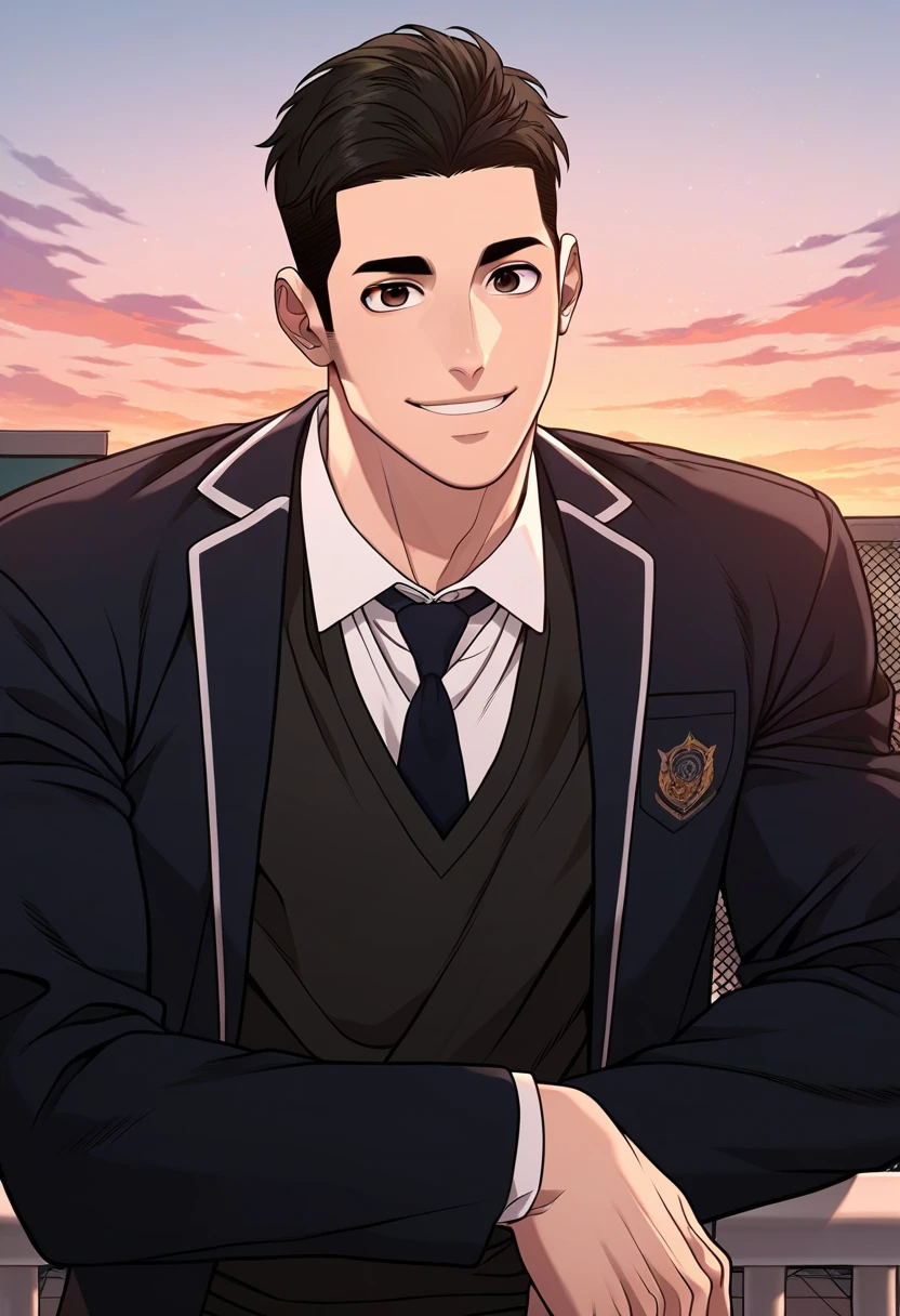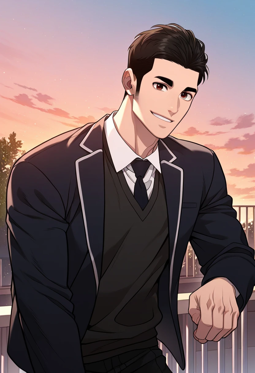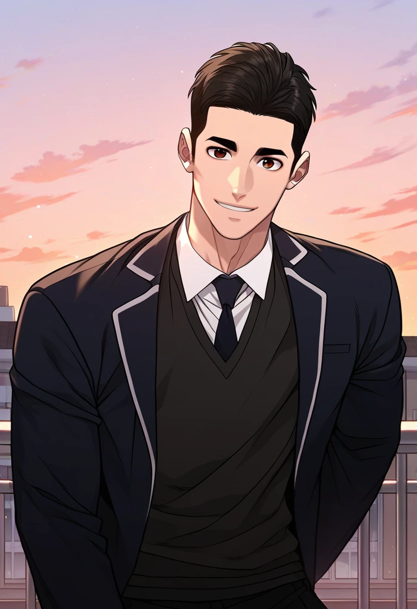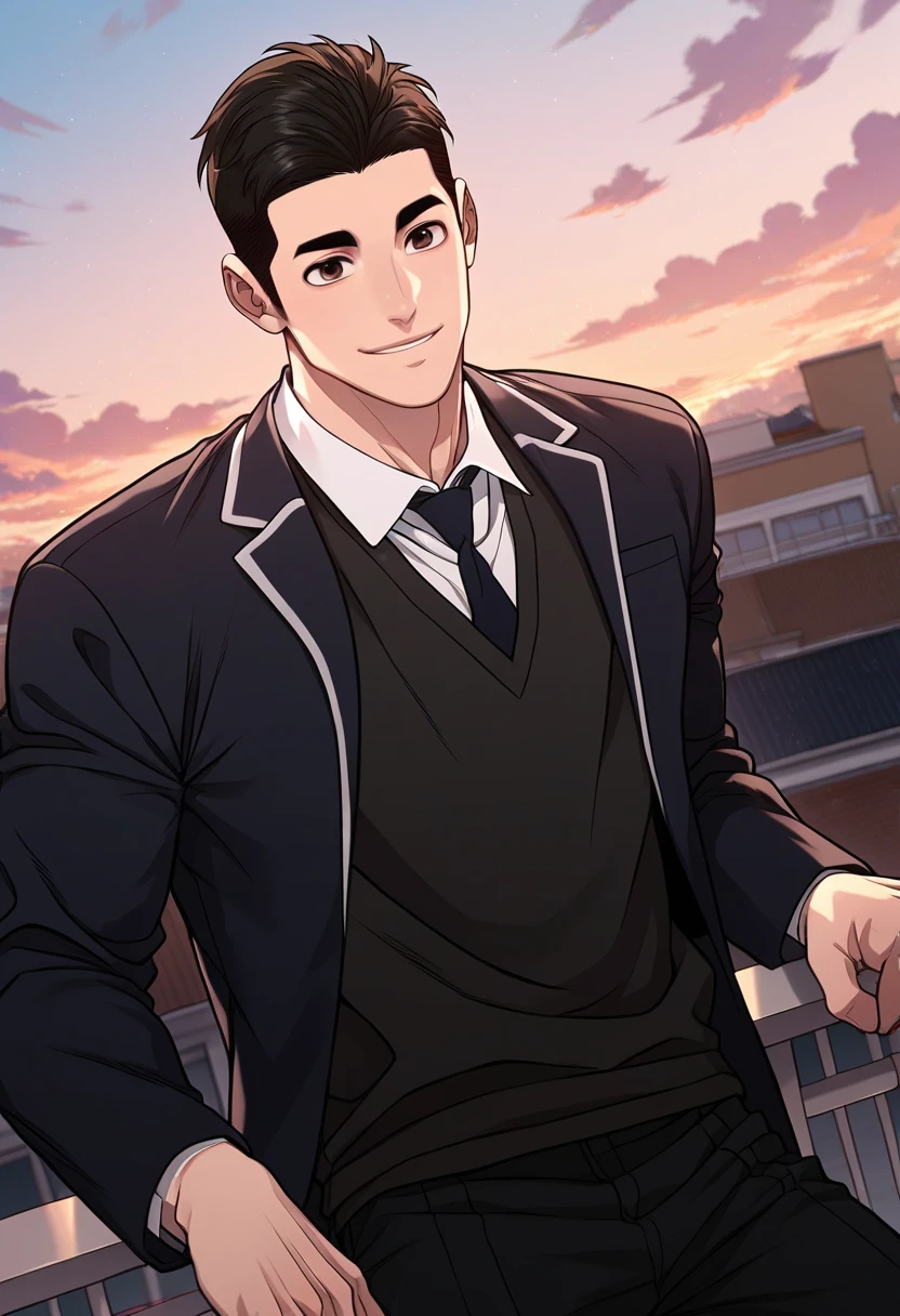 For usual appearance: school uniform, black necktie, black blazer,