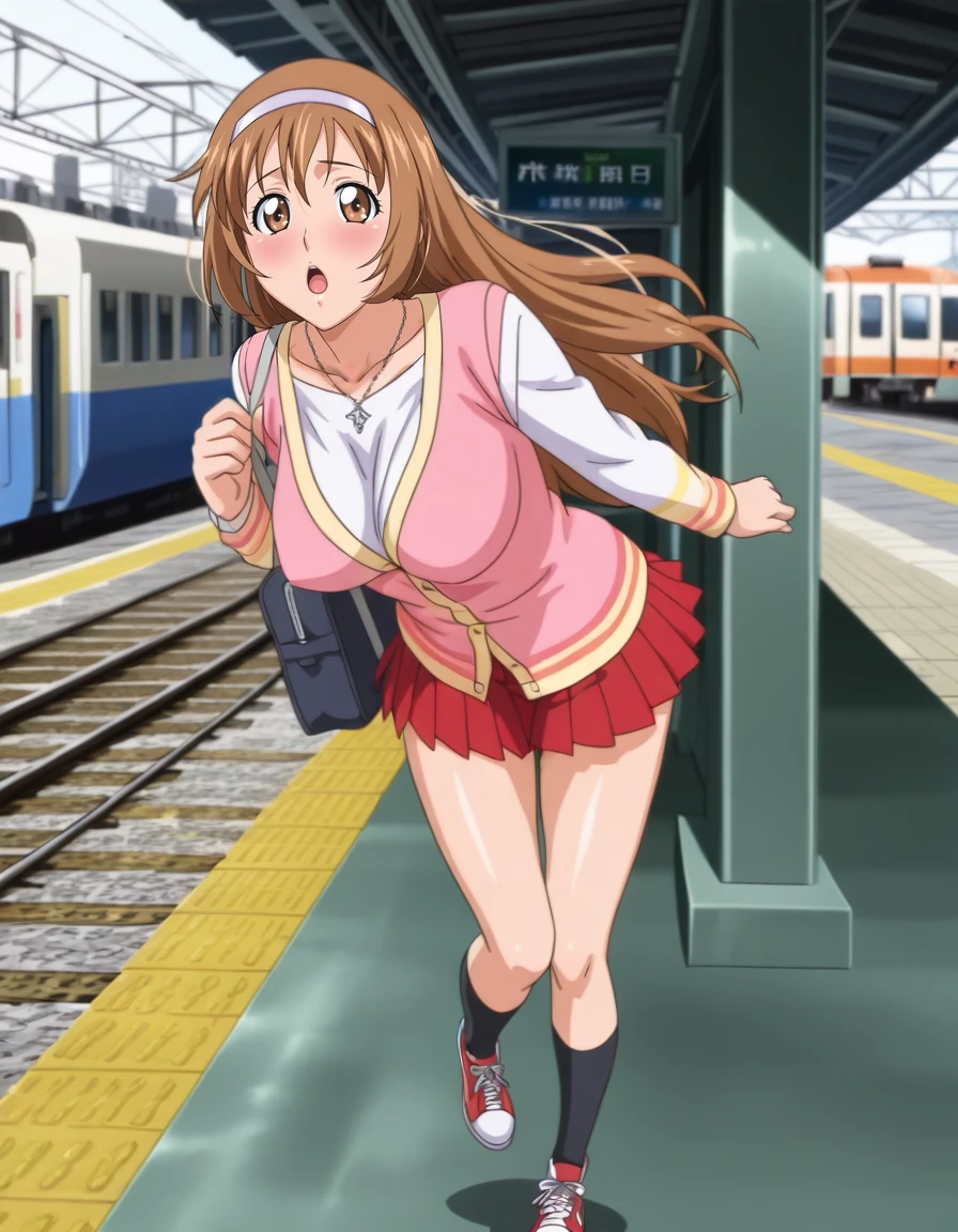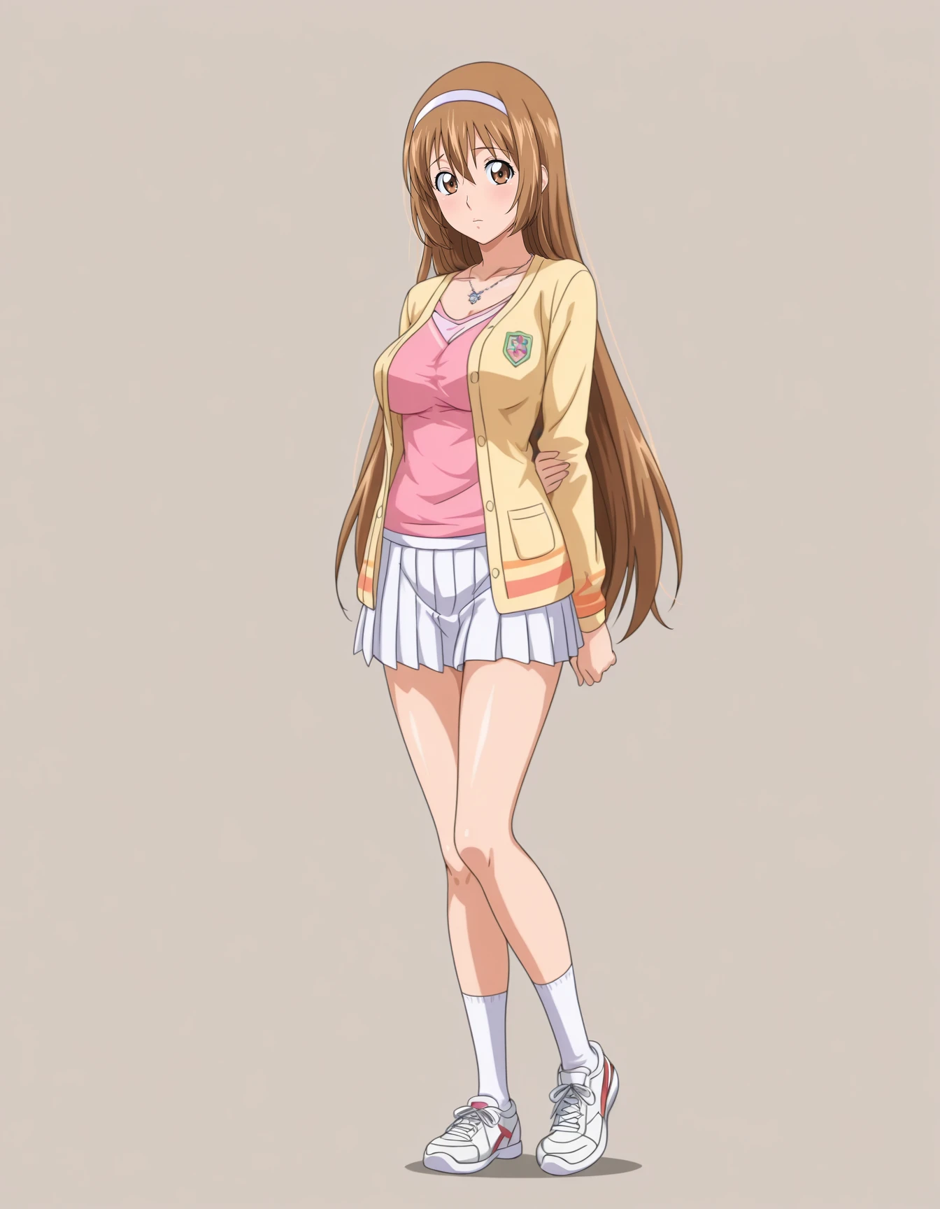 mai_owks,mai_ayumuoks,very_long_hair,brown_hair,hair_between_eyes,brown_eyes,white_hairband,necklace,pink_shirt,long_sleeves,yellow_jacket,open_cardigan,pleated_skirt,white_skirt,white_socks,white_sneakers
