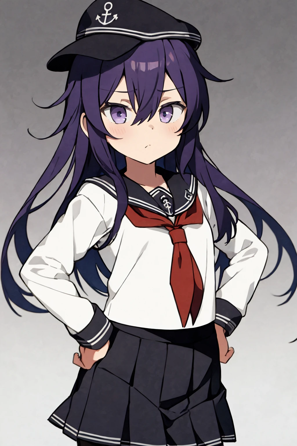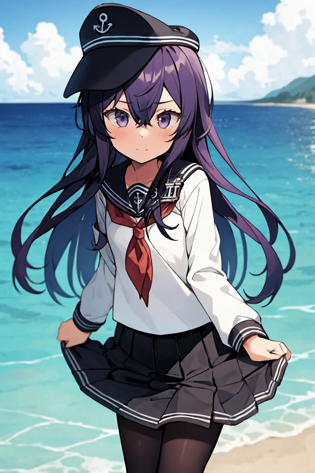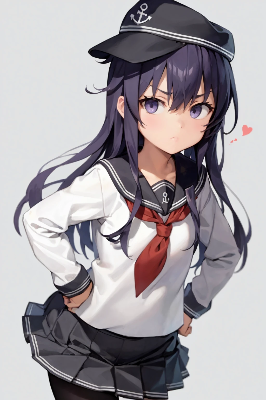Basic uniform prompts : anchor symbol, flat cap, black sailor collar, loafers, long sleeves, neckerchief, black skirt, pleated skirt, school uniform, serafuku, black pantyhose
