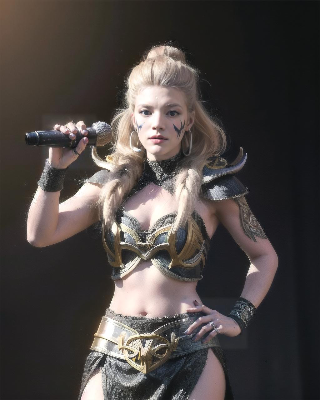 You can trigger her stage outfit by adding viking armor, facepaint to your prompt and horns to your negative prompt. Likewise you can trigger her in normal attire by adding all of those to you negative prompts.