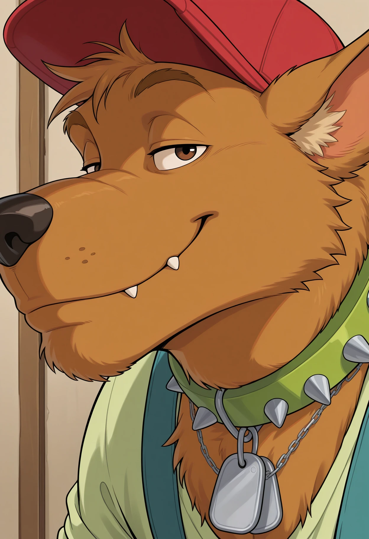 junky4rd, dog, red hat, spiked collar, dog tags, spiked bracelet, chain bracelet, bandaged wrist, junkyard's overalls, green shirt,