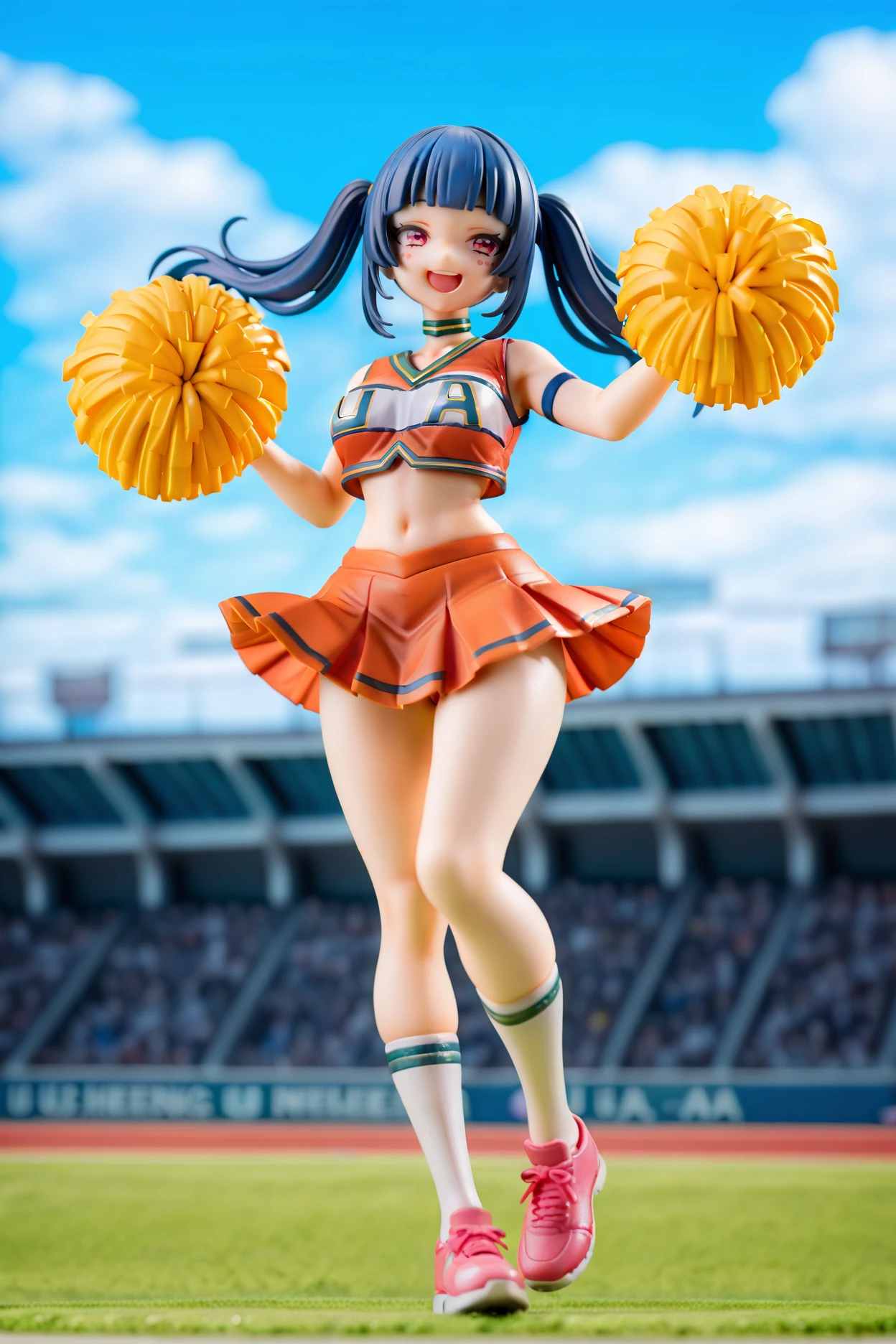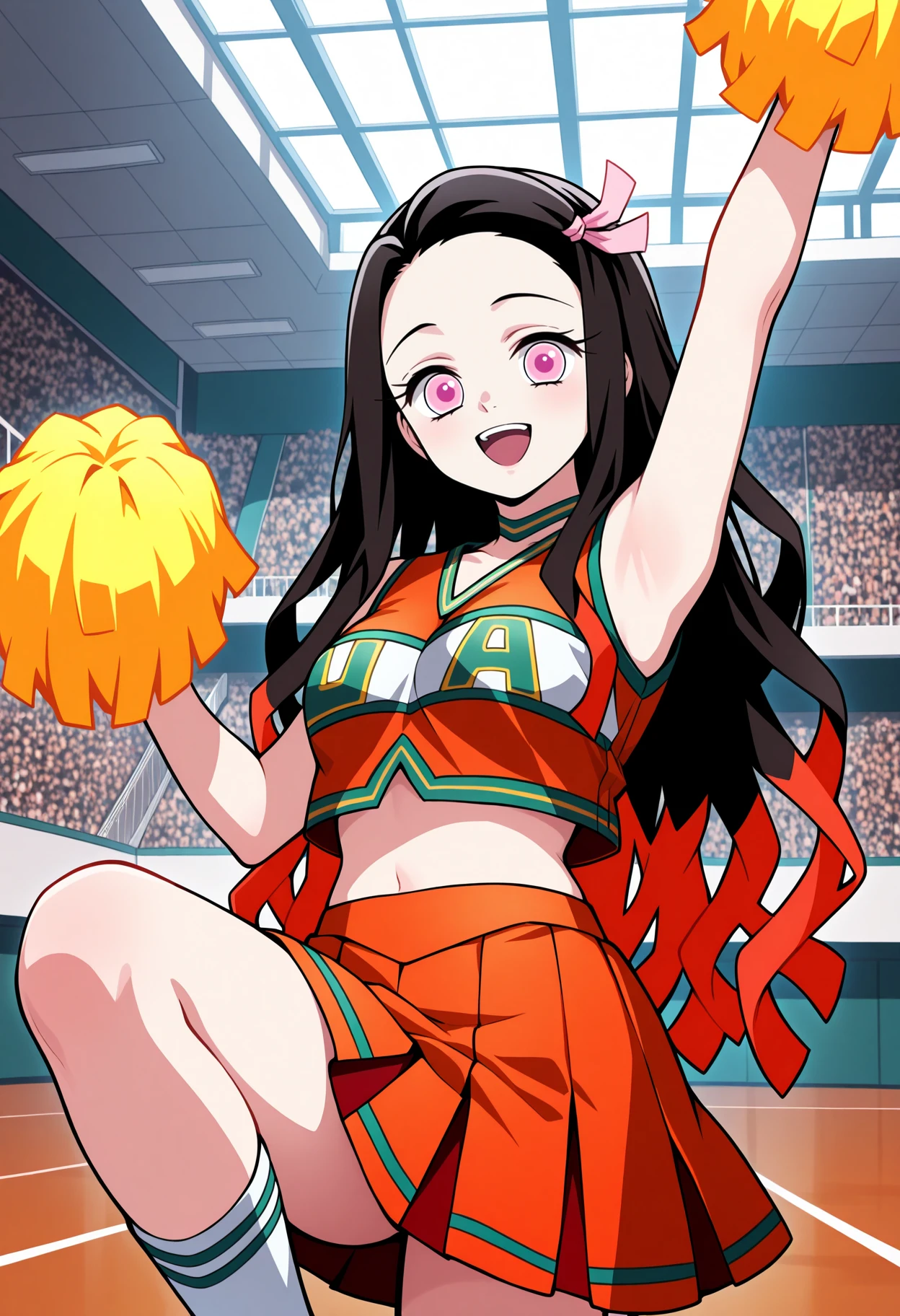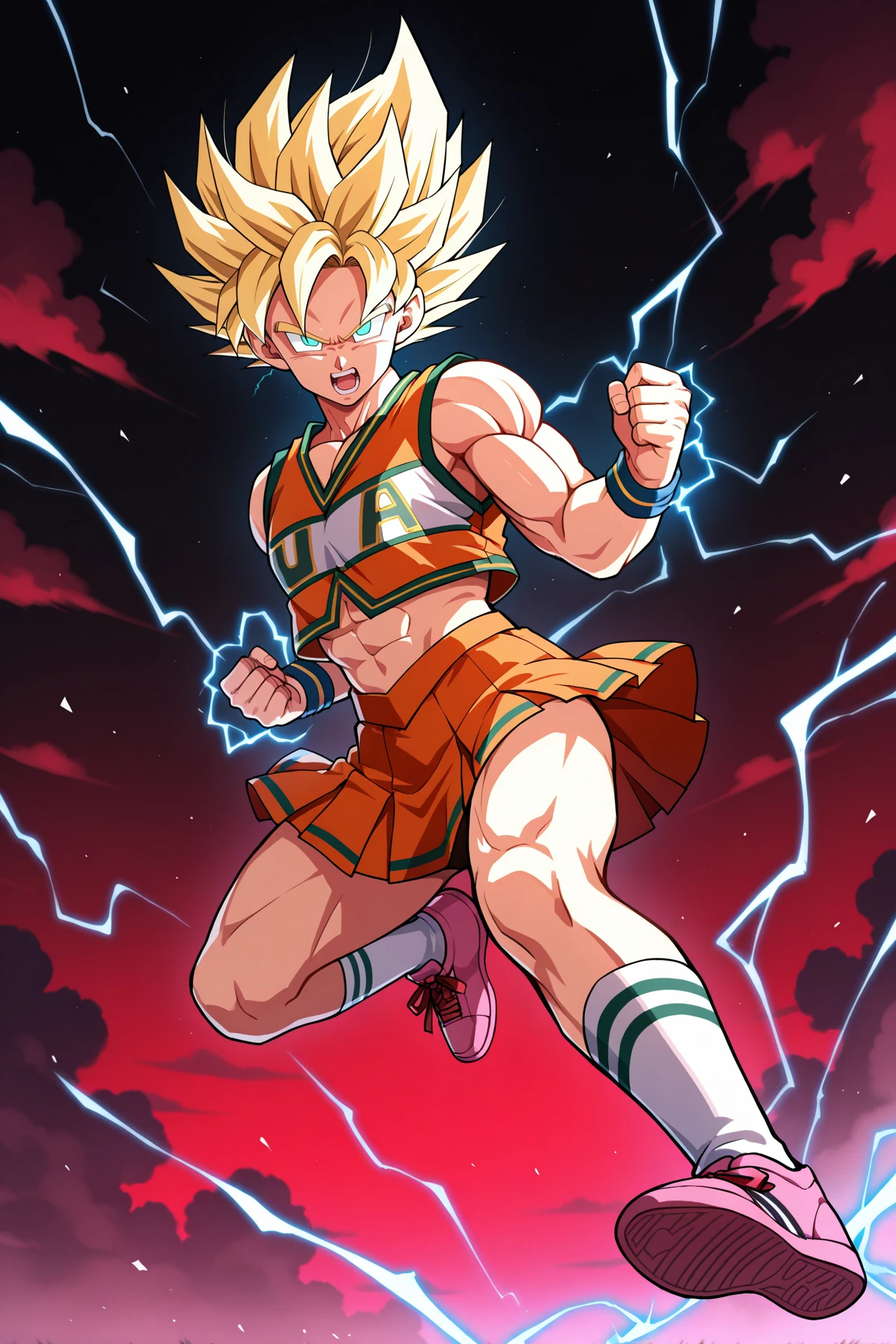 u.a. cheerleader uniform, orange crop top, orange pleated skirt, green choker, green clothes writing, white kneehighs, pink sneakersIs not overfit, so if you don't use the triggers some parts might look funny or not work at all, especially the main one. anime screencap can give you a mini MHA style but it doesn't work like a real one. yellow pom pom \(cheerleading\) is there if you want it or use as negative because sometimes it just appears because of cheerleader.