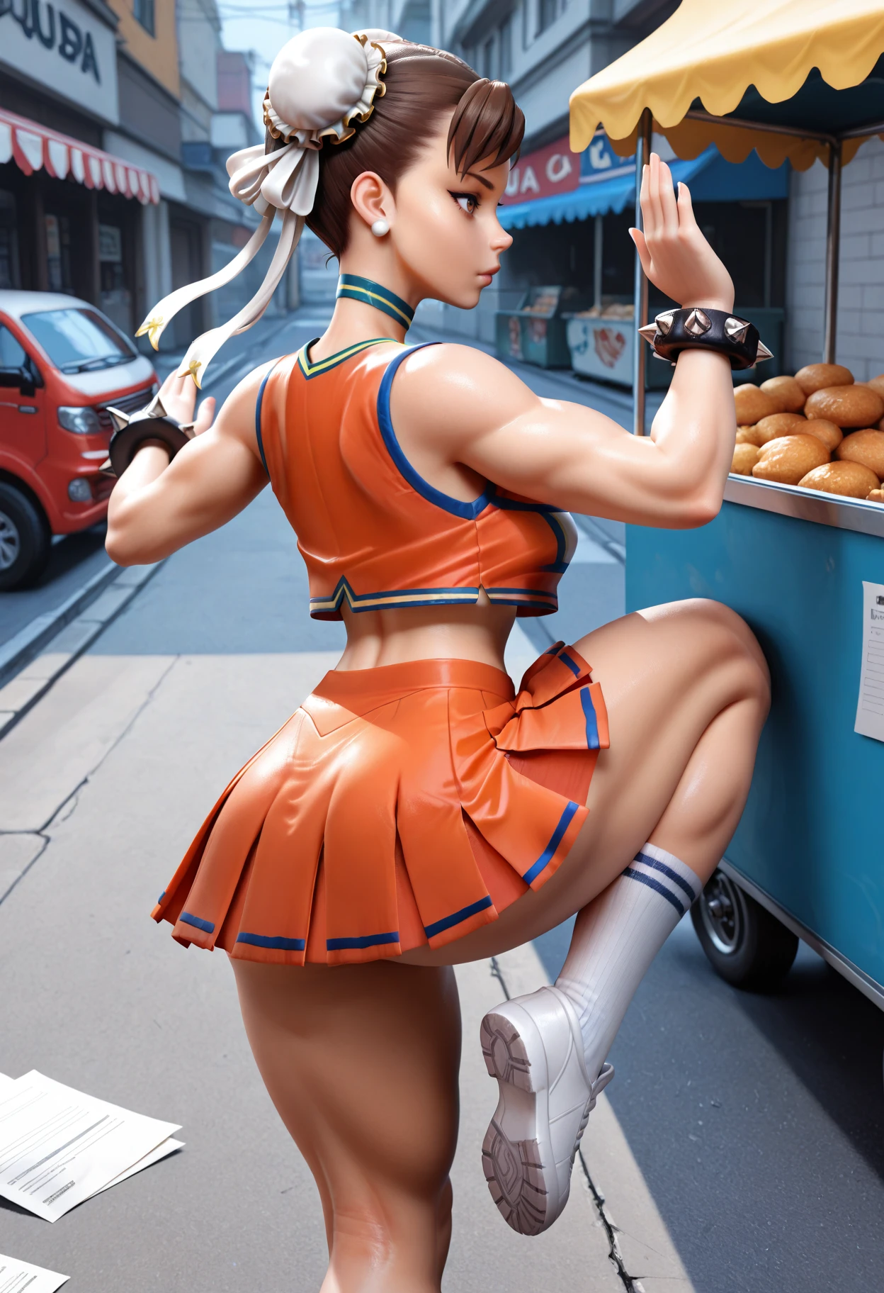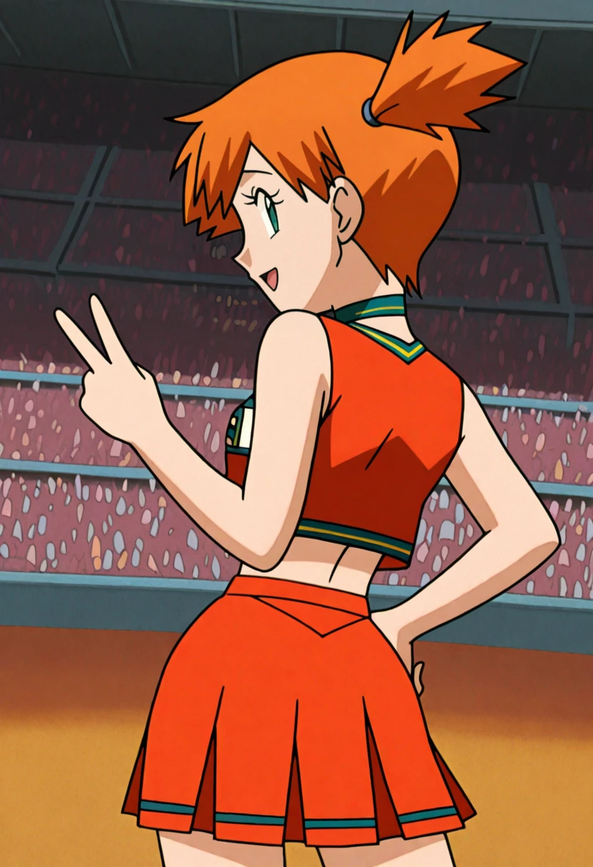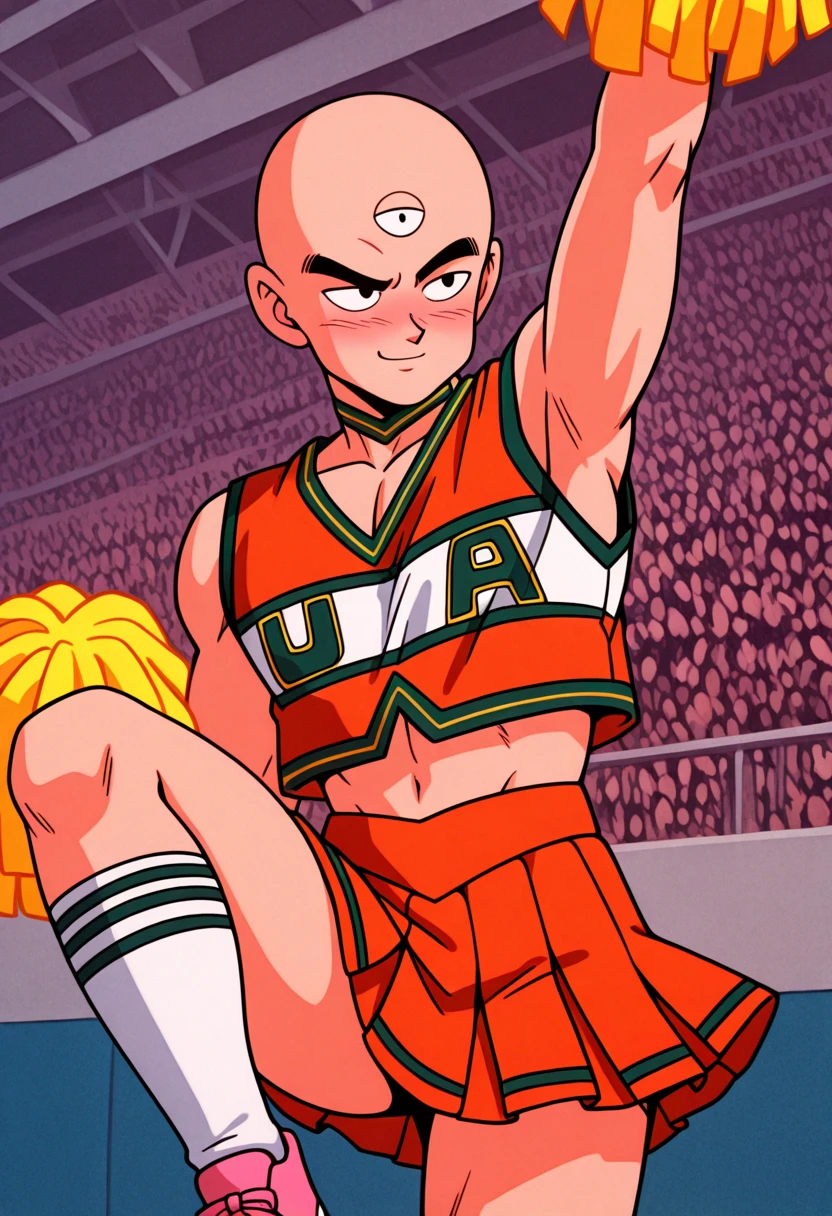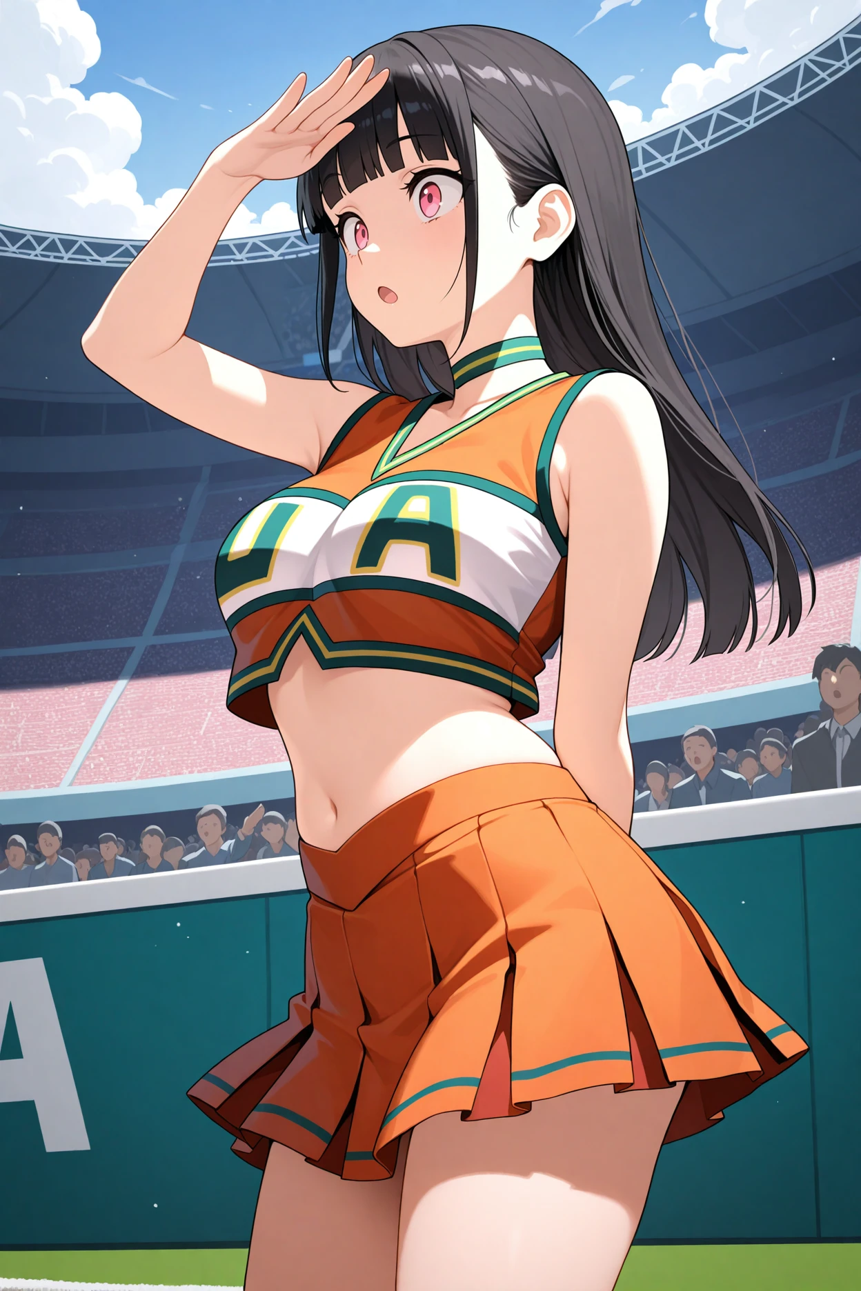 u.a. cheerleader uniform, orange crop top, orange pleated skirt, green choker, green clothes writing, white kneehighs, pink sneakersIs not overfit, so if you don't use the triggers some parts might look funny or not work at all, especially the main one. anime screencap can give you a mini MHA style but it doesn't work like a real one. yellow pom pom \(cheerleading\) is there if you want it or use as negative because sometimes it just appears because of cheerleader.