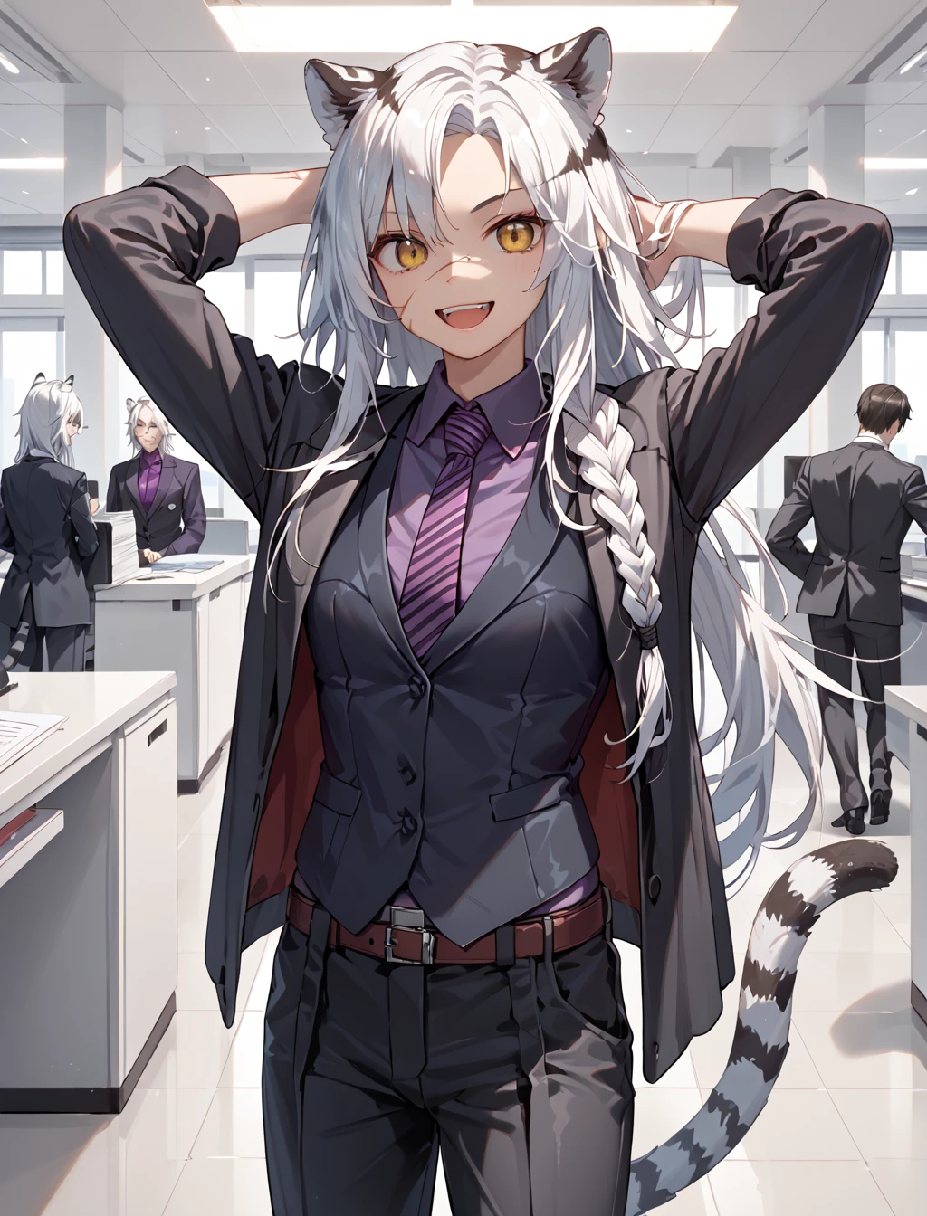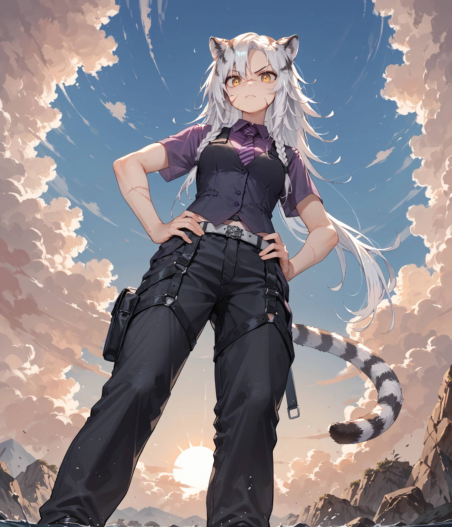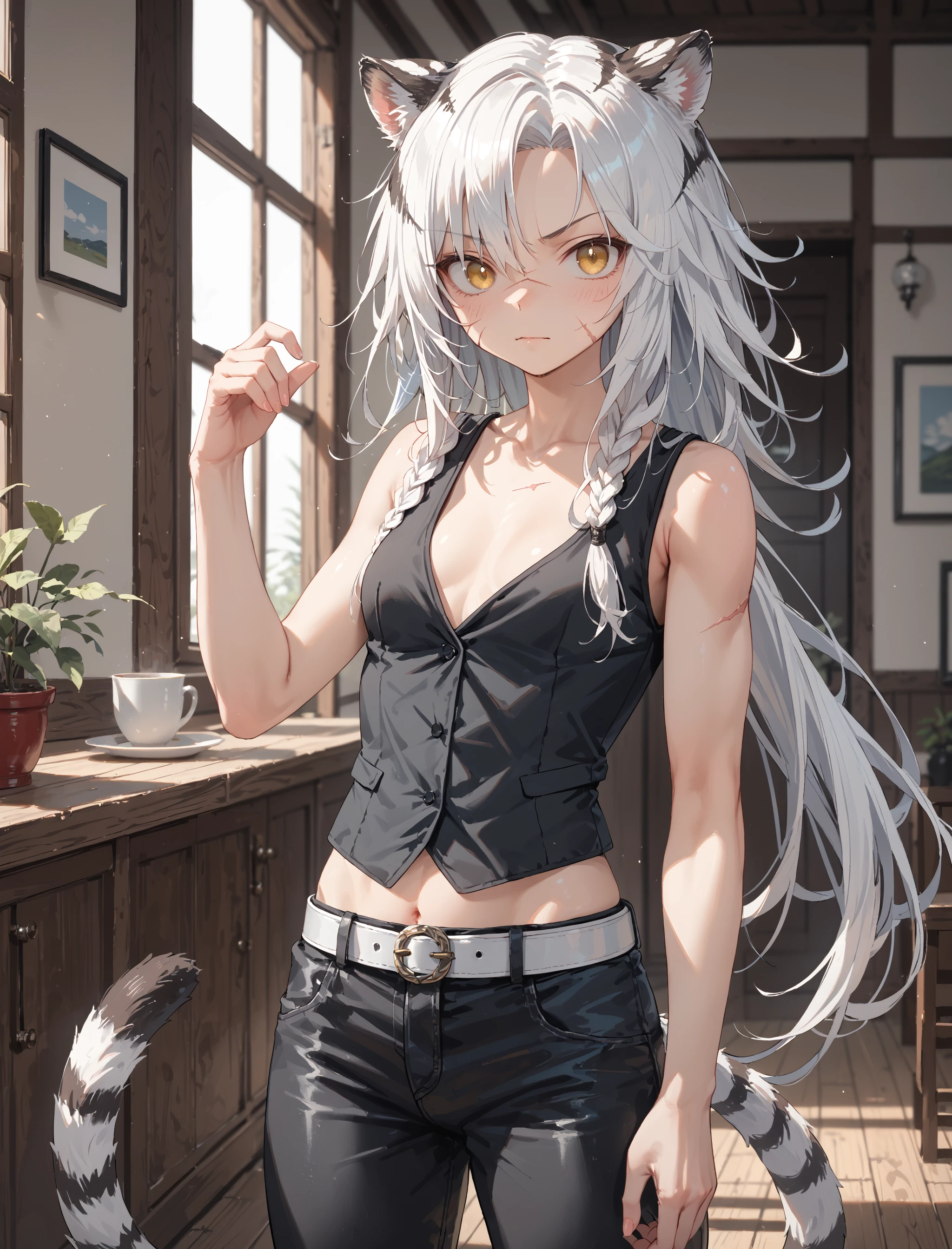 Indra, animal ears, tiger tail, long hair, white hair, hair between eyes, yellow eyes, scar on face