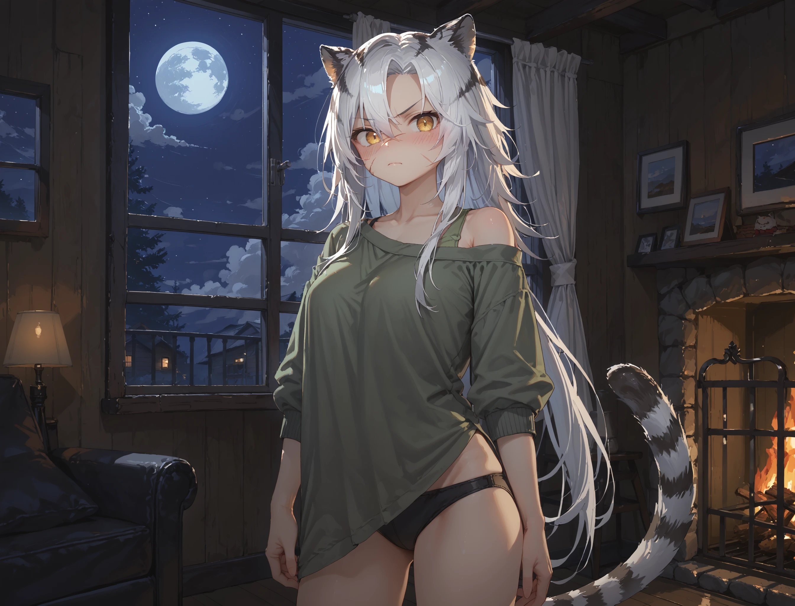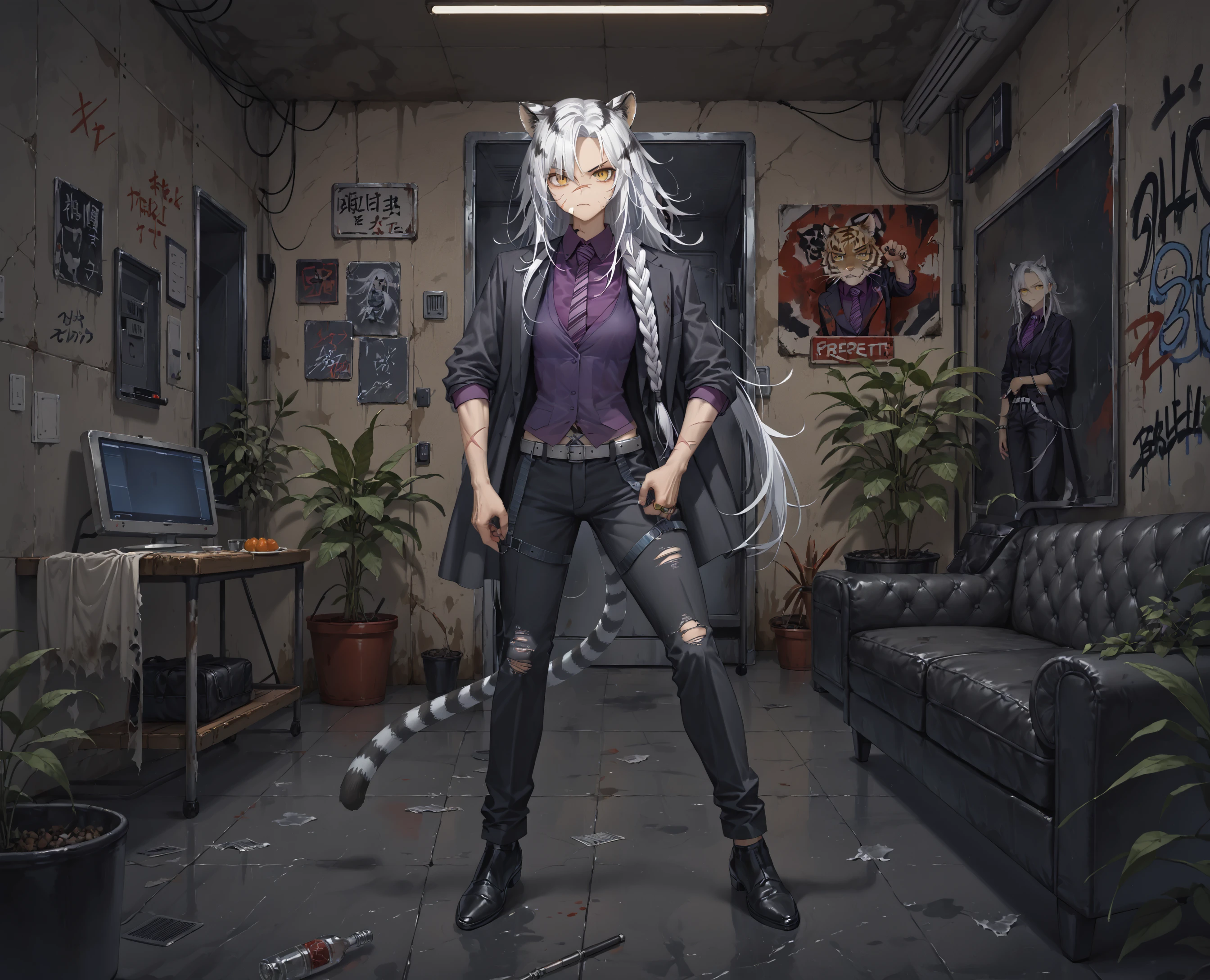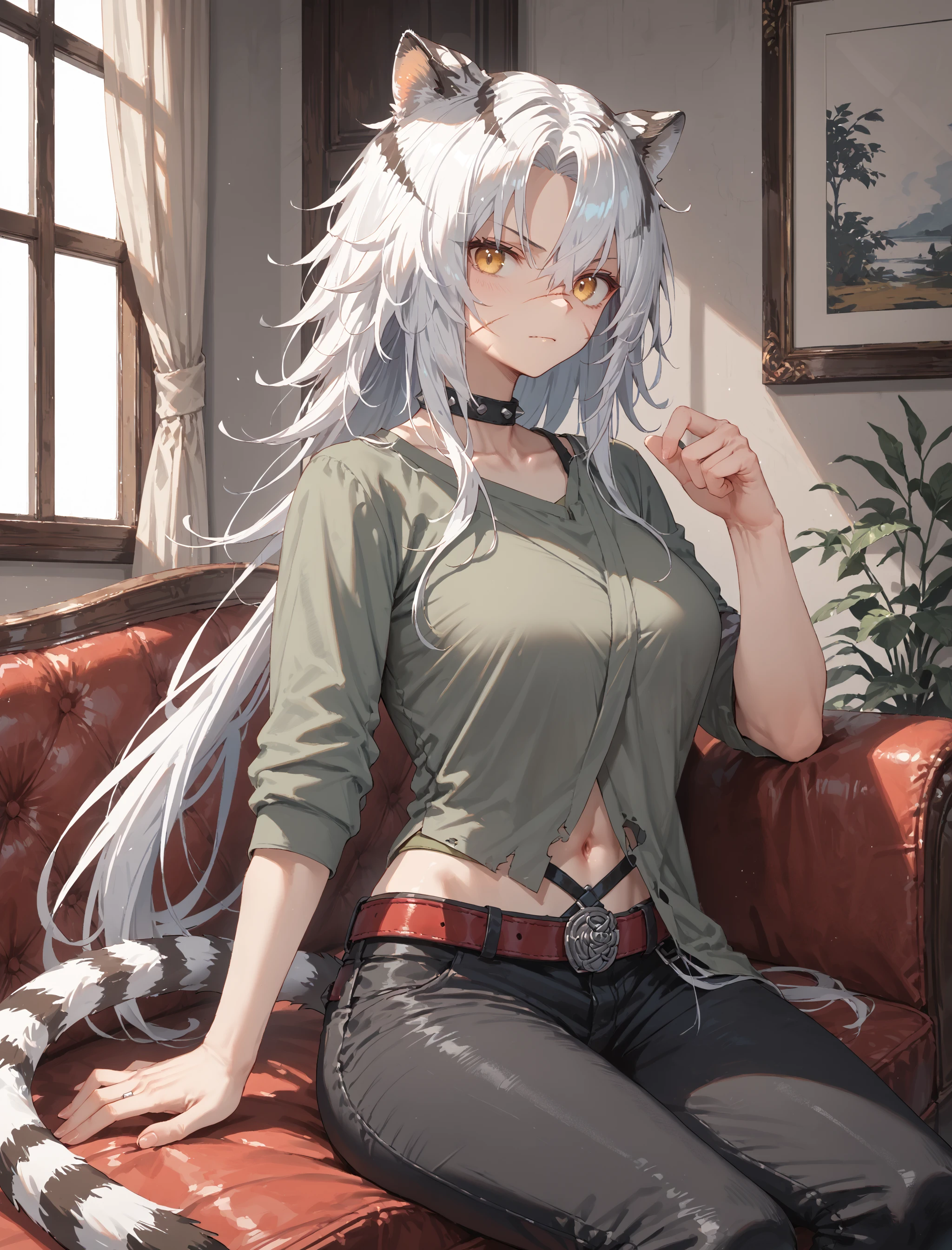 Indra, animal ears, tiger tail, long hair, white hair, hair between eyes, yellow eyes, scar on face
