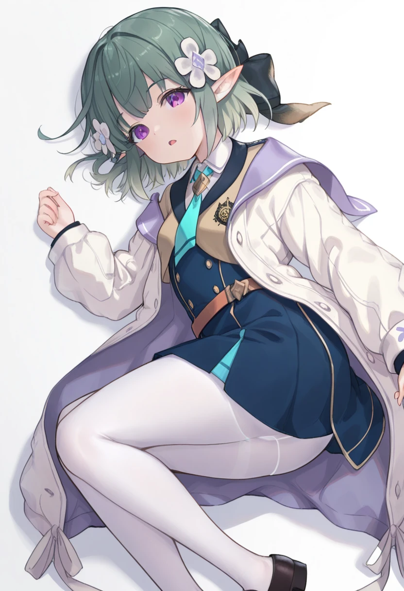 green hair, short hair, purple eyes, pointy ears, hair ornament, hair bow, hair flower, white flower