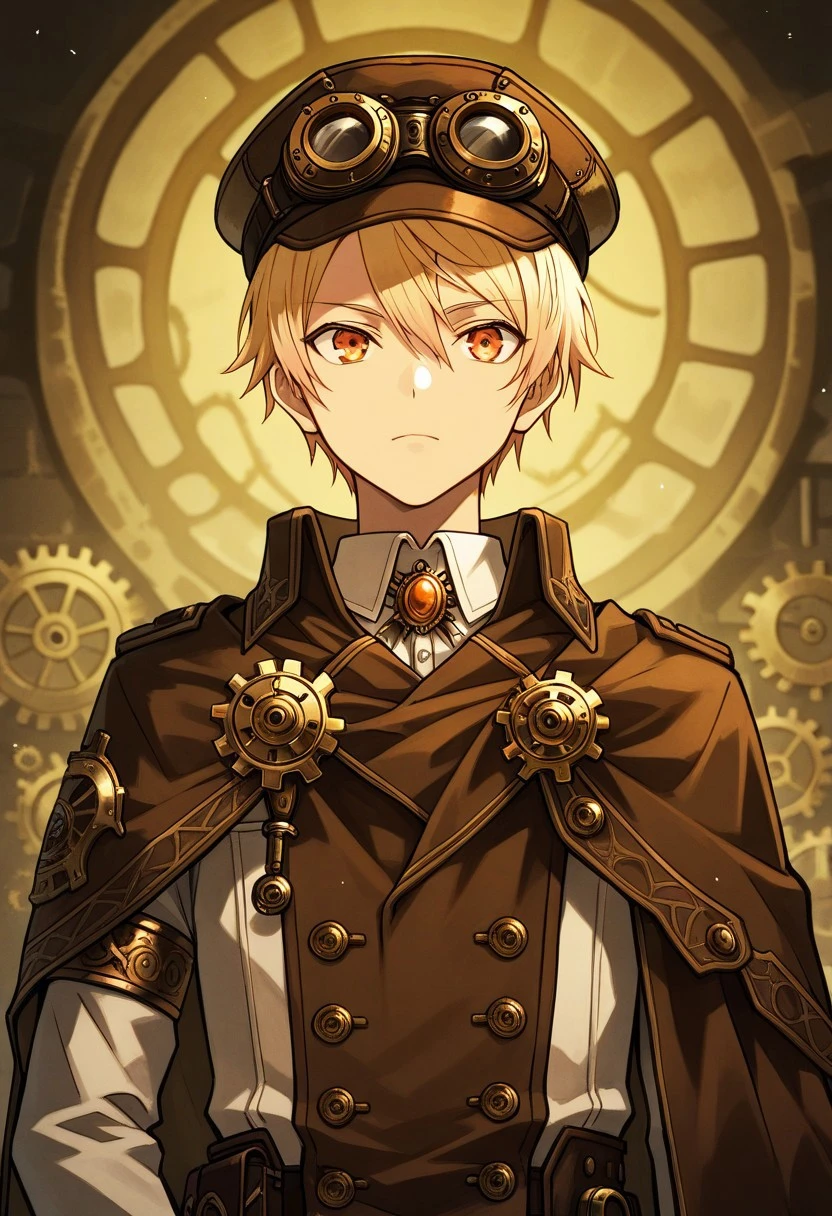1boy, male focus, solo, orange eyes, glasses, blonde hair, short hair, hair between eyes, bangs, steampunk, hat, goggles, goggles on headwear, shirt, white shirt, collared shirt, cape, brown cape, brooch, gears, buttons, gloves, black gloves, armlet,