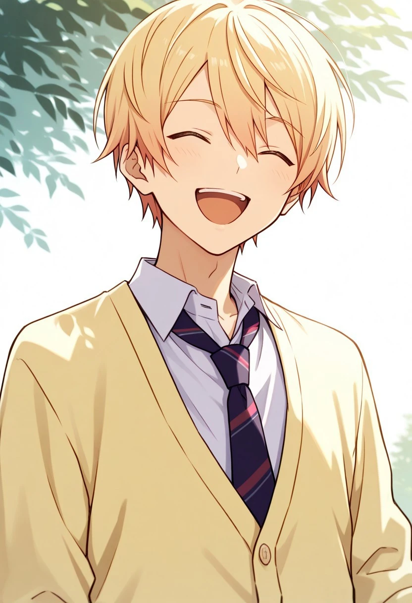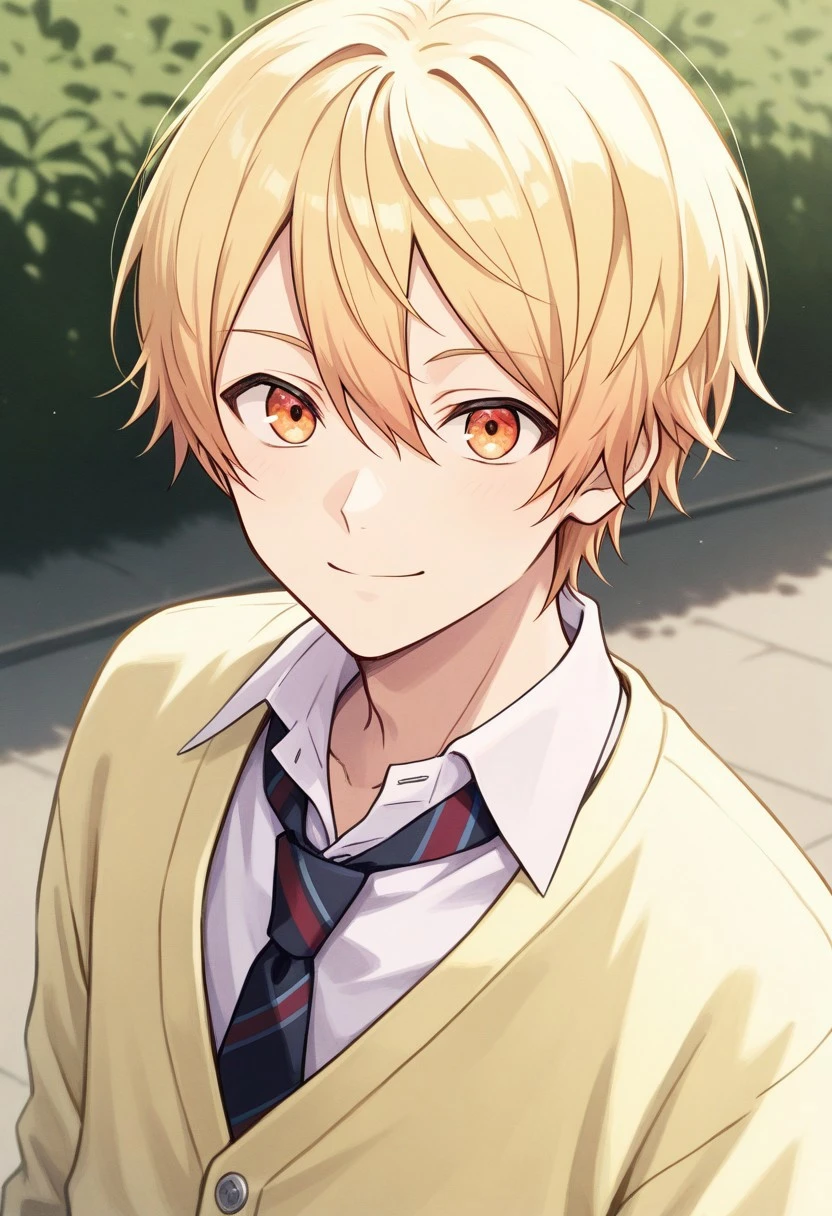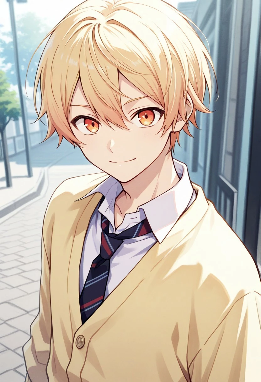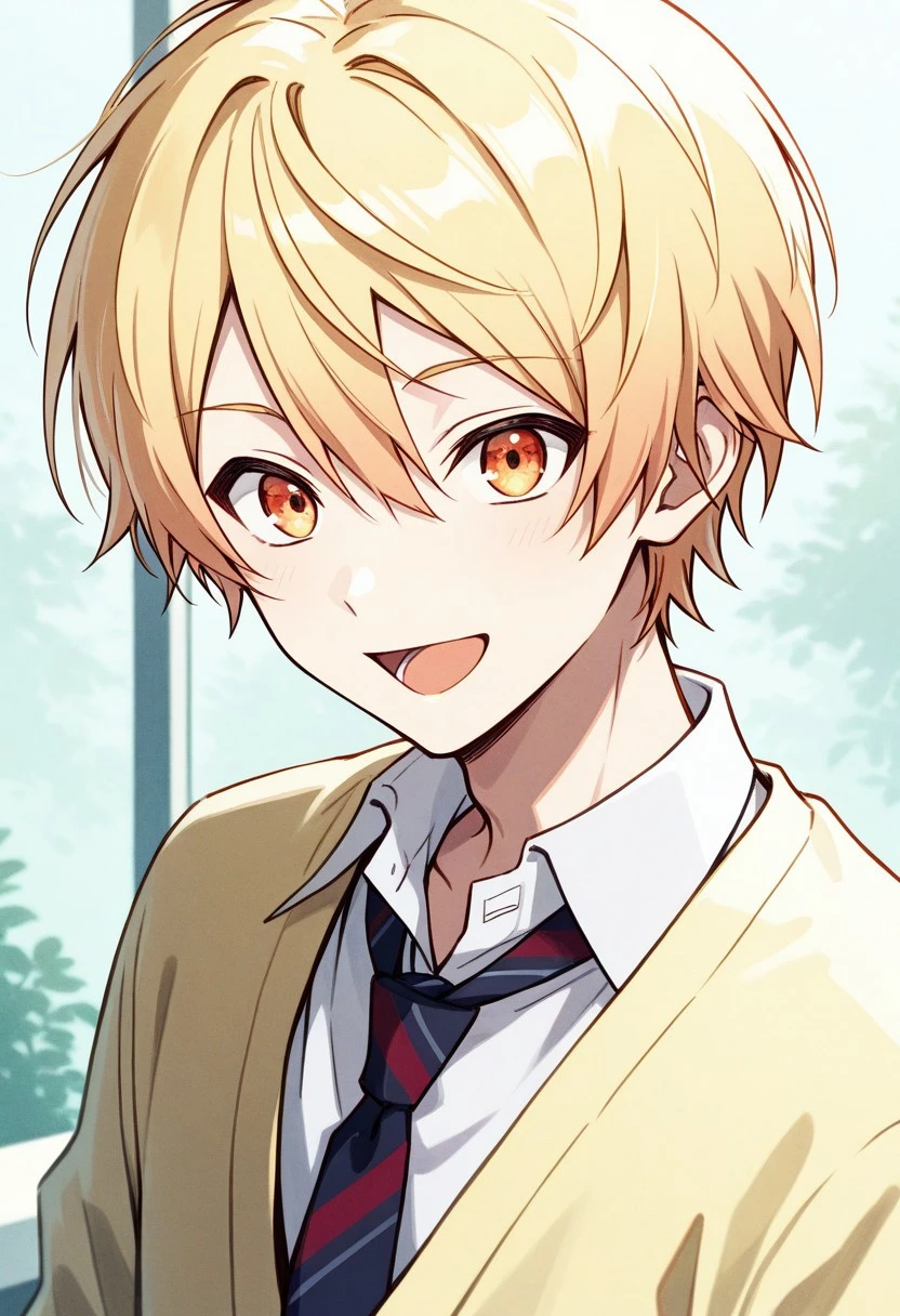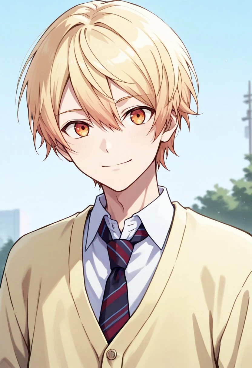 1boy, male focus, solo, orange eyes, blonde hair, short hair, hair between eyes, bangs, shirt, white shirt, collared shirt, necktie, striped, striped necktie, cardigan, yellow cardigan, long sleeves,