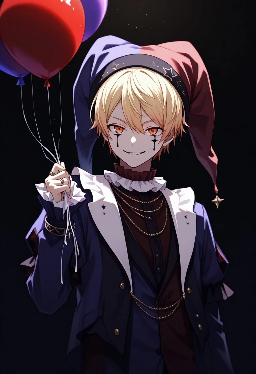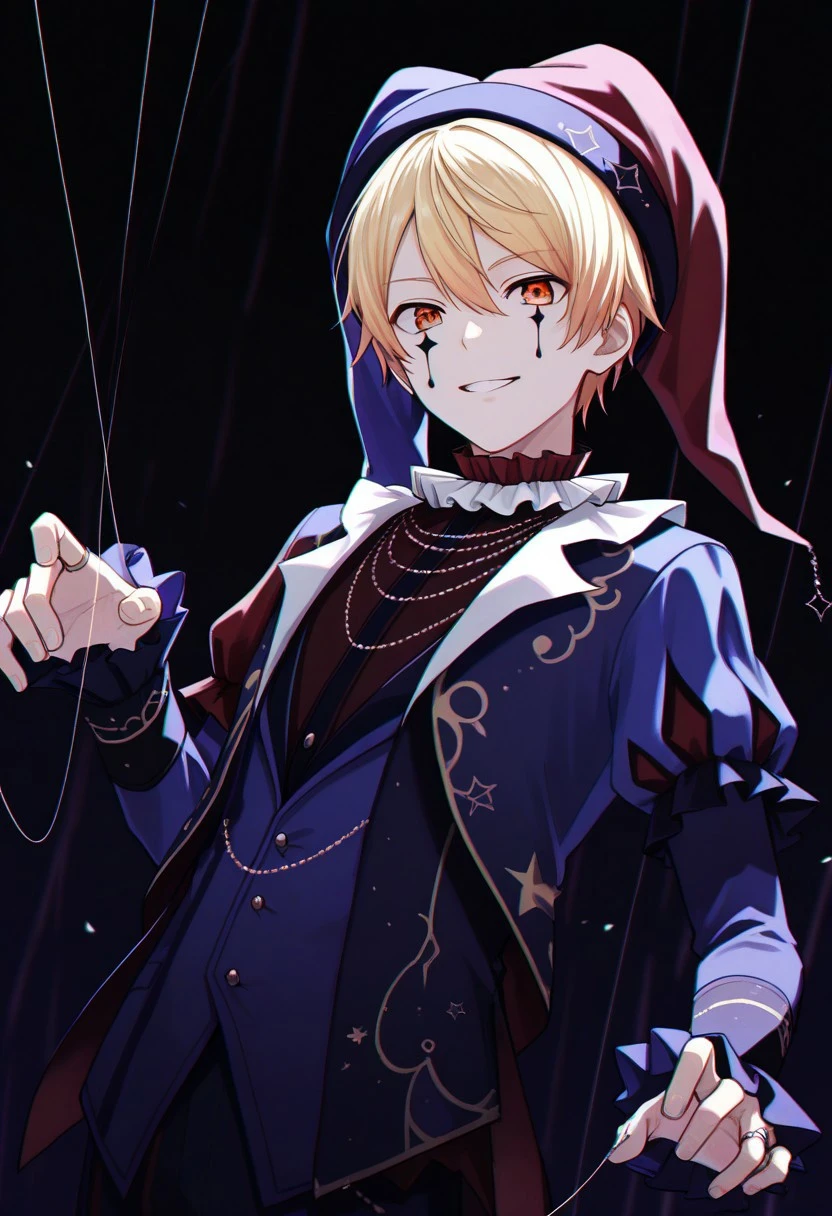 1boy, male focus, solo, orange eyes, blonde hair, short hair, hair between eyes, bangs, facial mark, star (symbol), hat, jester cap, neck ruff, jewelry, string, pupper string, ring, long sleeves, sleeves past wrists, jacket, blue jacket, shirt, red shirt, open jacket, open clothes, frilled sleeves,