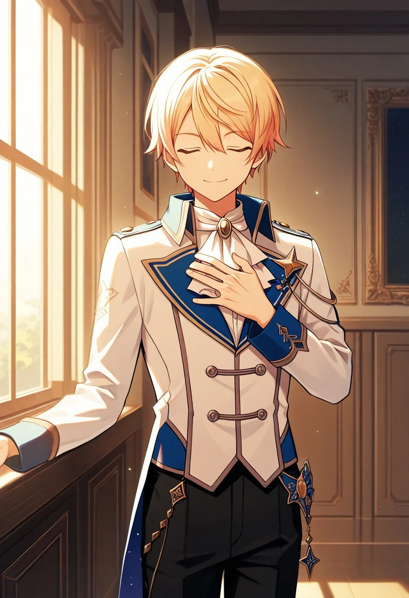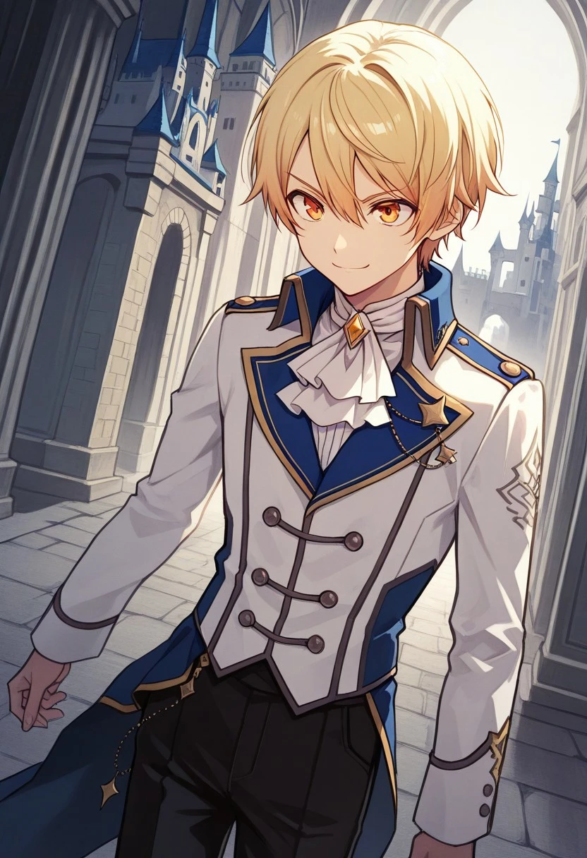 1boy, male focus, solo, orange eyes, blonde hair, short hair, hair between eyes, bangs, ascot, white ascot, shirt, white shirt, jacket, white jacket, double-breasted, long sleeves, pants, black pants, boots, white footwear, star (symbol),