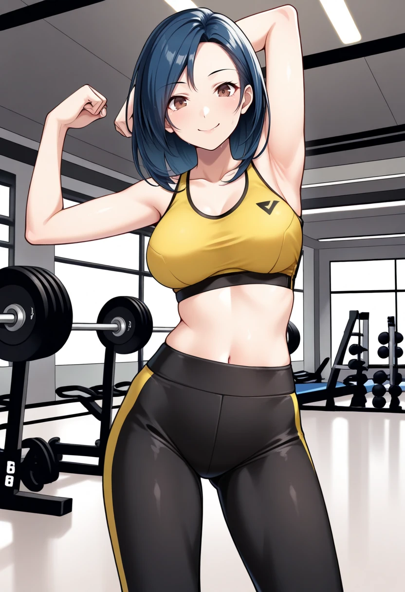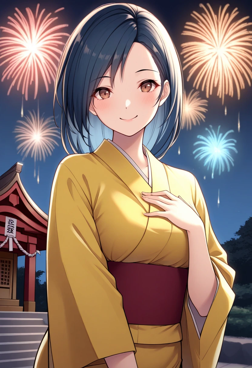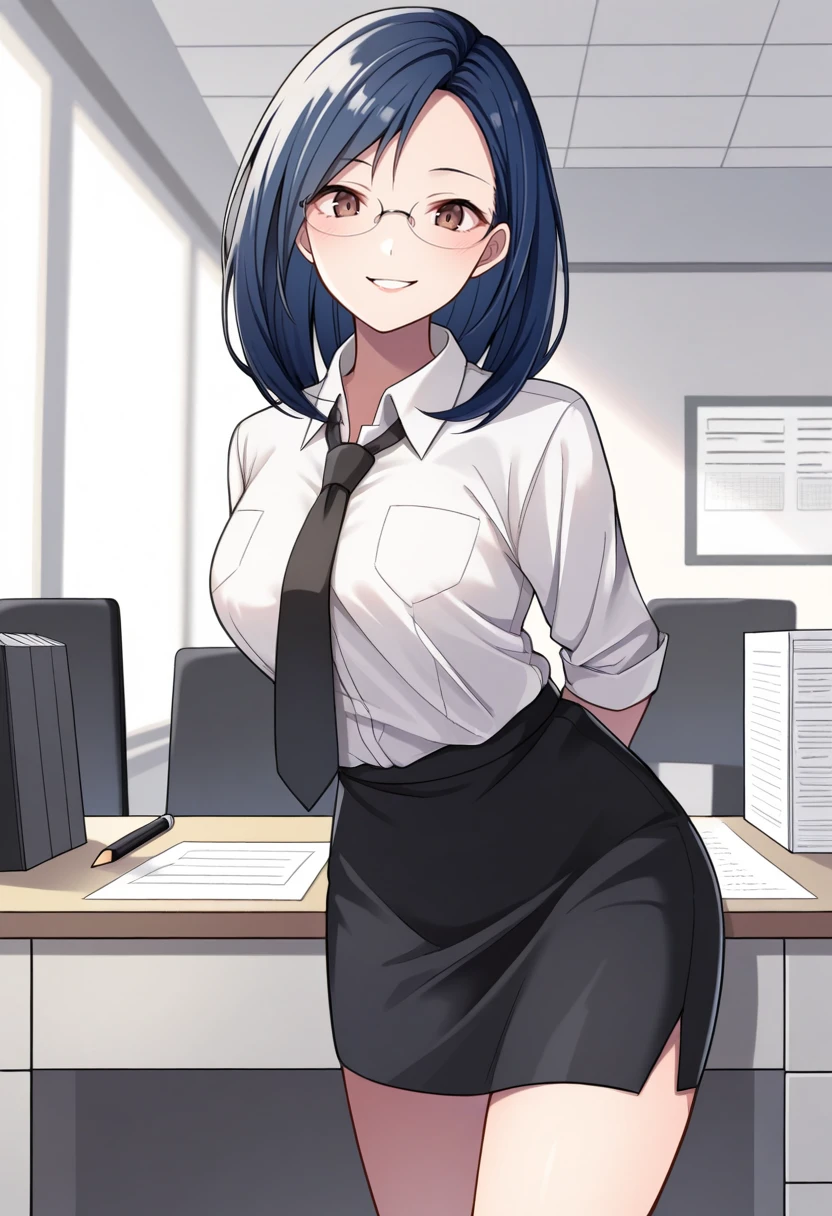 tkmp1, blue hair, medium hair, black eyes, jacket on shoulders, shirt, pencil skirt, yellow skirt, pantyhose, mature woman:1.2