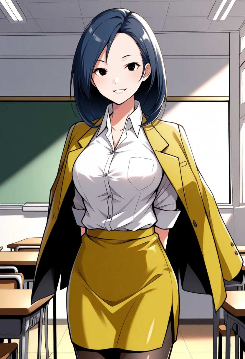 Tags: tkmp1, blue hair, medium hair, black eyes, jacket on shoulders, shirt, pencil skirt, yellow skirt, pantyhose, mature woman:1.2