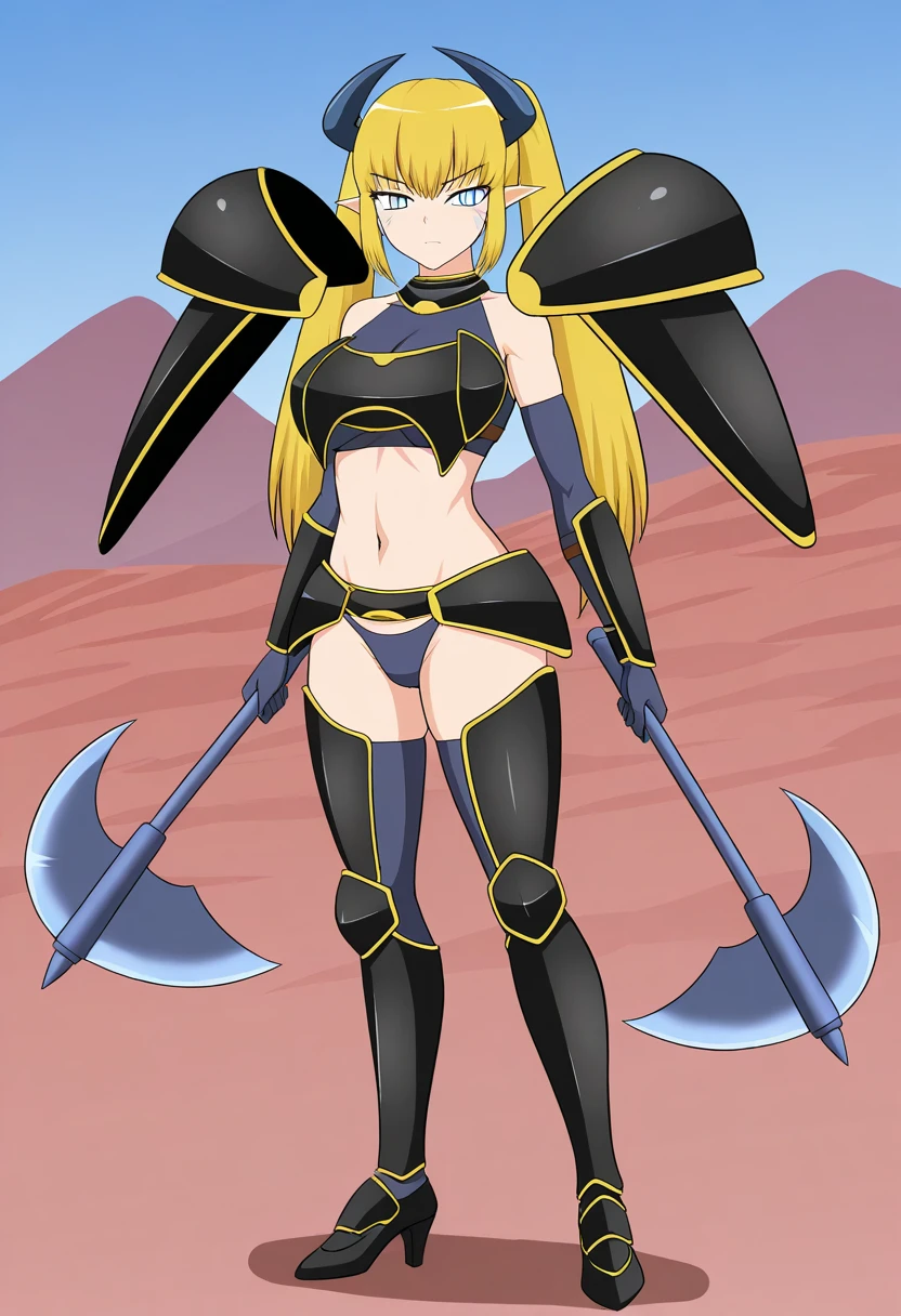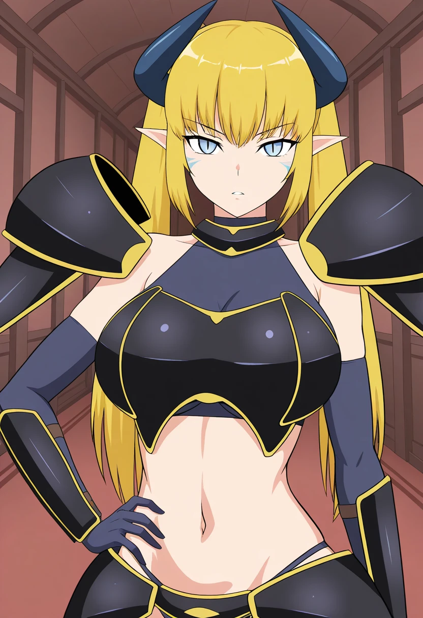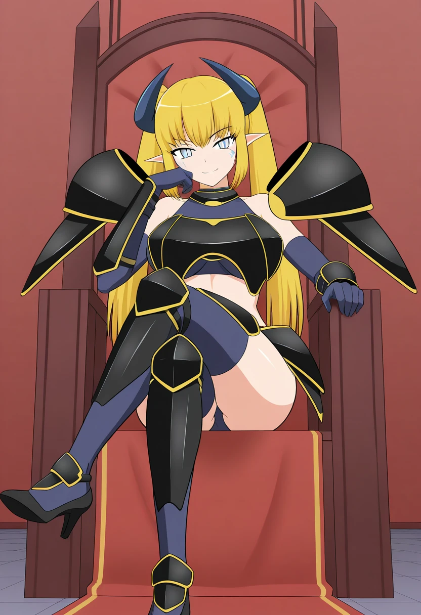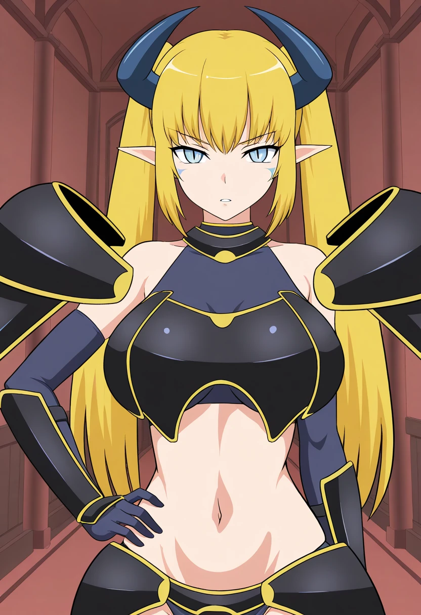 Keywords: rennaschodaimaojskilus, blonde hair, twintails, long hair, light blue eyes, slit pupils, facial mark, pointy ears, horns, demon girl, , crop top, bottom, armor, floating armor, gorget, breastplate, elbow gloves, arm guards, faulds, thighhighs, cuisses, knee guards, shoes, high heels,