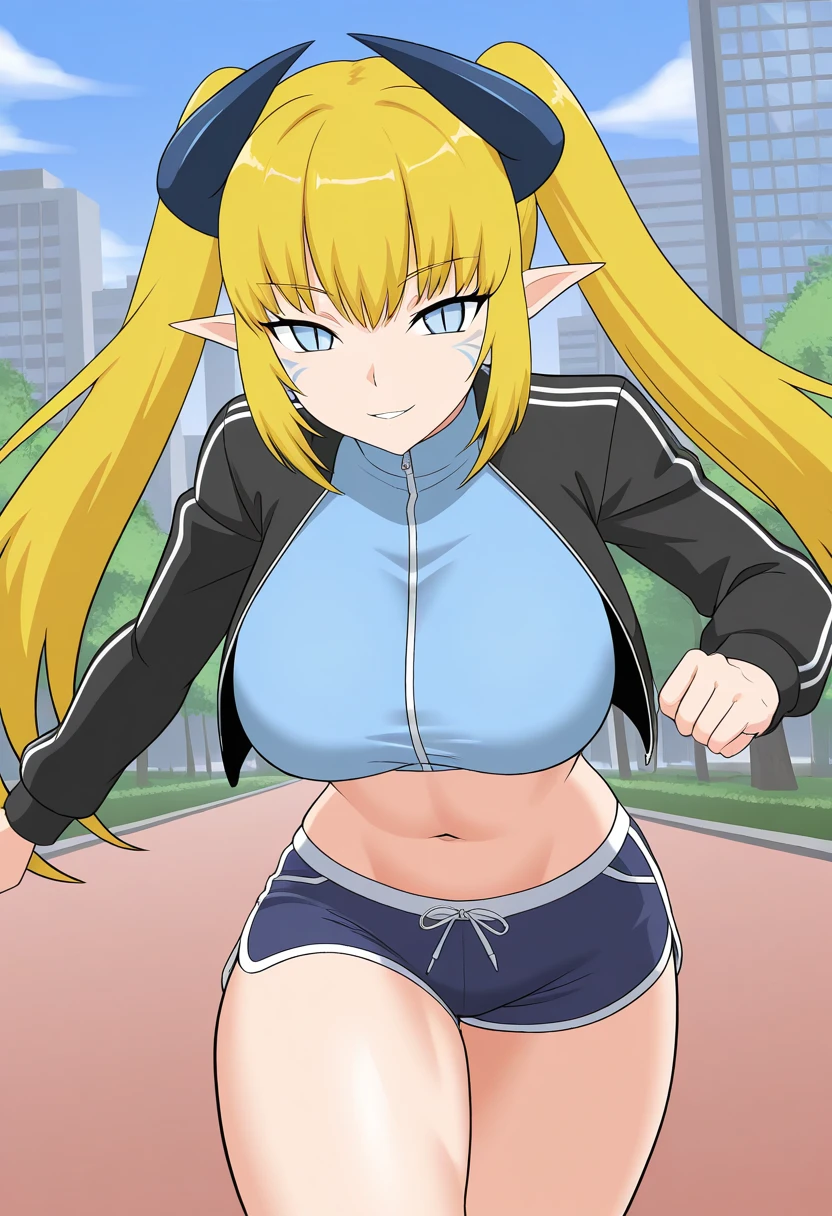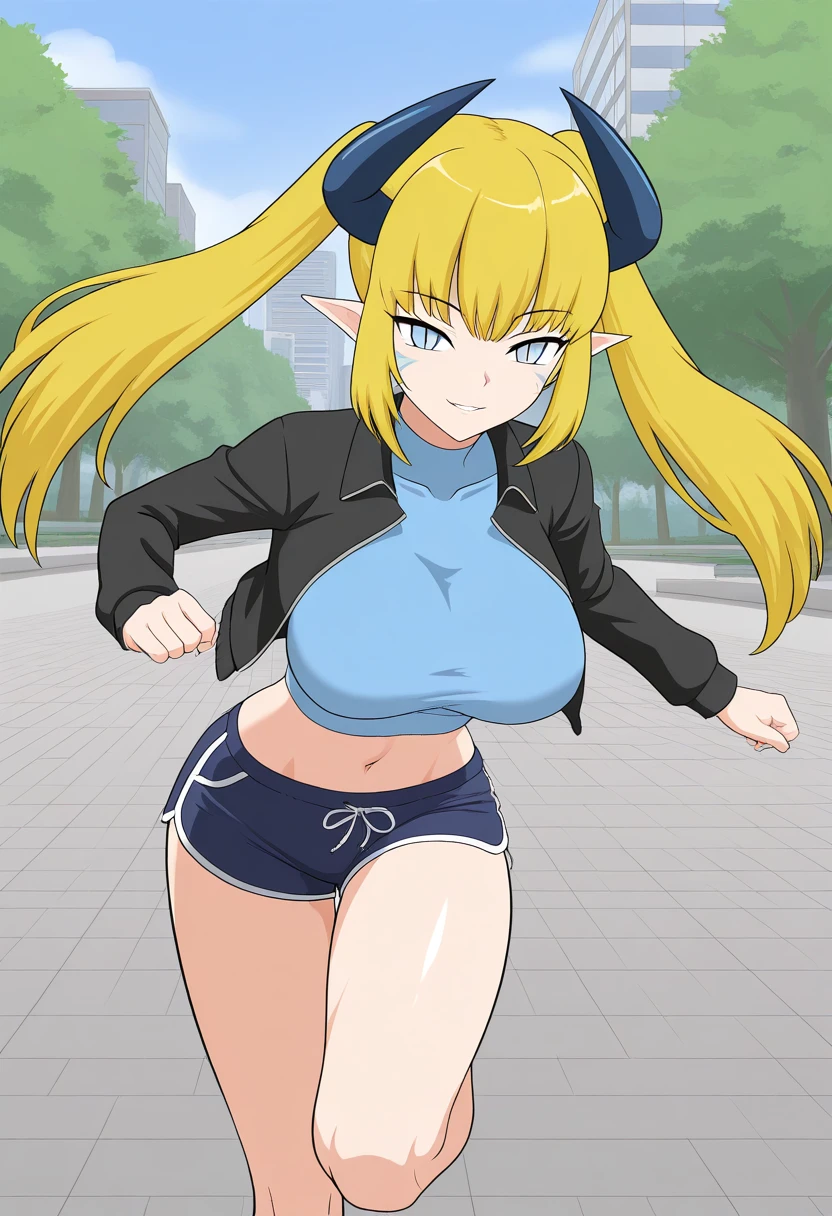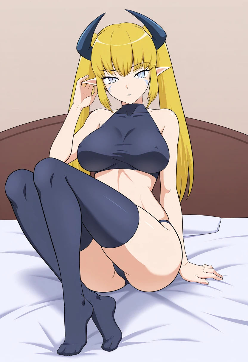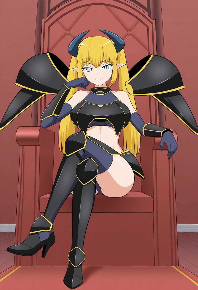 Keywords: rennaschodaimaojskilus, blonde hair, twintails, long hair, light blue eyes, slit pupils, facial mark, pointy ears, horns, demon girl, , crop top, bottom, armor, floating armor, gorget, breastplate, elbow gloves, arm guards, faulds, thighhighs, cuisses, knee guards, shoes, high heels,