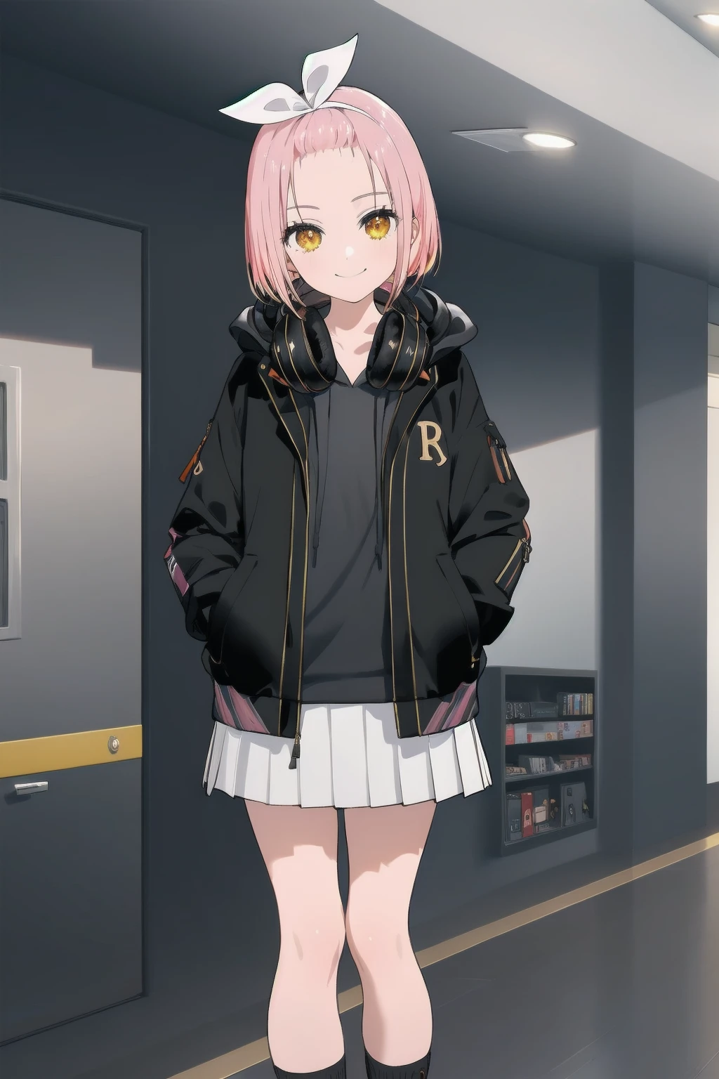 peaky p-key: peaky p-key, 1girl, headphones around neck, solo,bangs pinned back, hood, smile, white skirt, pink hair, miniskirt, shirt, yellow eyes, short hair, bow hairband,black jacket, socks, sneakers,hoodie