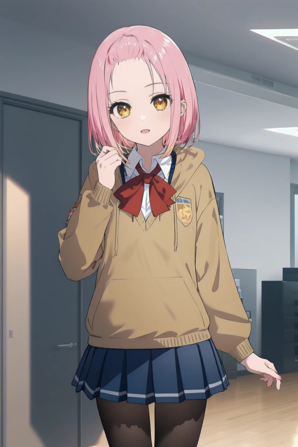 school uniform: 1girl, solo,pink hair,white shirt, red bowtie, looking at viewer, miniskirt,school uniform, black pantyhose, short hair,blue skirt, cowboy shot, yellow eyes, hoodie, collared shirt, bangs pinner back