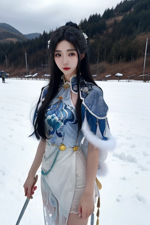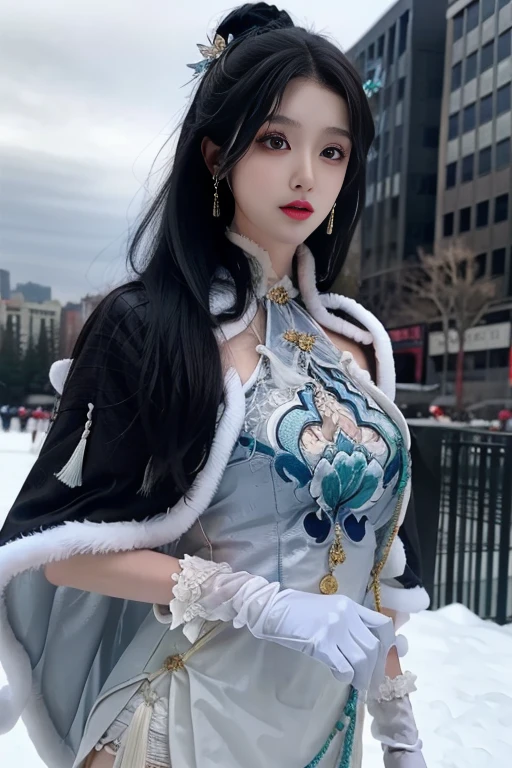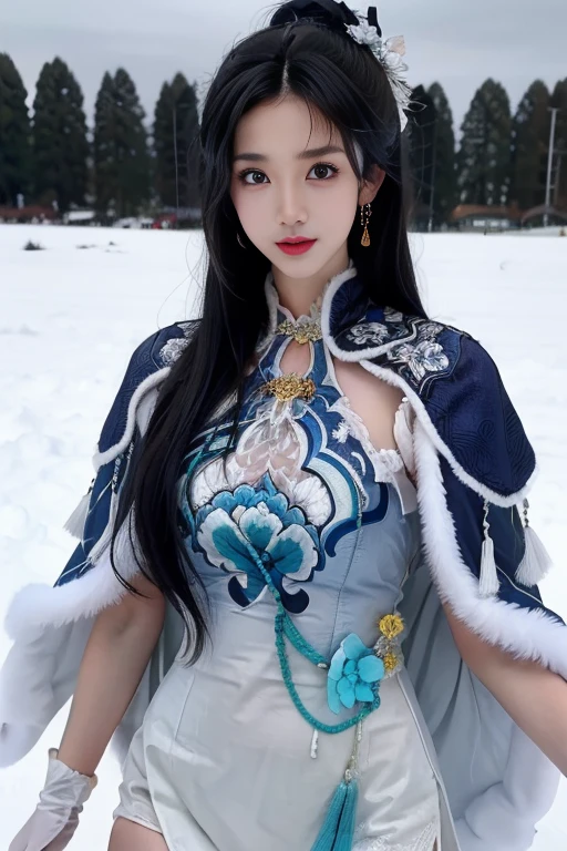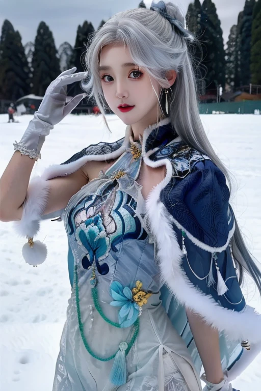 chinese clothes, china theme, blue dress,white lace trimgloves, fur trim, side slit, cape, shawl,