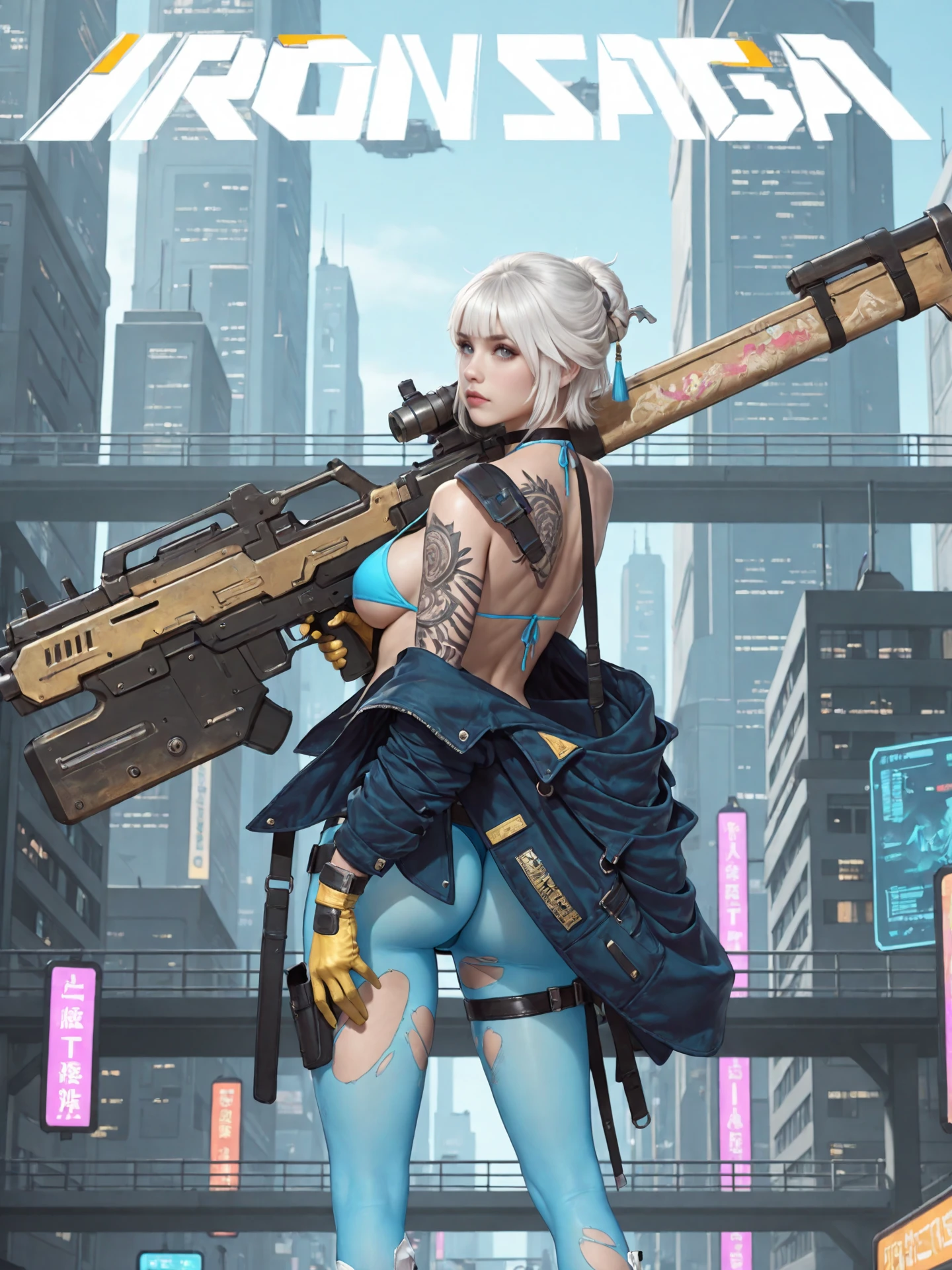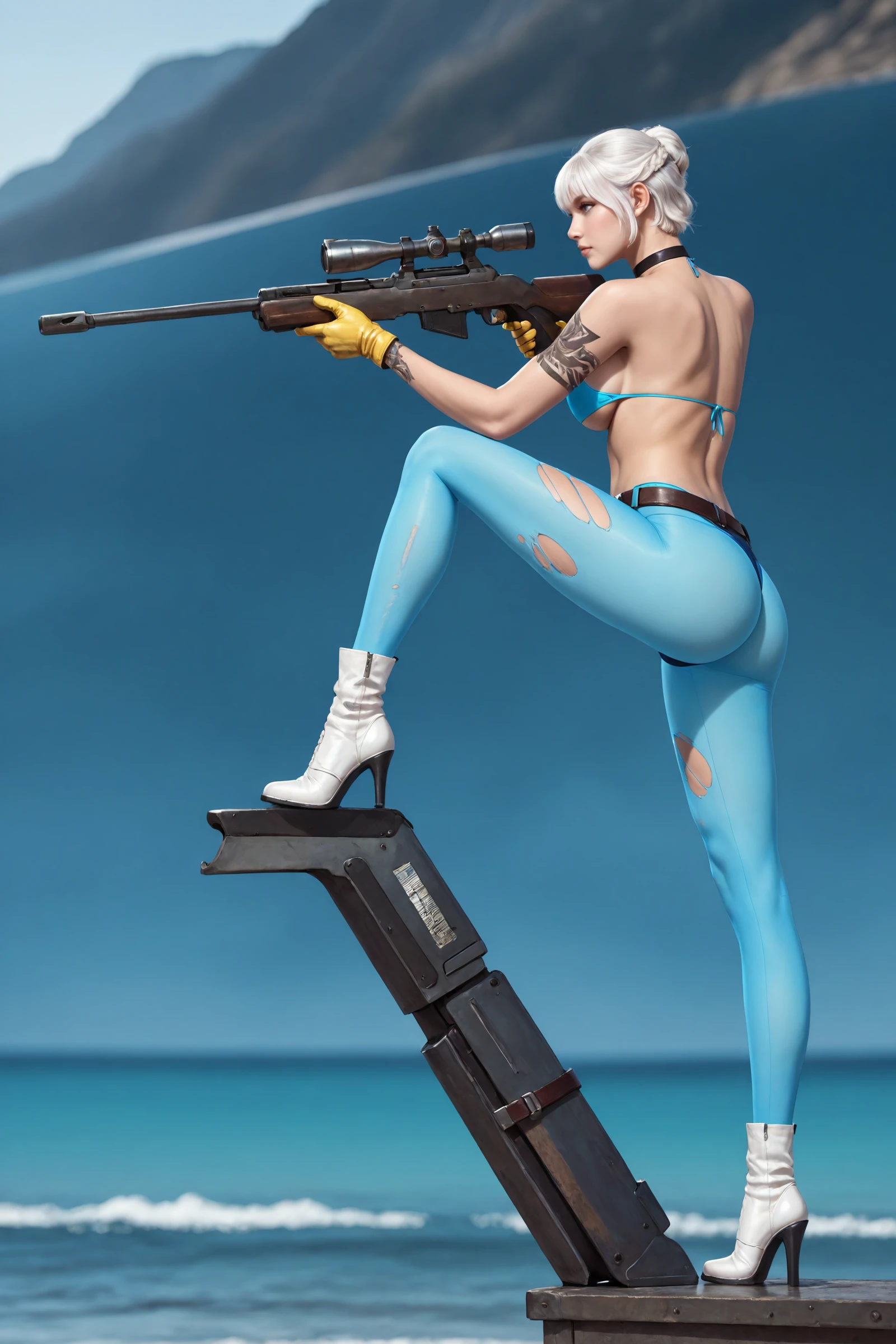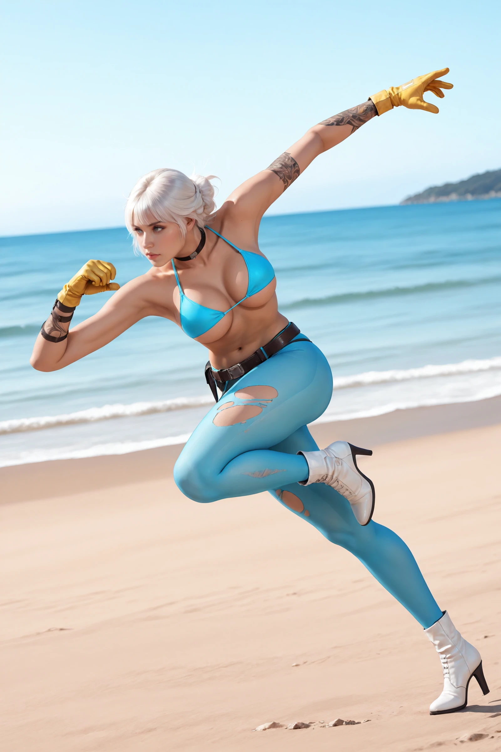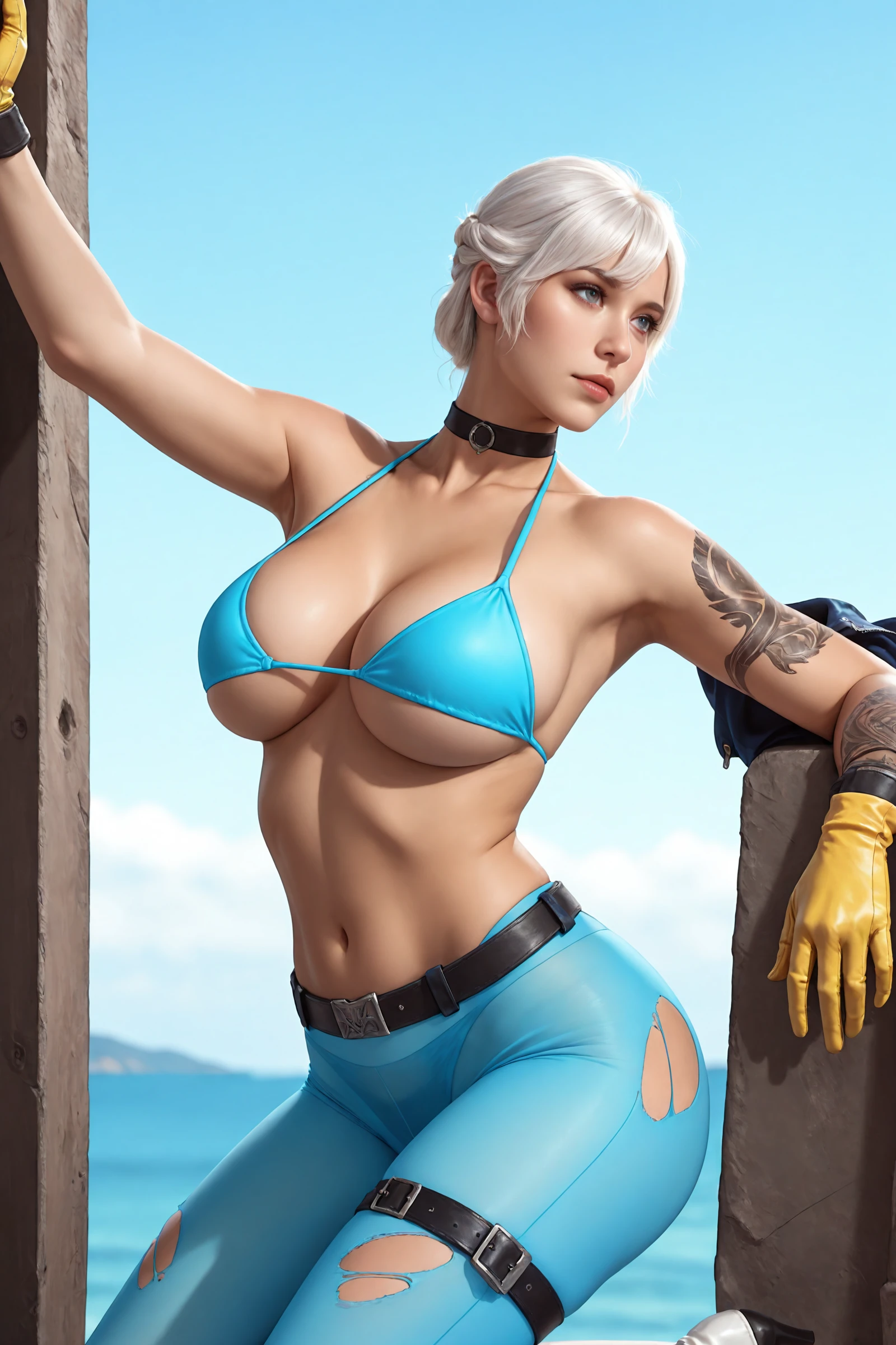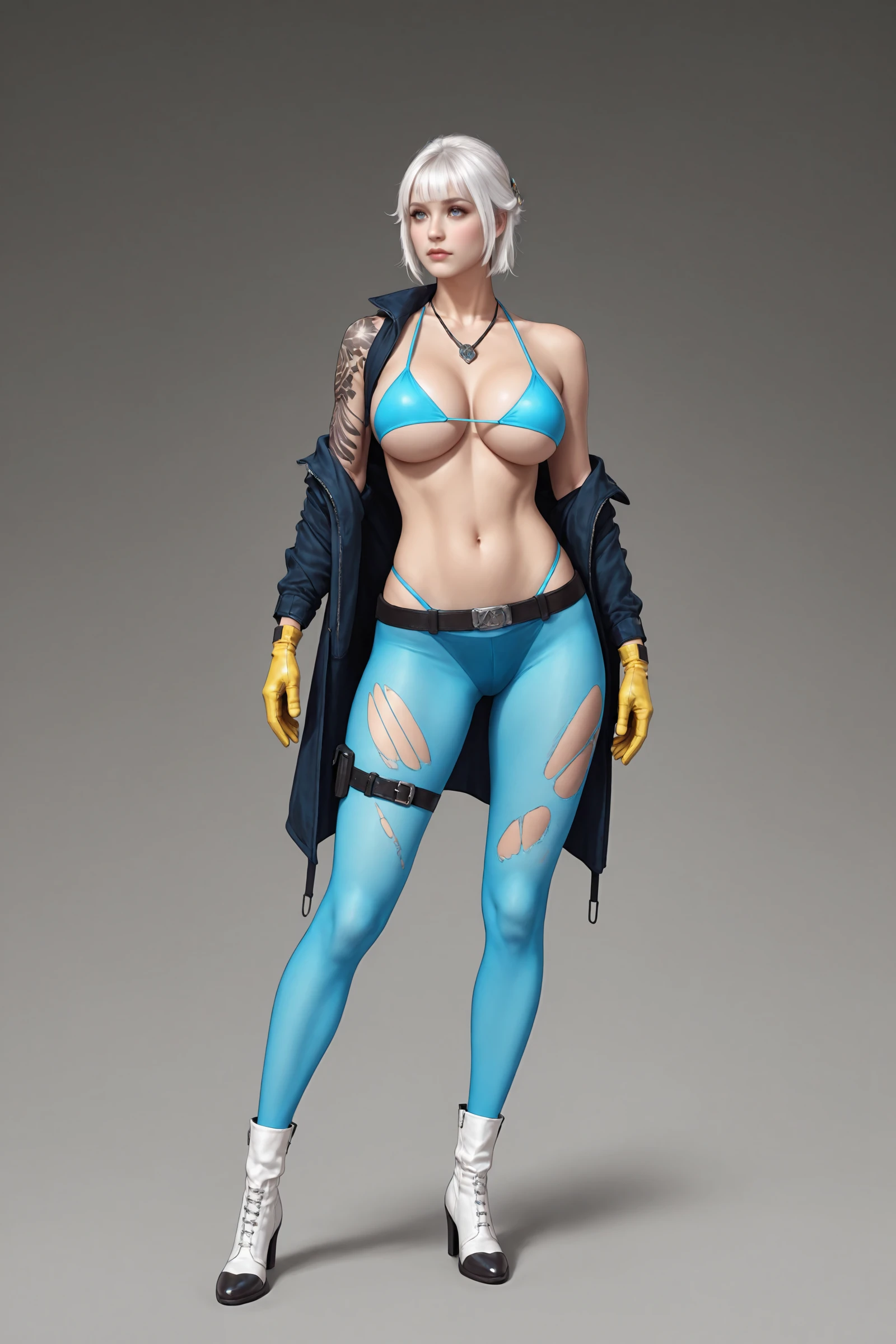 short_hair,white_hair,bangs,choker, large_breasts,navel,torn_clothes,bare_shoulders,open_shirt,underboob,arm_tattoo, jacket,blue_bikini,yellow gloves,thong,thigh_belt,blue pantyhose, white_footwear,ankle_boots,high_heels,