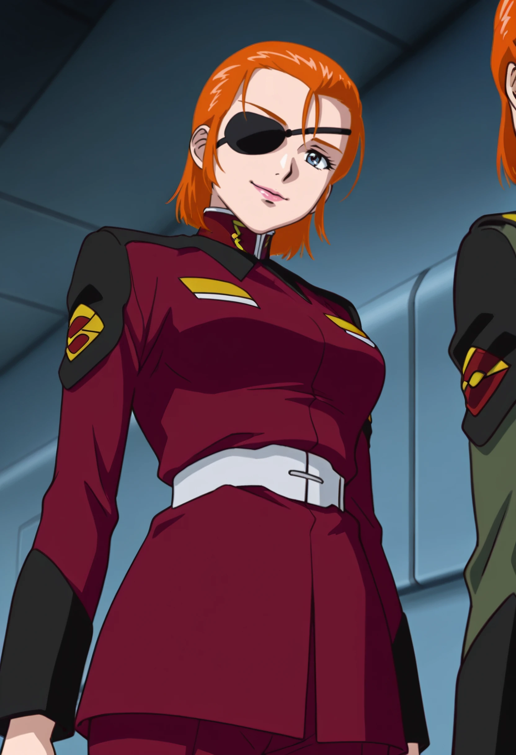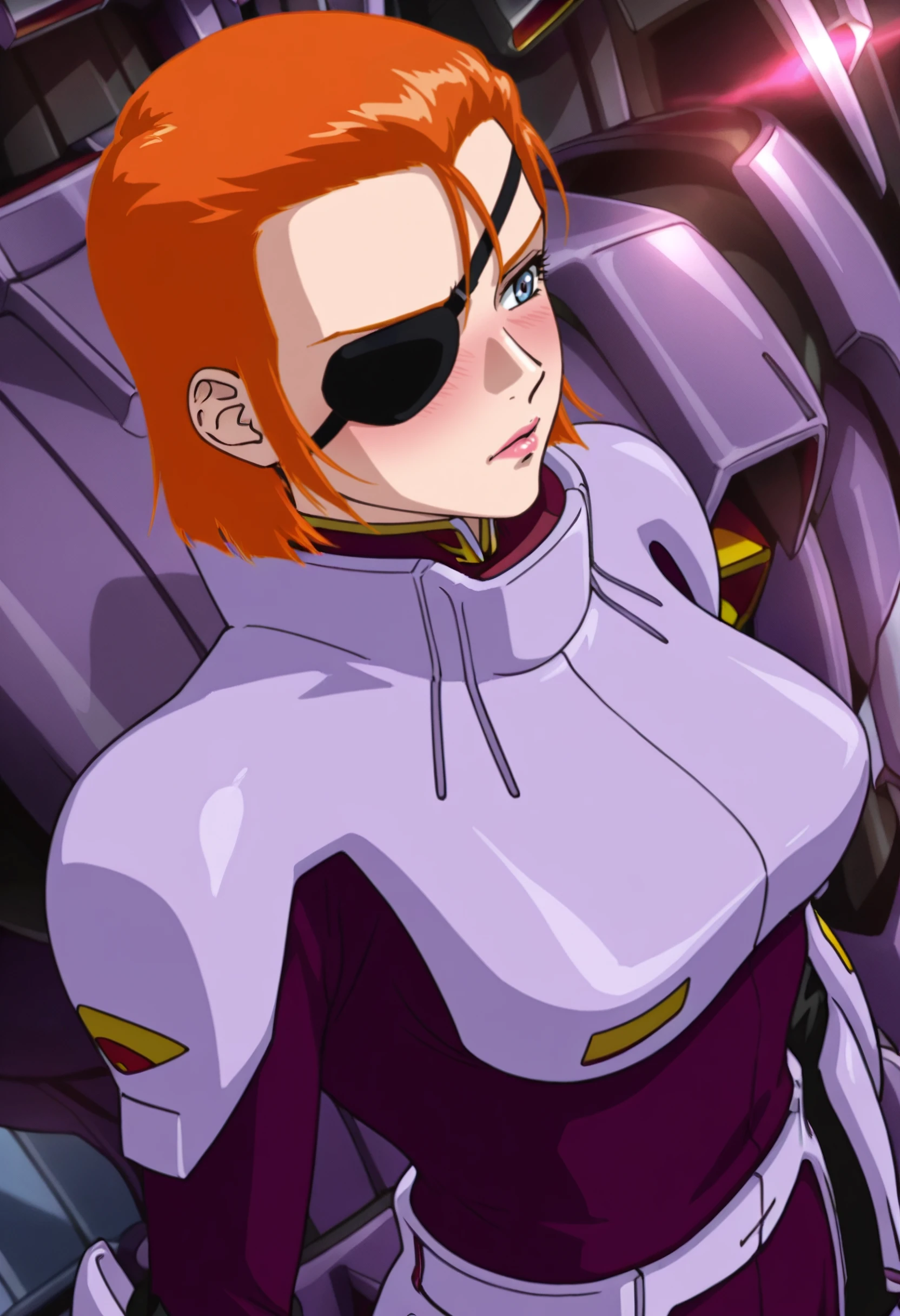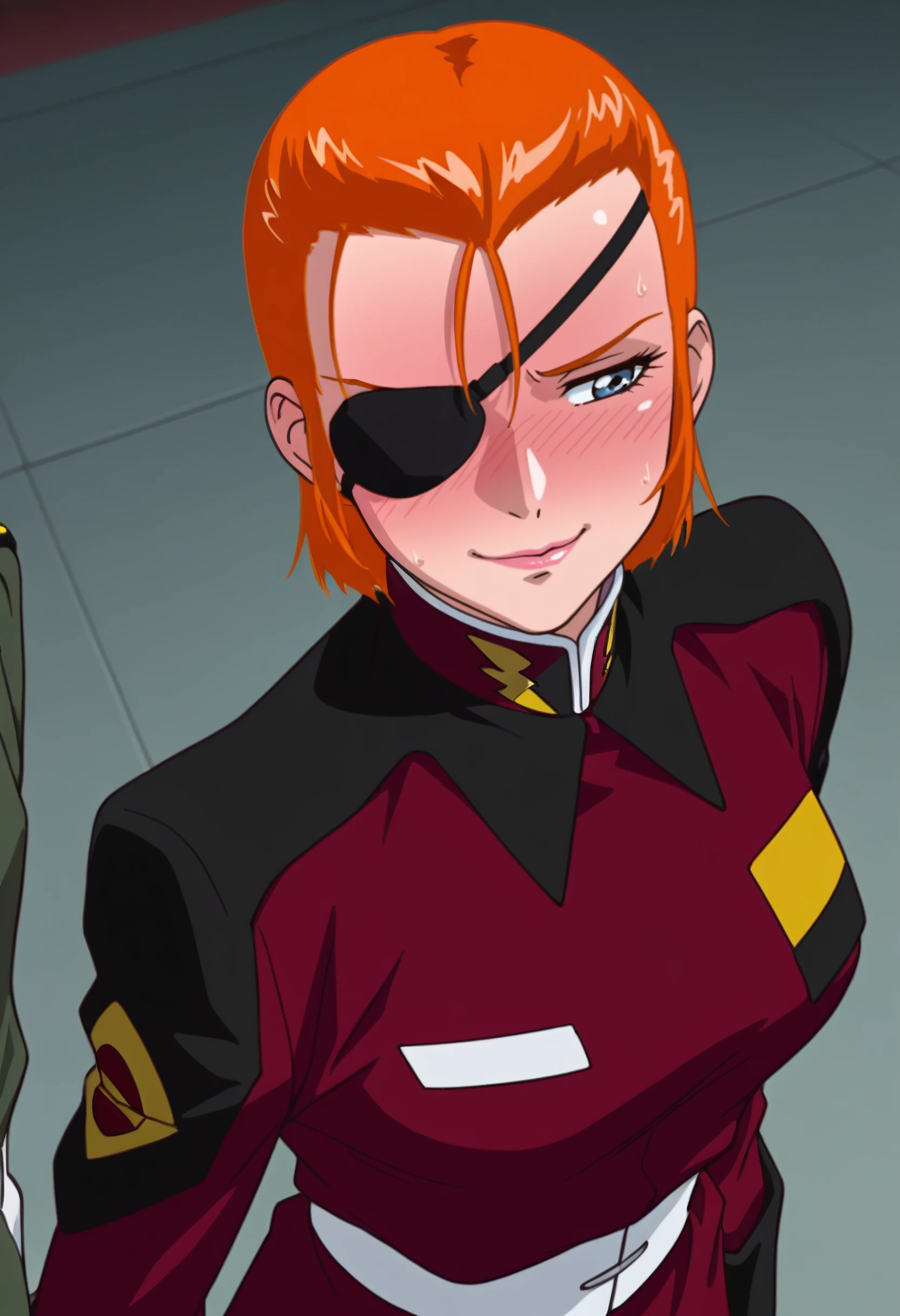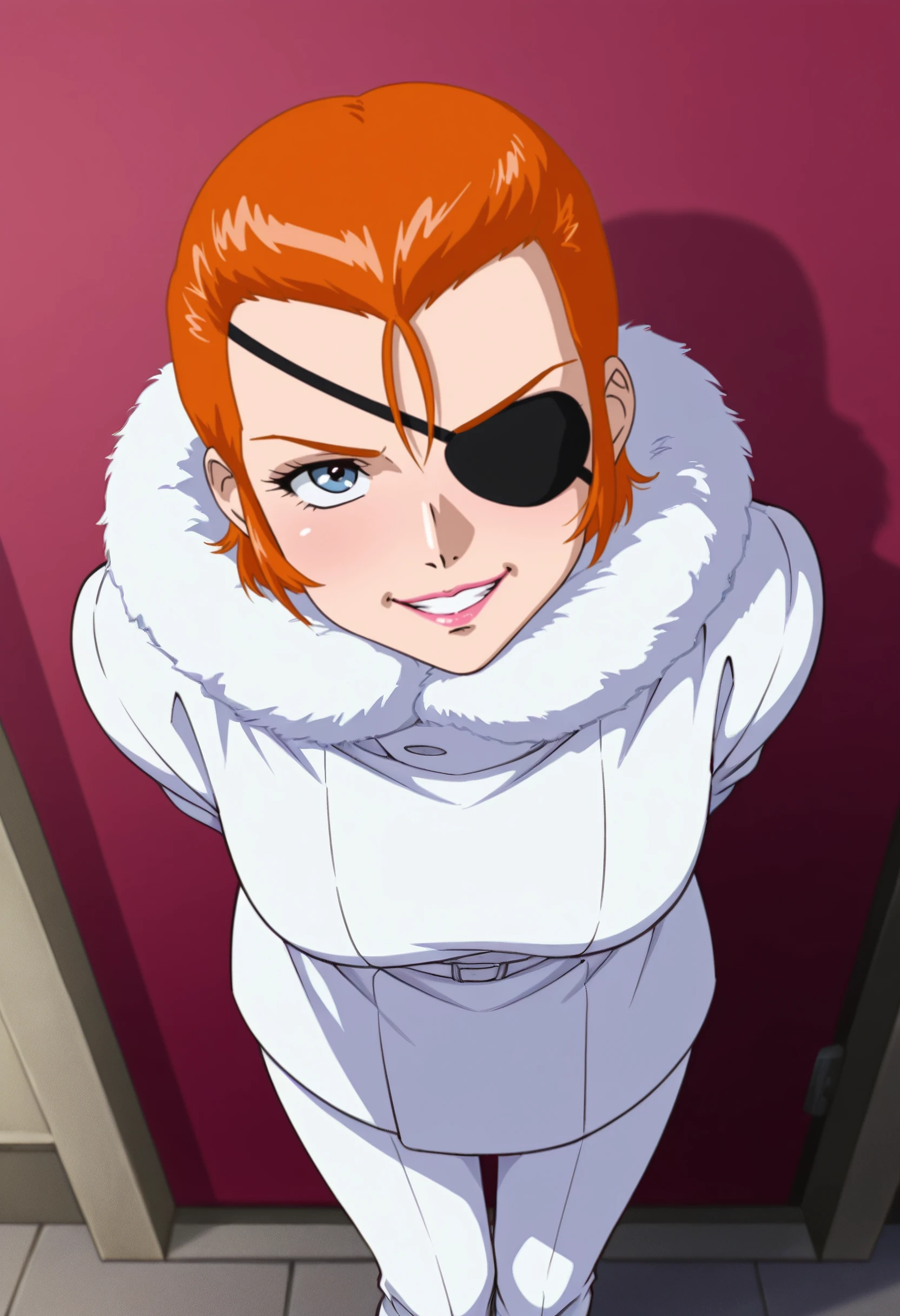 GSDHilda, orange hair, lipstick, blue eyes, pink lips, short hair, eyepatch, one eye covered,