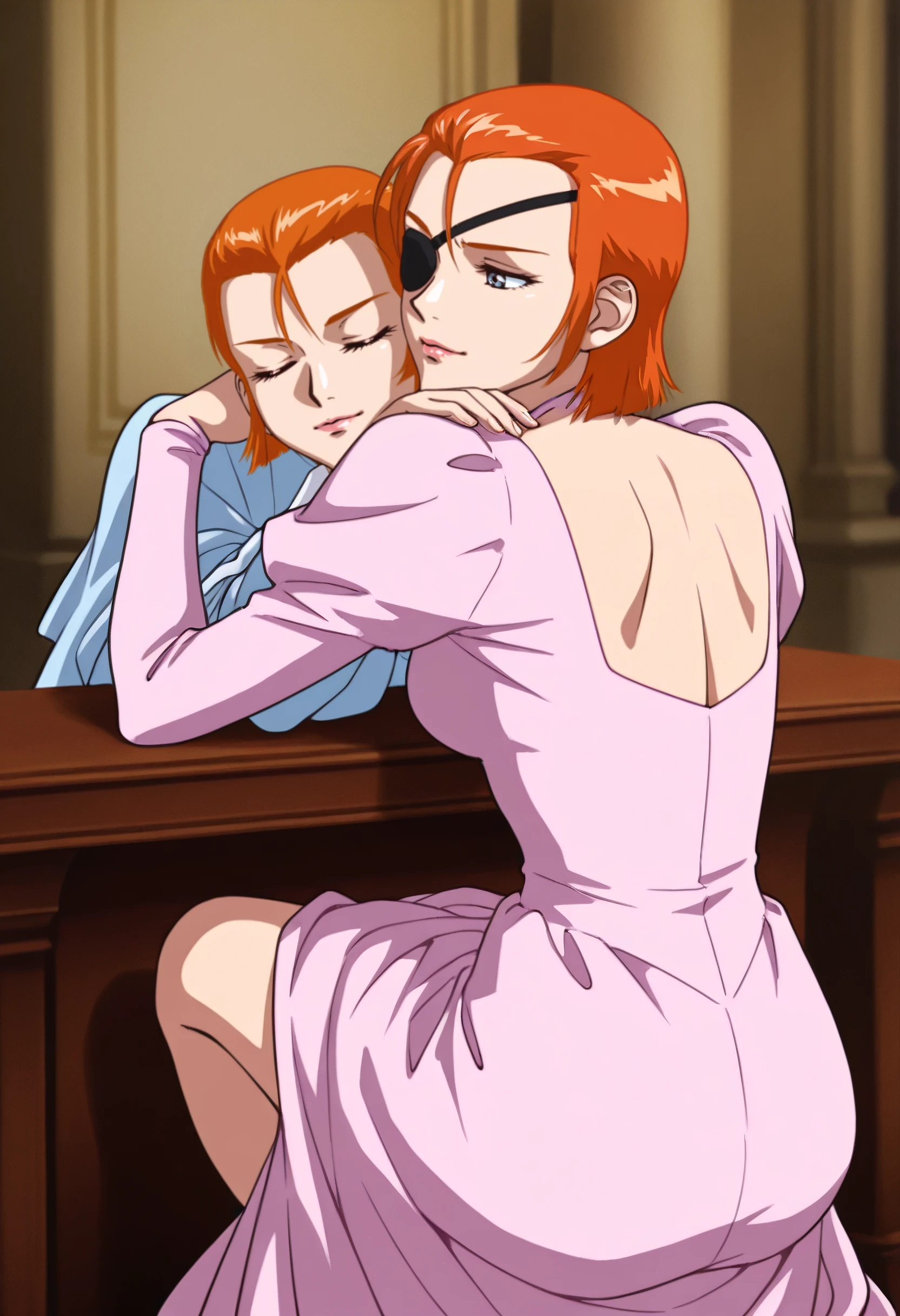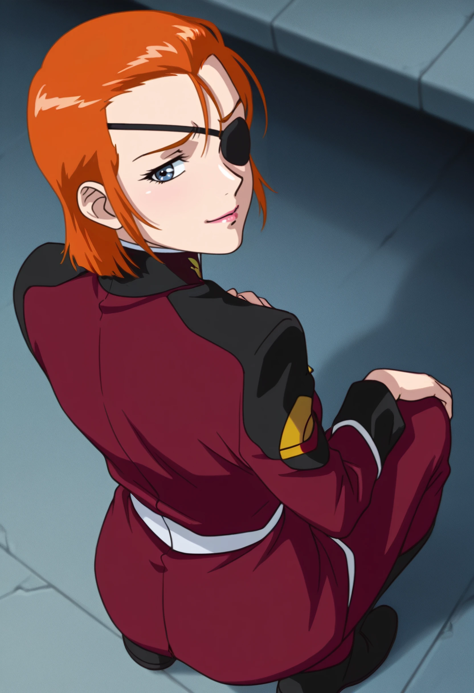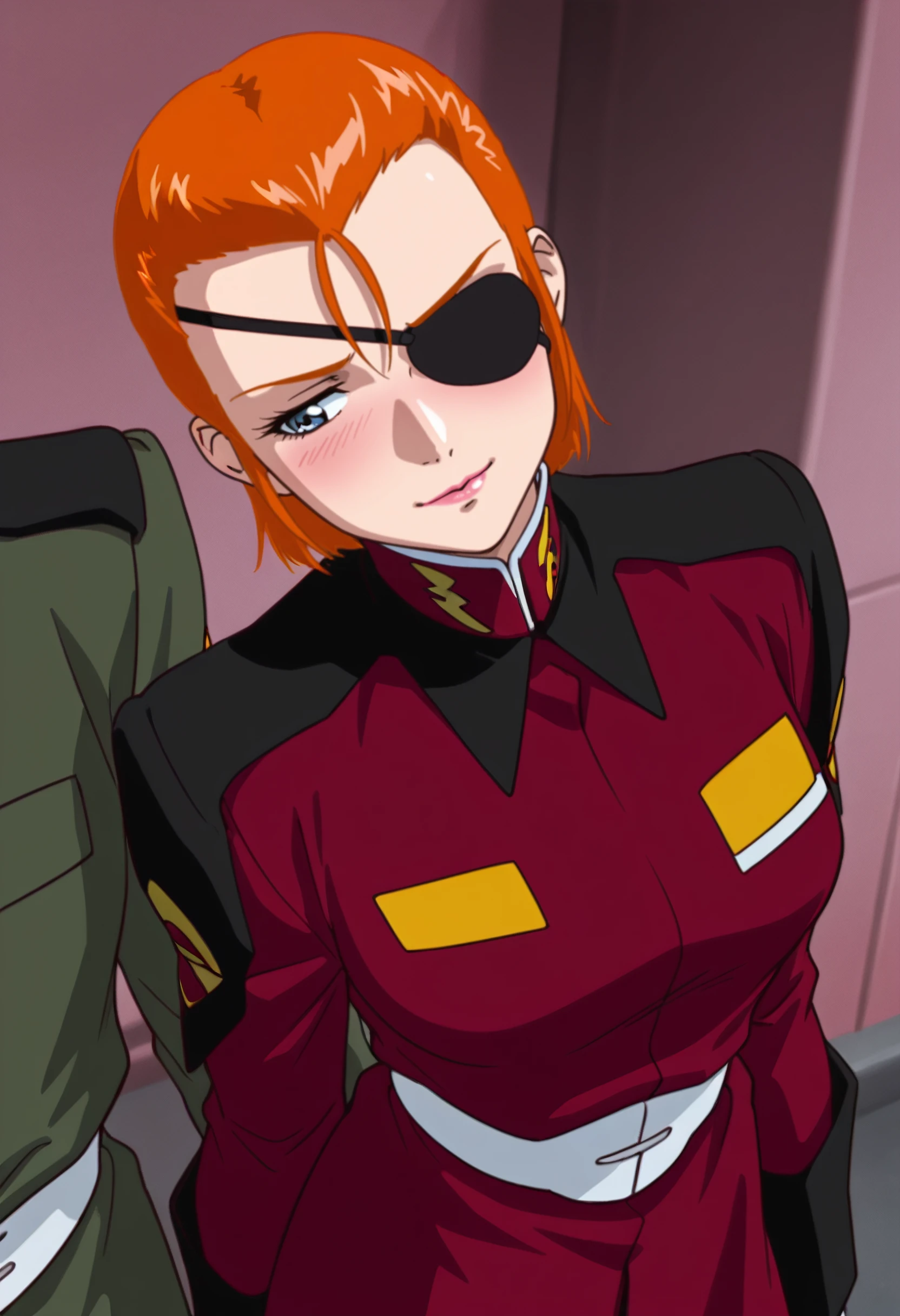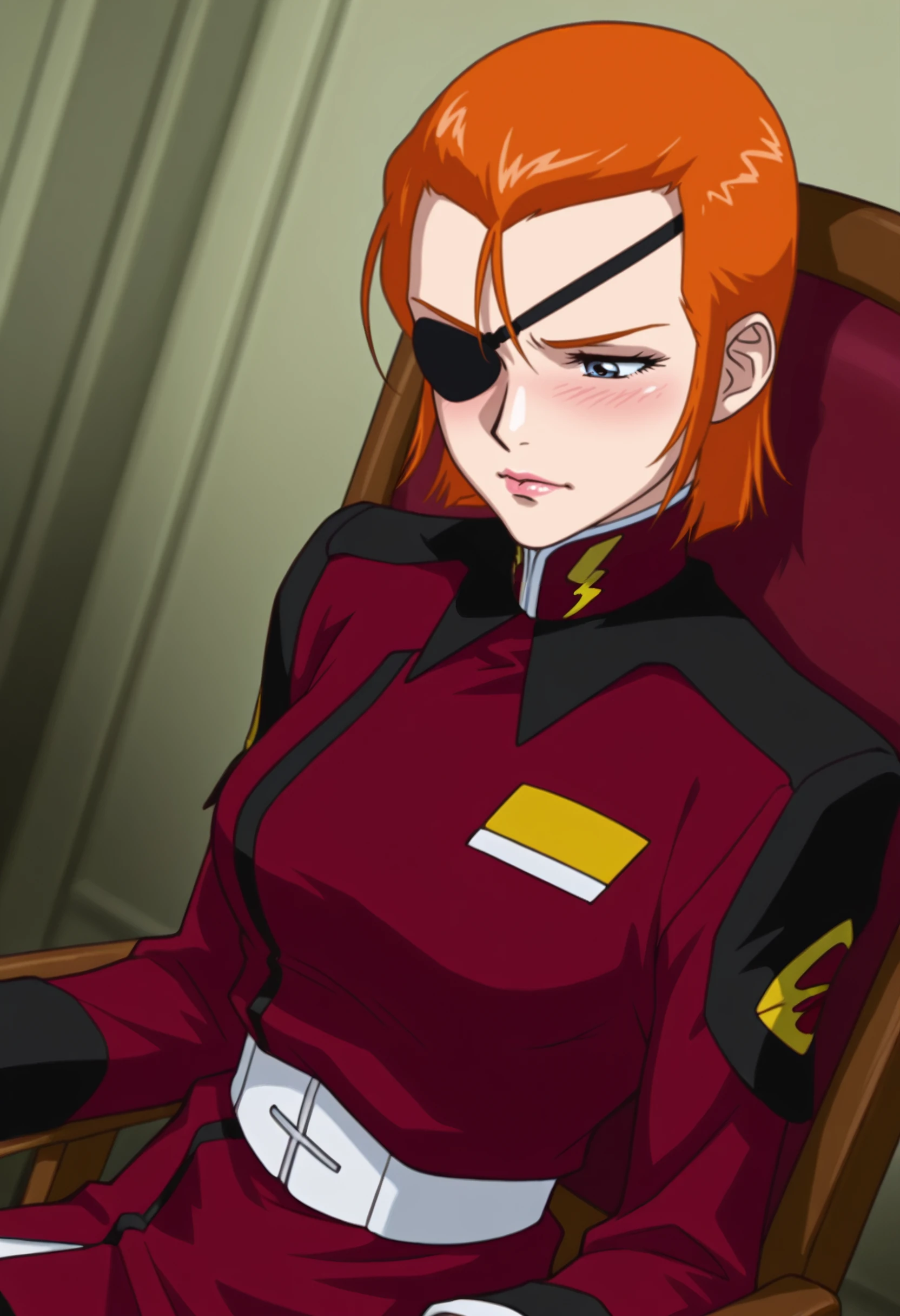 GSDHilda, orange hair, lipstick, blue eyes, pink lips, short hair, eyepatch, one eye covered,