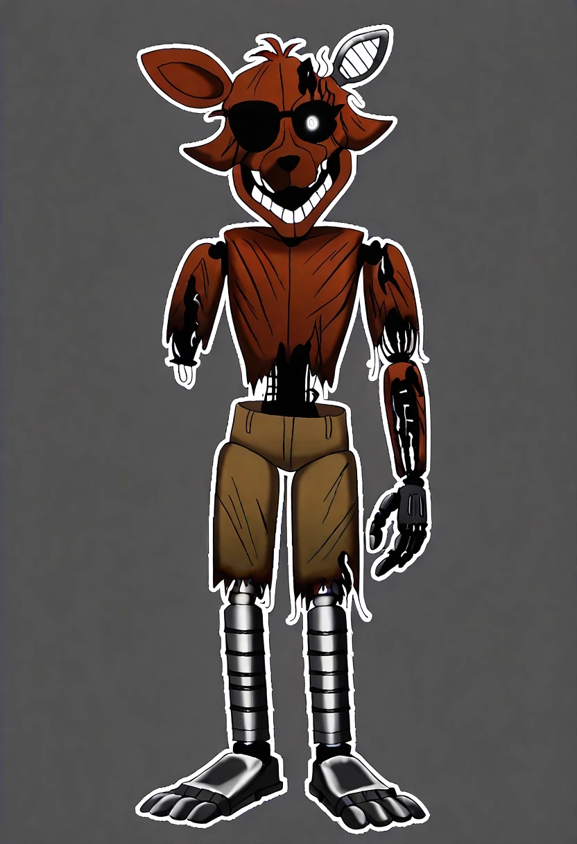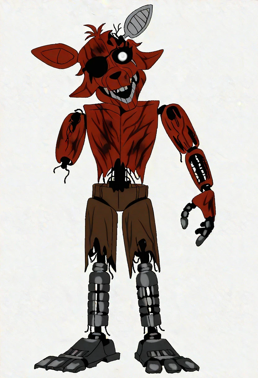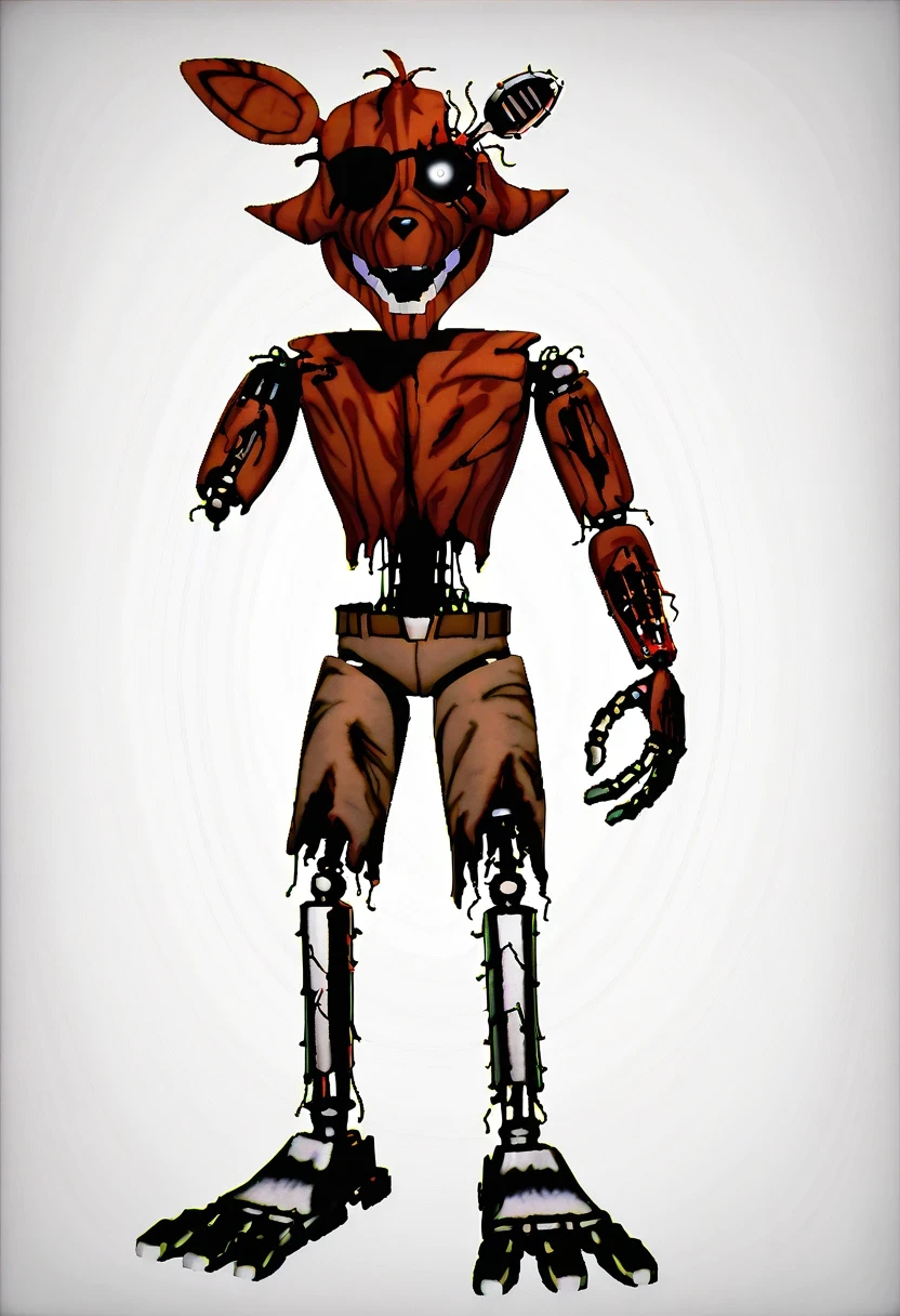 PhantomFoxyFNAF, 1boy, white eyes, black sclera, amputated right forearm, parts of torso are missing, black eyepatch on left eye, metal legs, damaged, horror, animatronic, brown pants, dark red body