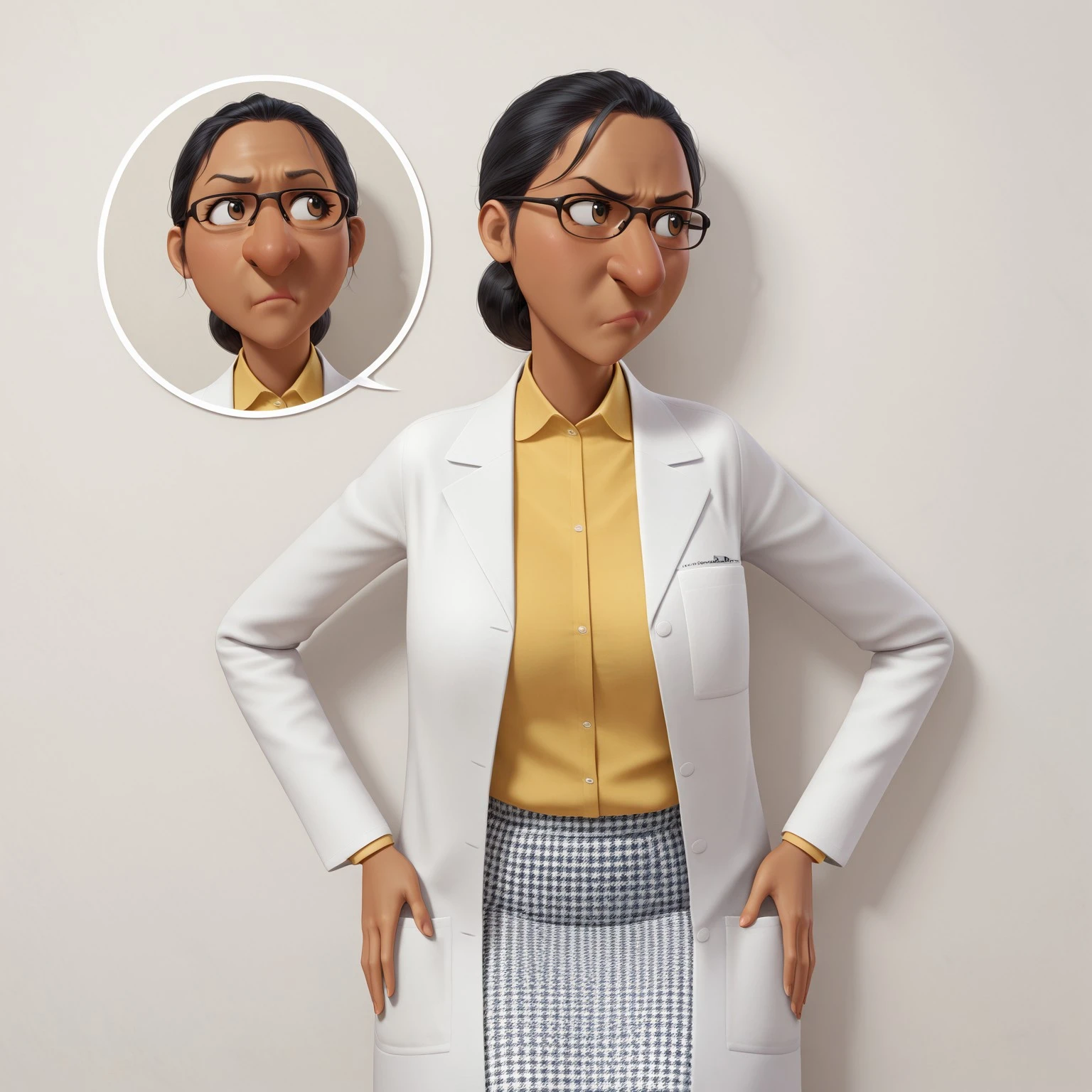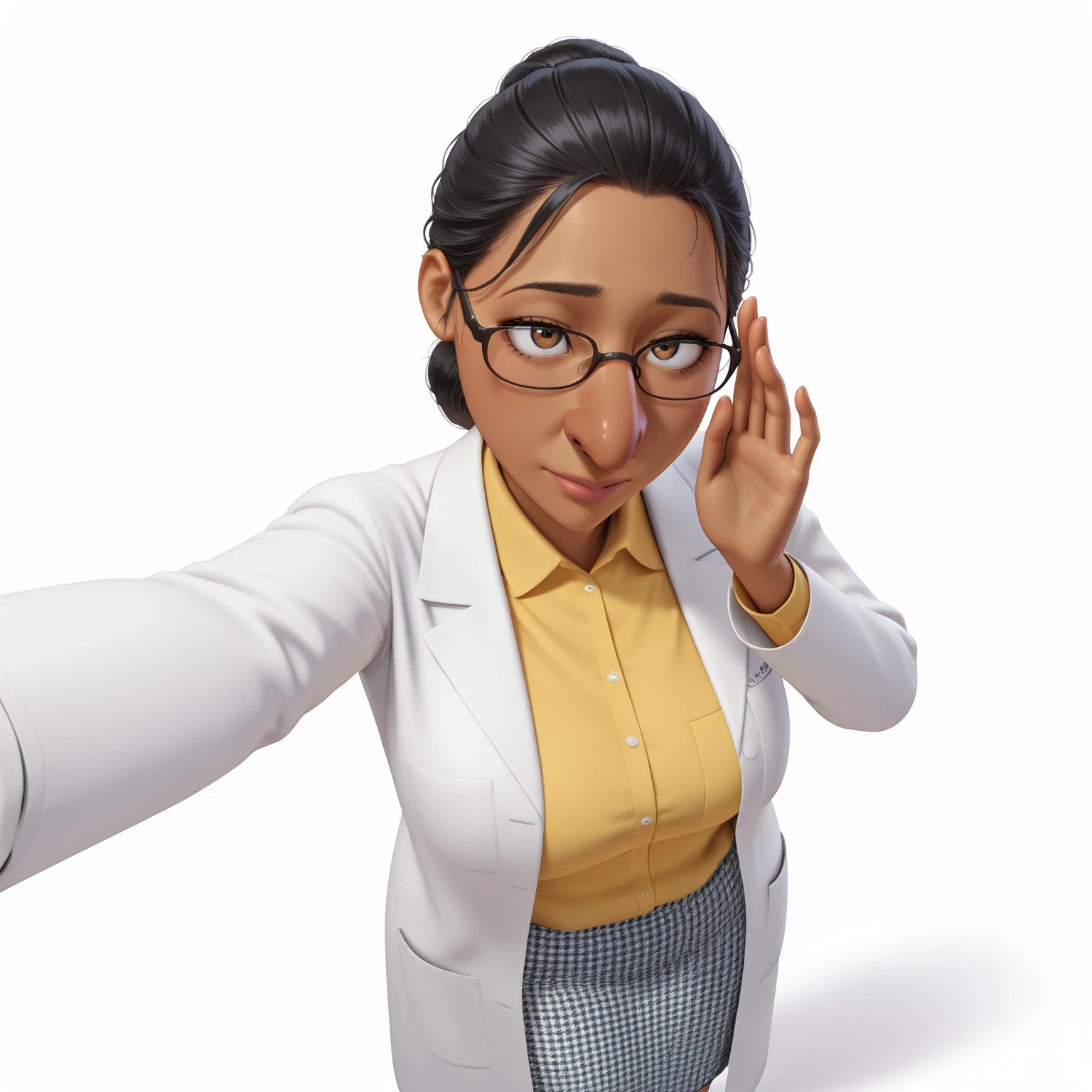 mdo_so, dark skin, black hair, hair bun, glasses, labcoat, shirt, skirt