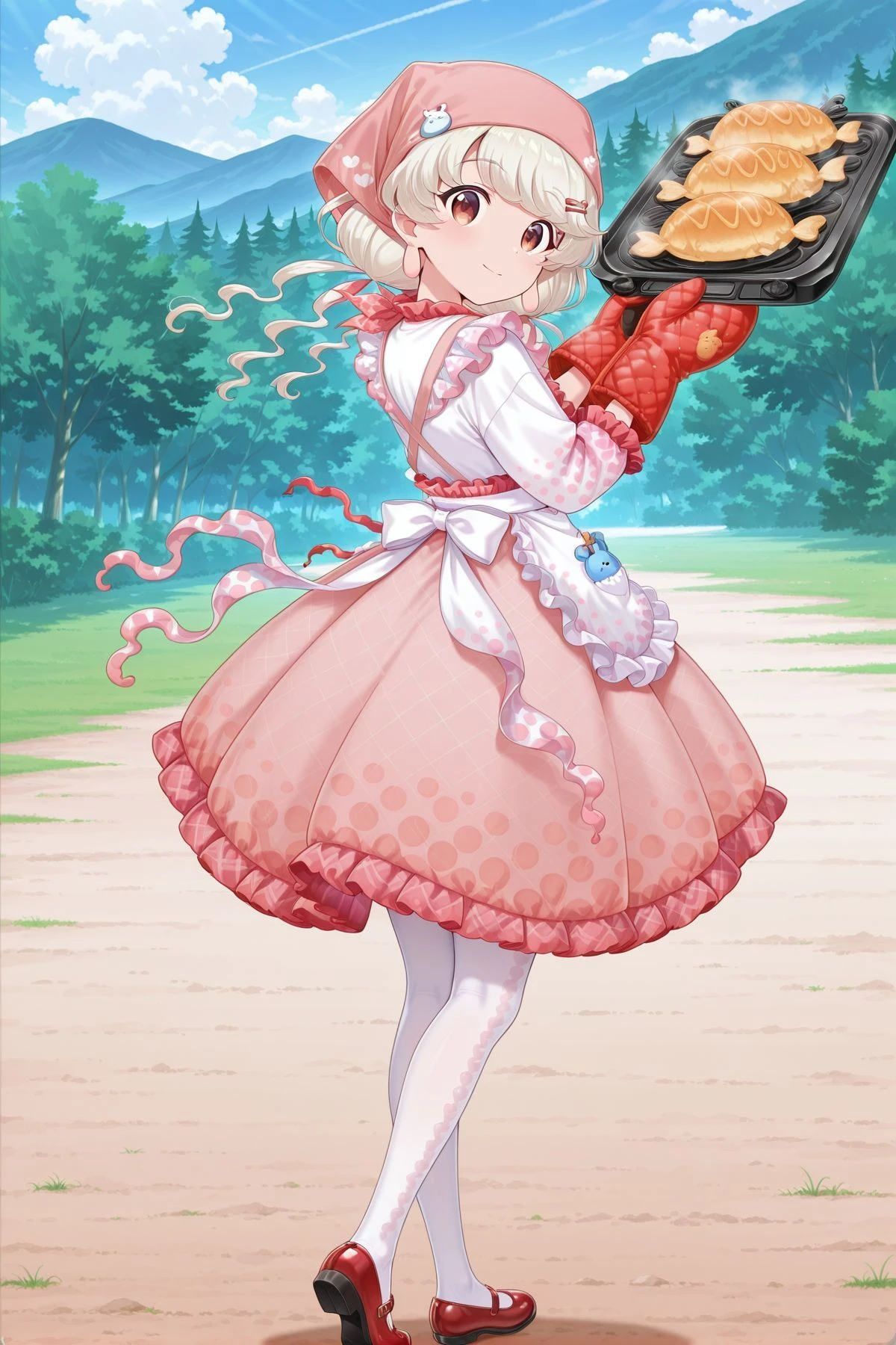 ebisu eika, 1girl, solo, brown eyes, white hair, long hair, long earlobes, ebisu eika \(praying for good health\), alternate costume, pink headscarf, hair ornament, hairclip, white shirt, long sleeves, white apron, waist apron, frilled apron, print apron, back bow, white bow, pink skirt, white pantyhose, mary janes, red shoes, oven mitts, red mitts,Description