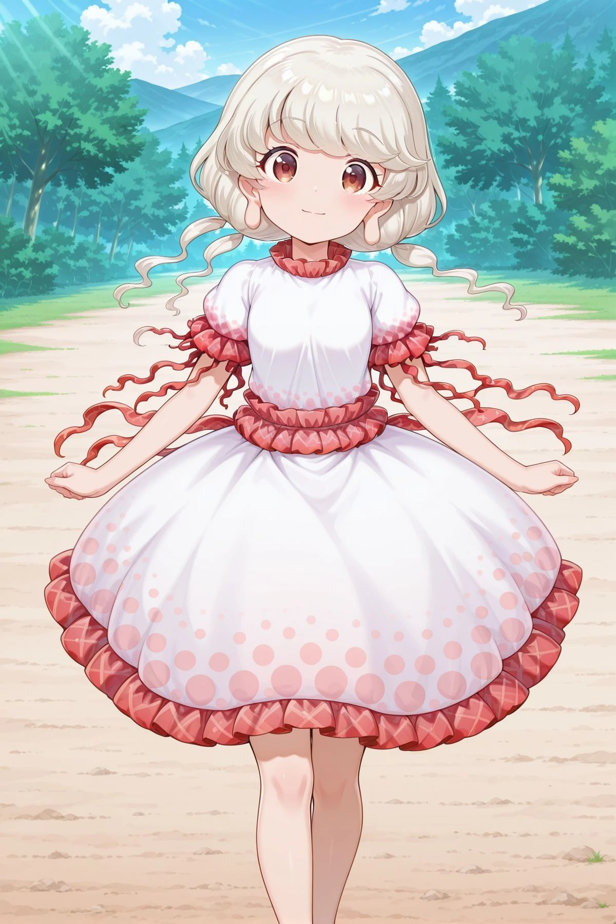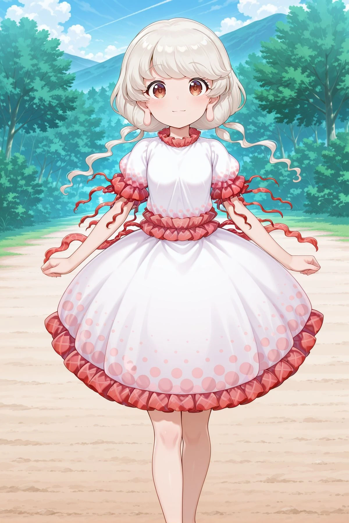 ebisu eika, 1girl, solo, brown eyes, white hair, long hair, long earlobes,white shirt, frilled shirt, short sleeves, white skirt, frilled skirt, barefoot,Alternatives :