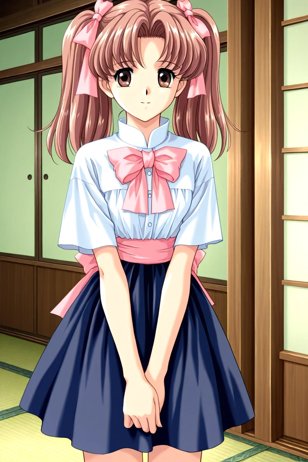 Kitabatake Marie,Game Style,Early 2000s style,Brown hair,Twin Tails,(Pink hair ribbon:0.8),Brown eyes,teen,
