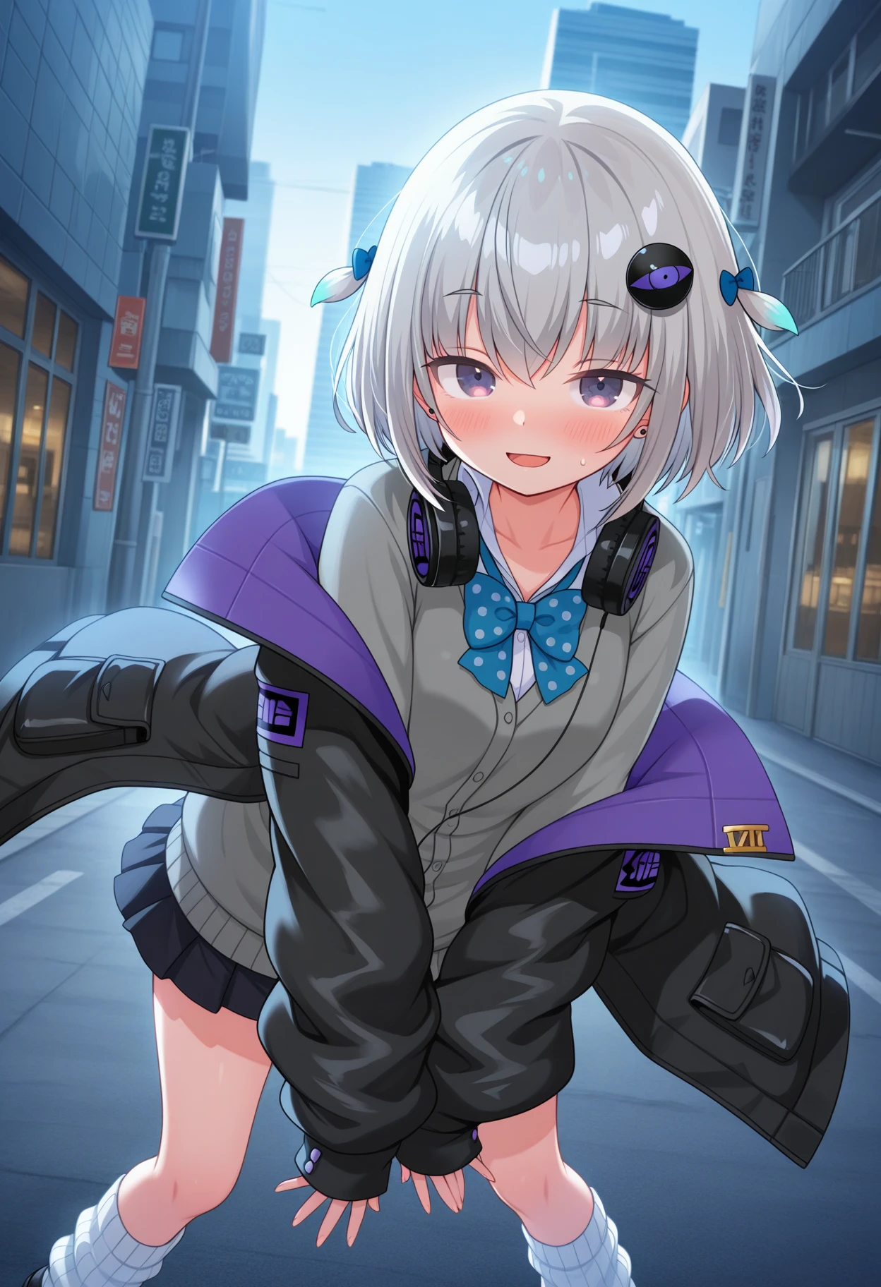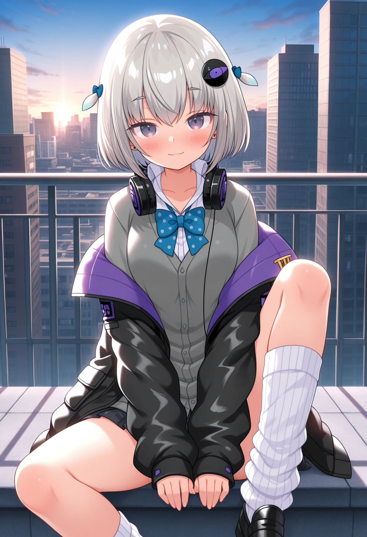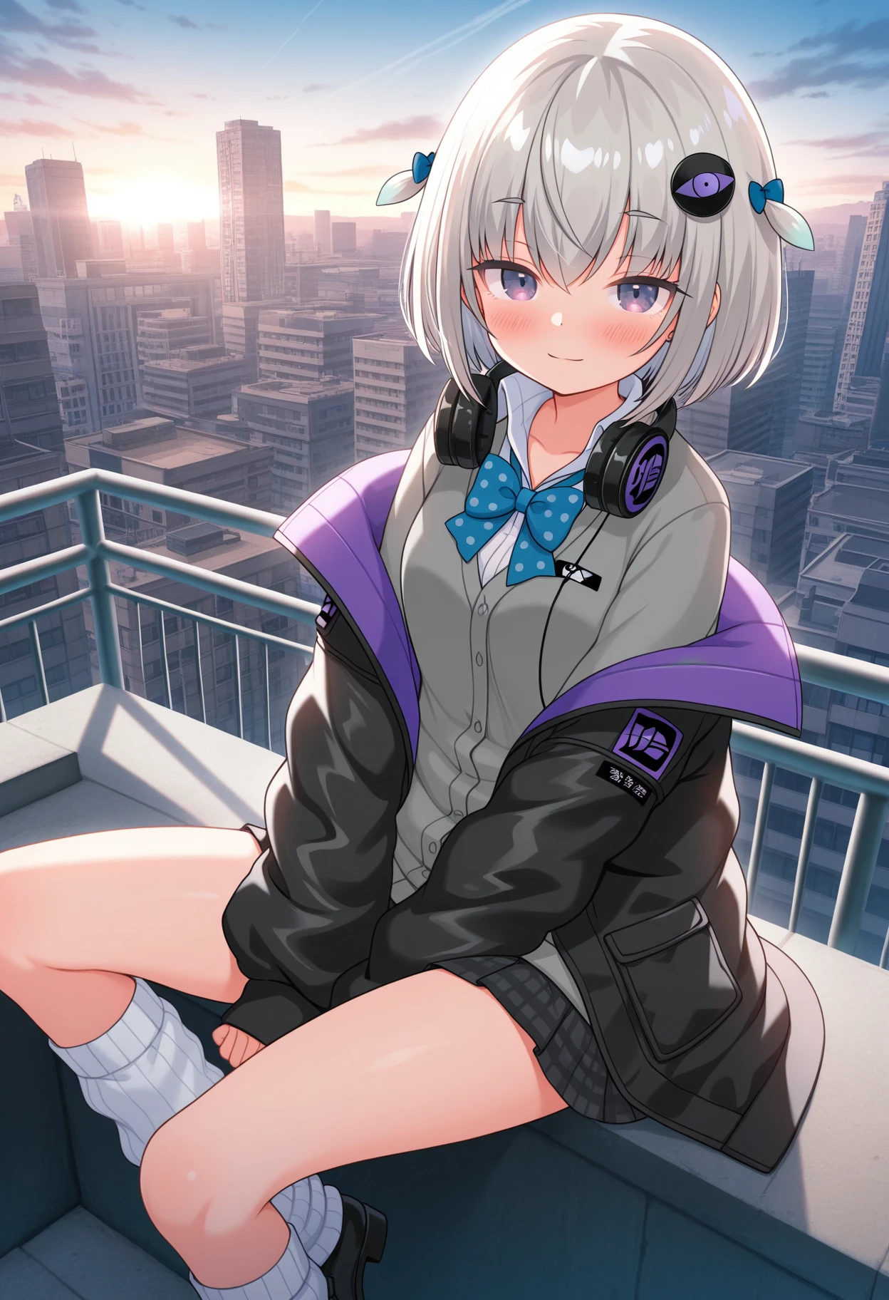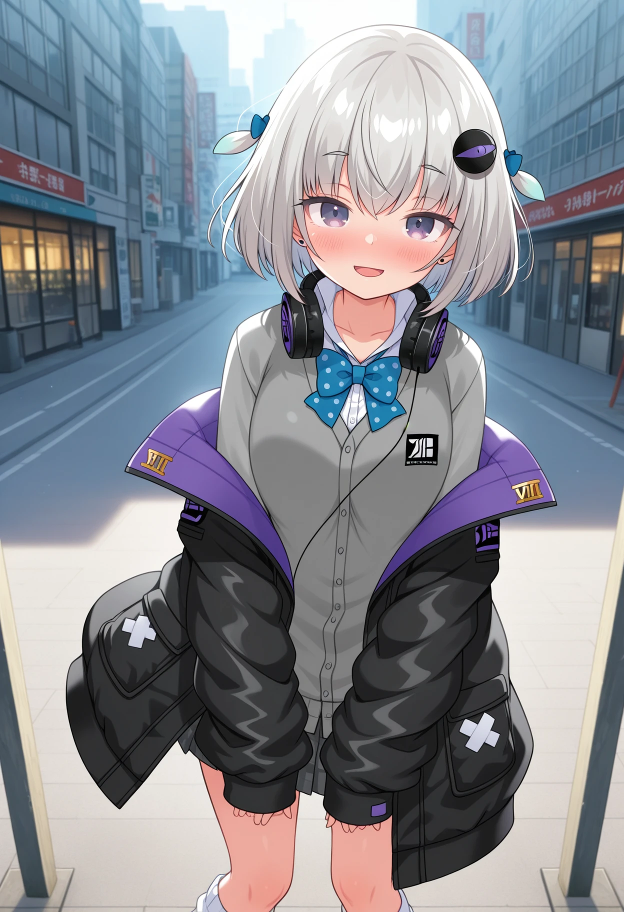 ogiya_miruku_jk, jacket, skirt, purple eyes, grey hair, hair ornament, black jacket, shirt, black footwear, blue bow, open clothes, loose socks, collared shirt, white shirt, pleated skirt, cardigan, open jacket, bowtie, sleeves past wrists, blue bowtie, long sleeves, off shoulder, school uniform, short hair, headphones around neck