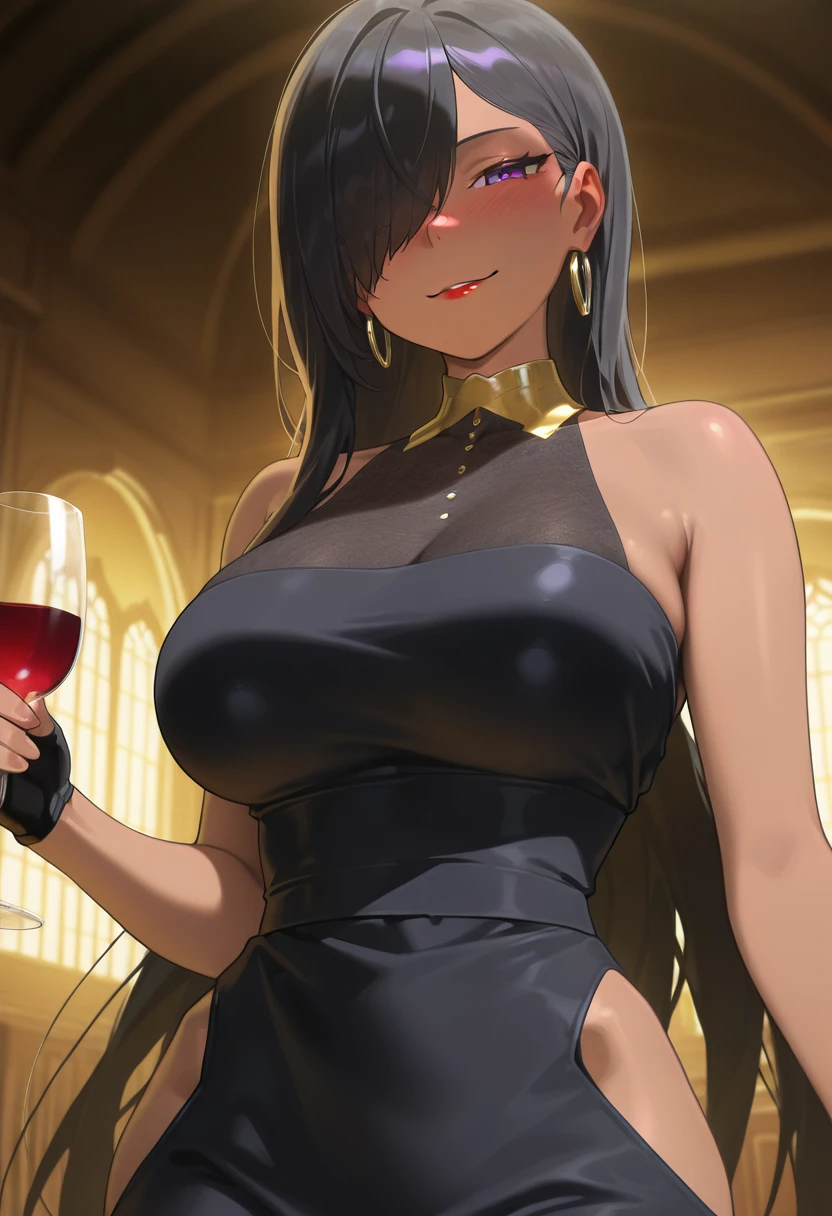 1girl, solo, long hair, large breasts, black hair, very long hair, purple eyes, hair over one eye, dark-skinned female, red lips, hoop earrings,