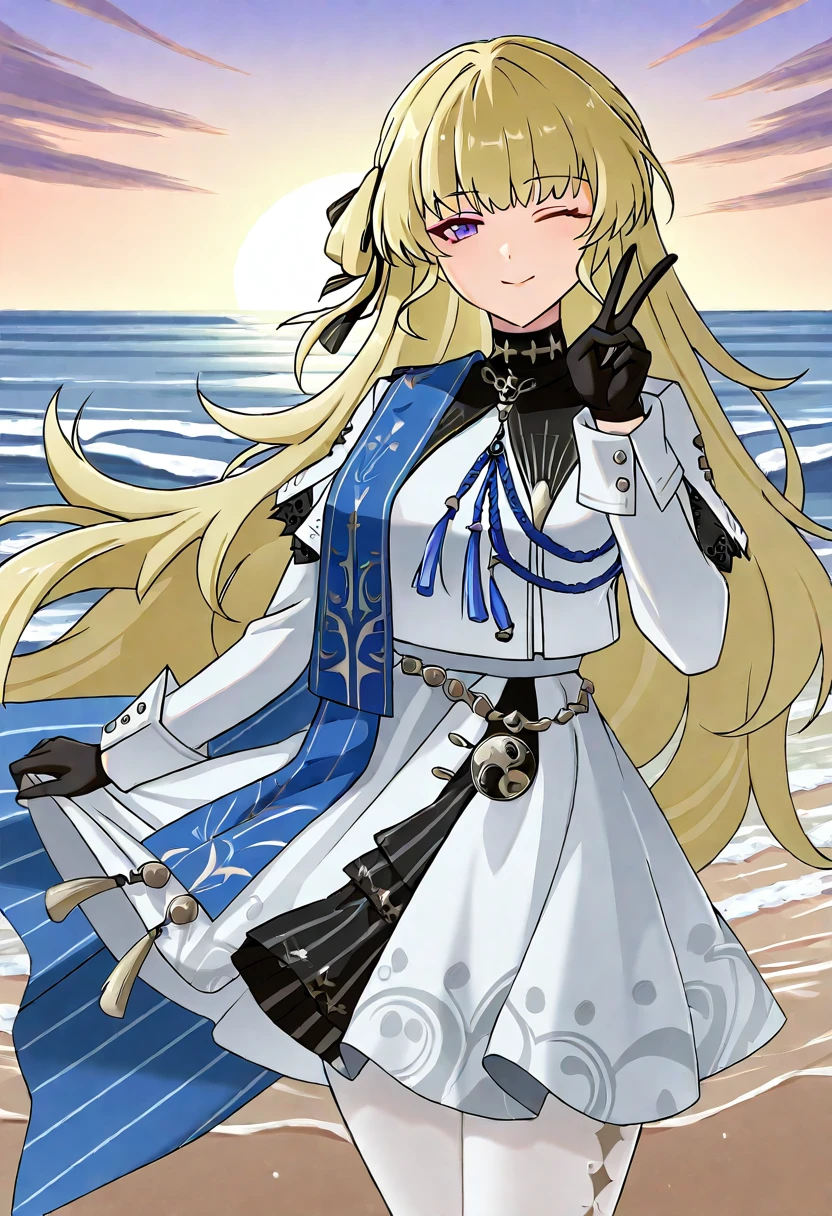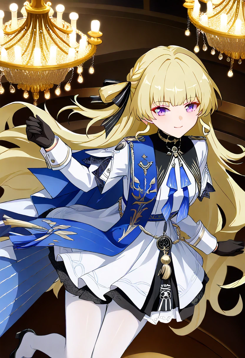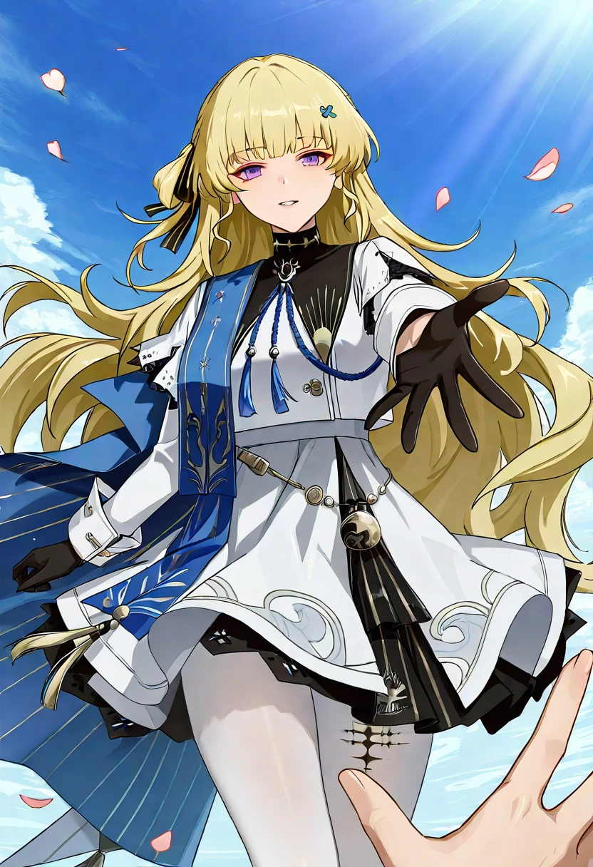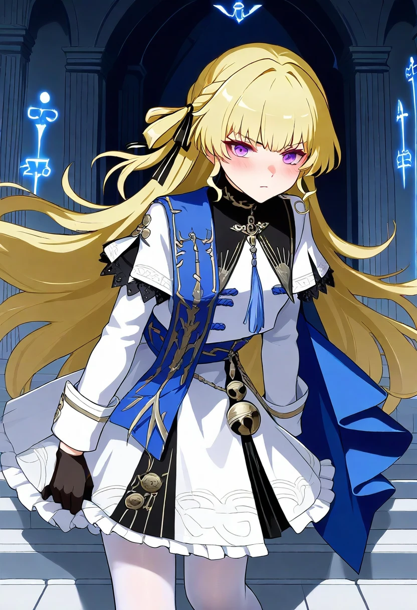 Clothing Prompts: white dress, black gloves, long sleeves, blue sash, side cape, blue cape, white pantyhose