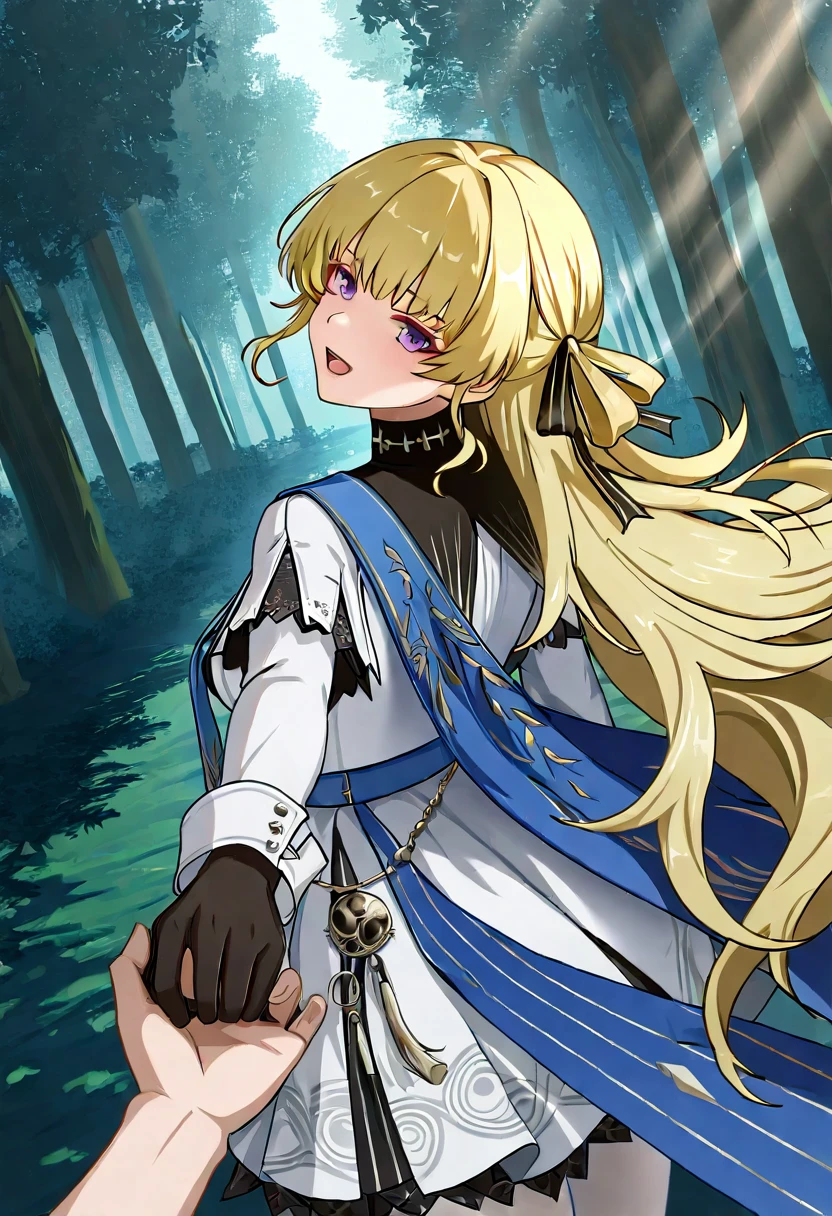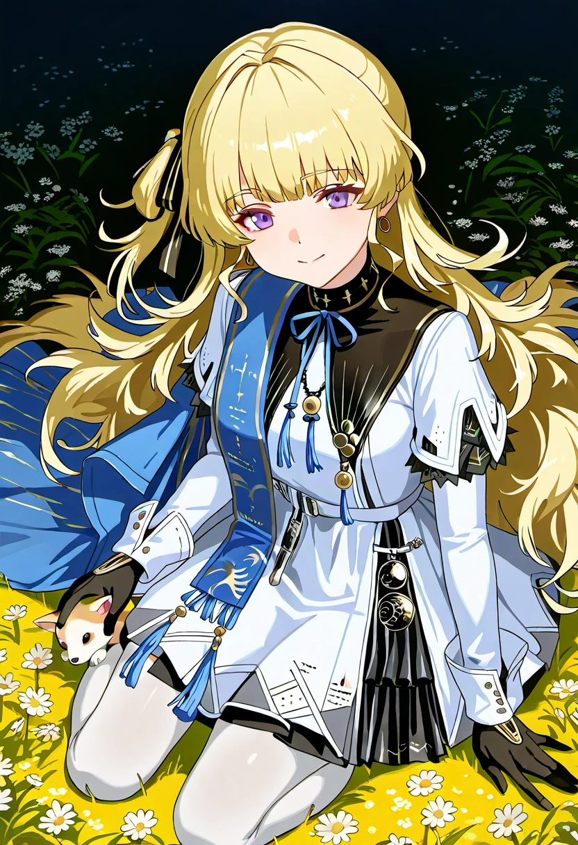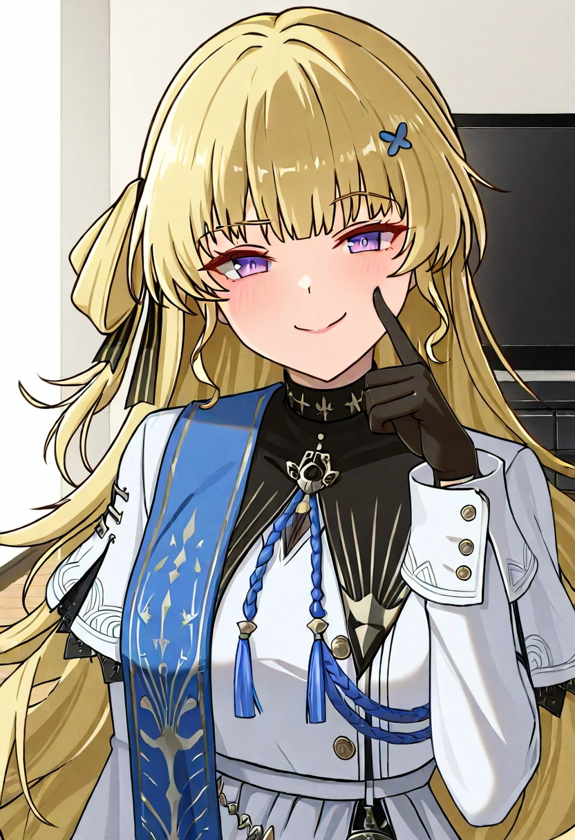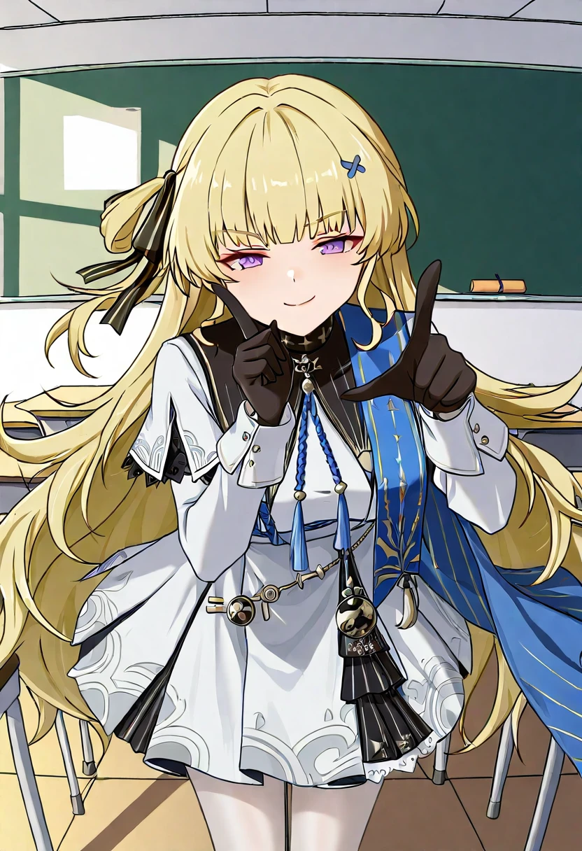 Clothing Prompts: white dress, black gloves, long sleeves, blue sash, side cape, blue cape, white pantyhose