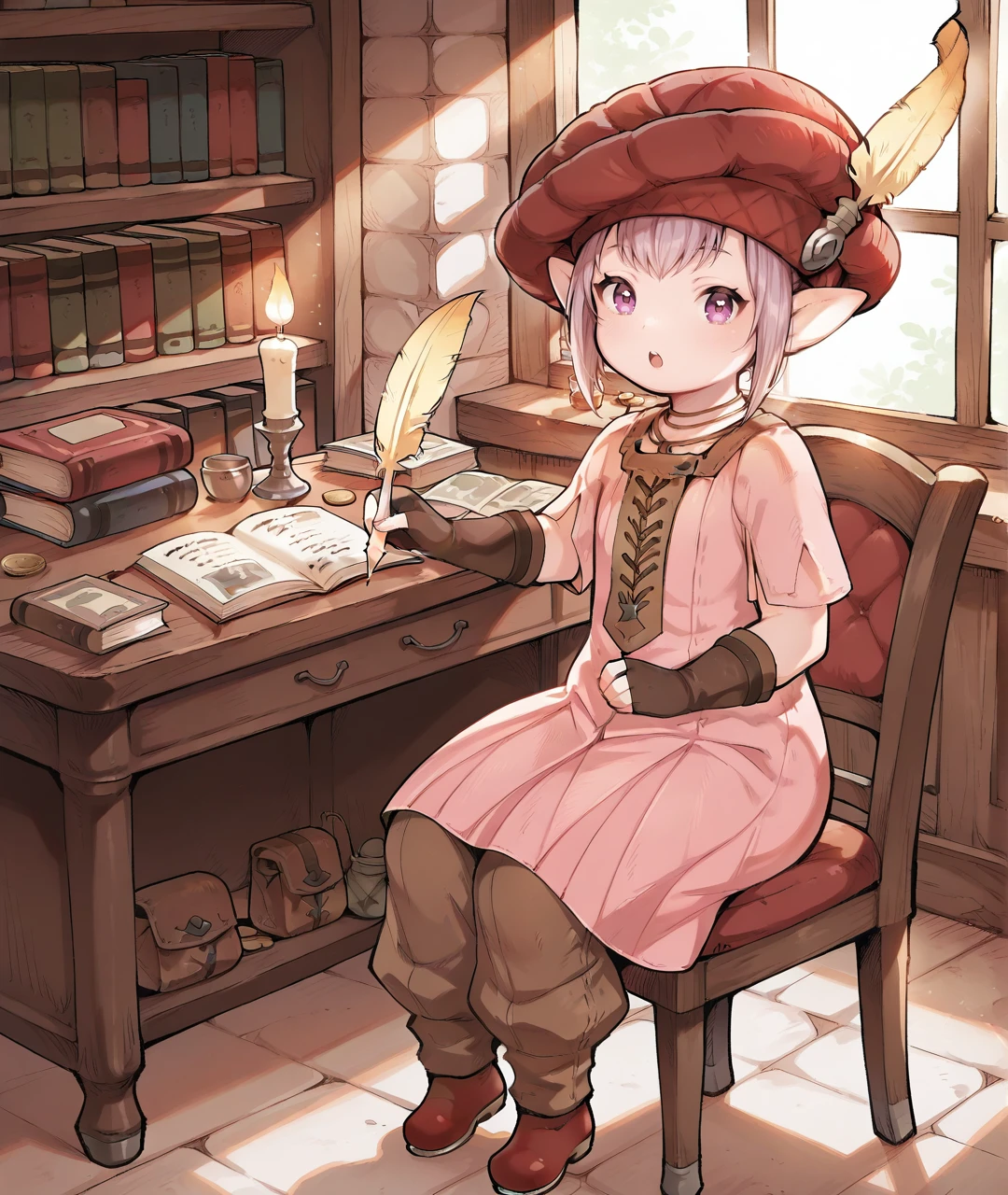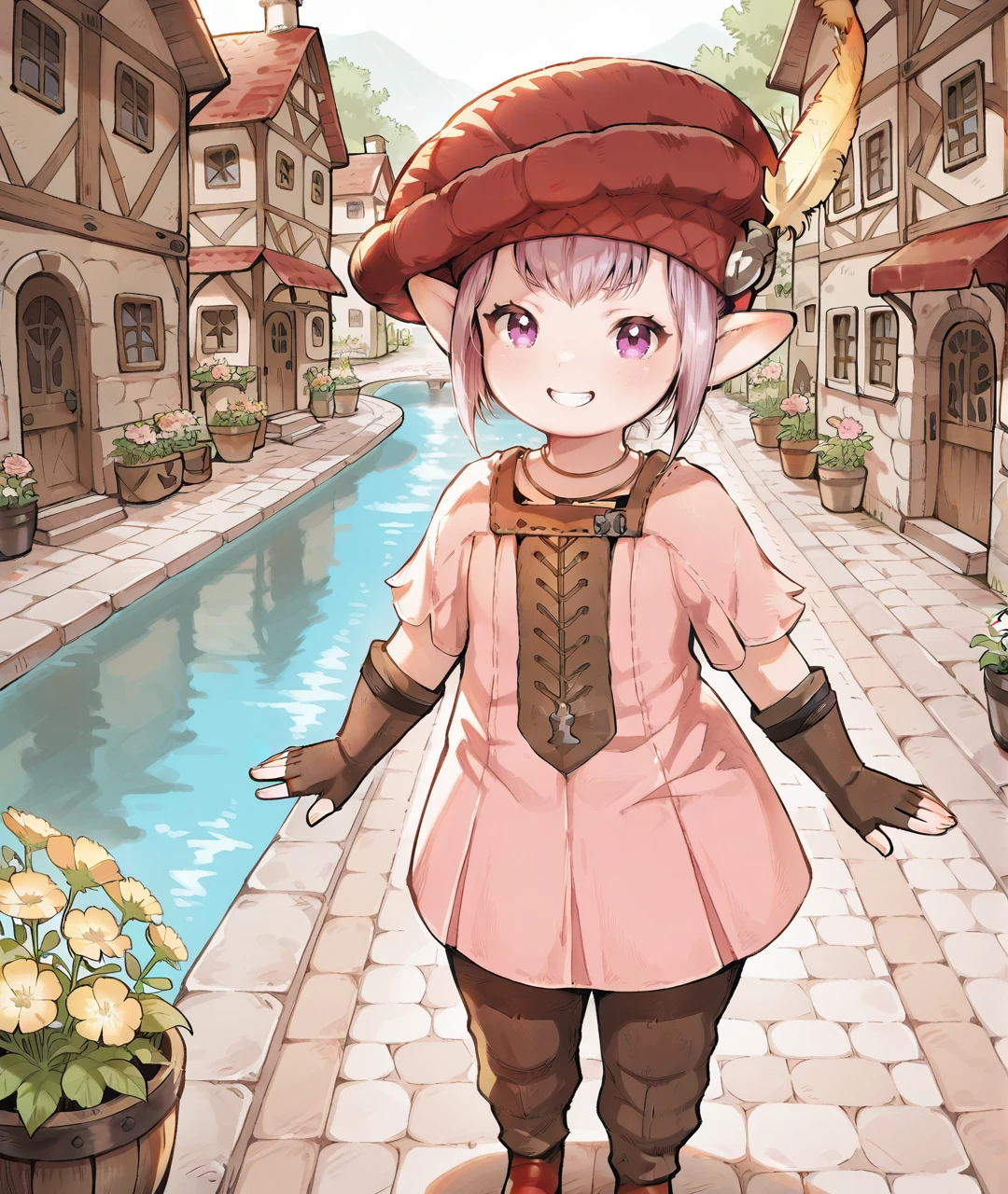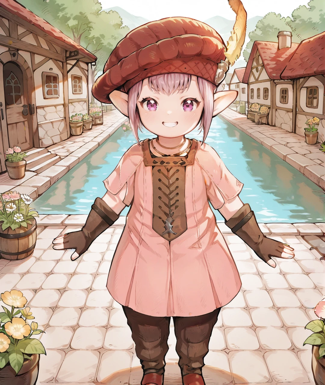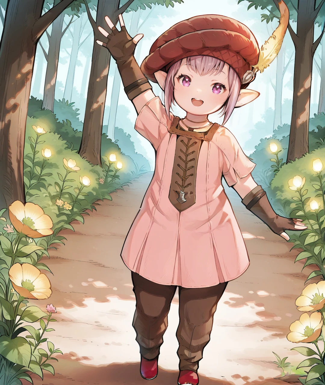 TataruBase, lalafell, pointy ears, purple eyes, light purple hair, short hair, red headwear, yellow hat feather, flat chest, pink dress, short sleeves, brown fingerless gloves, brown pants, red shoes,