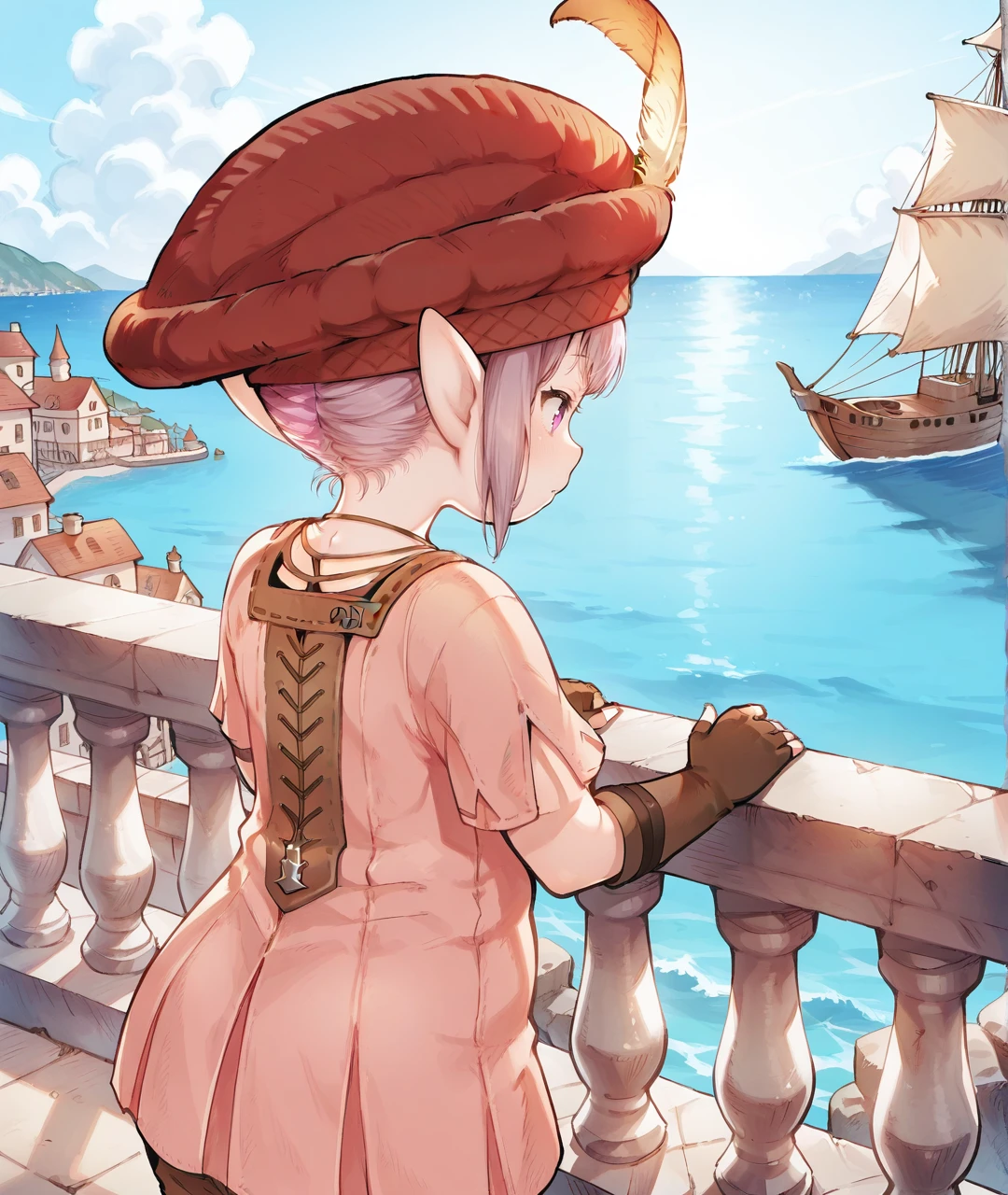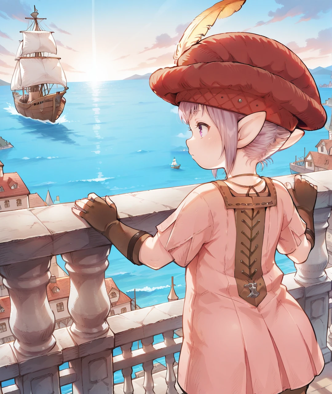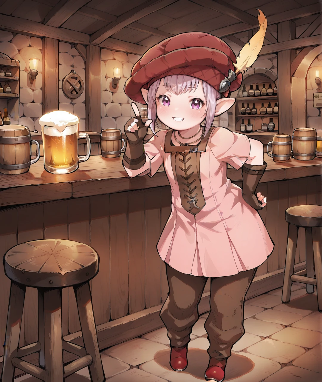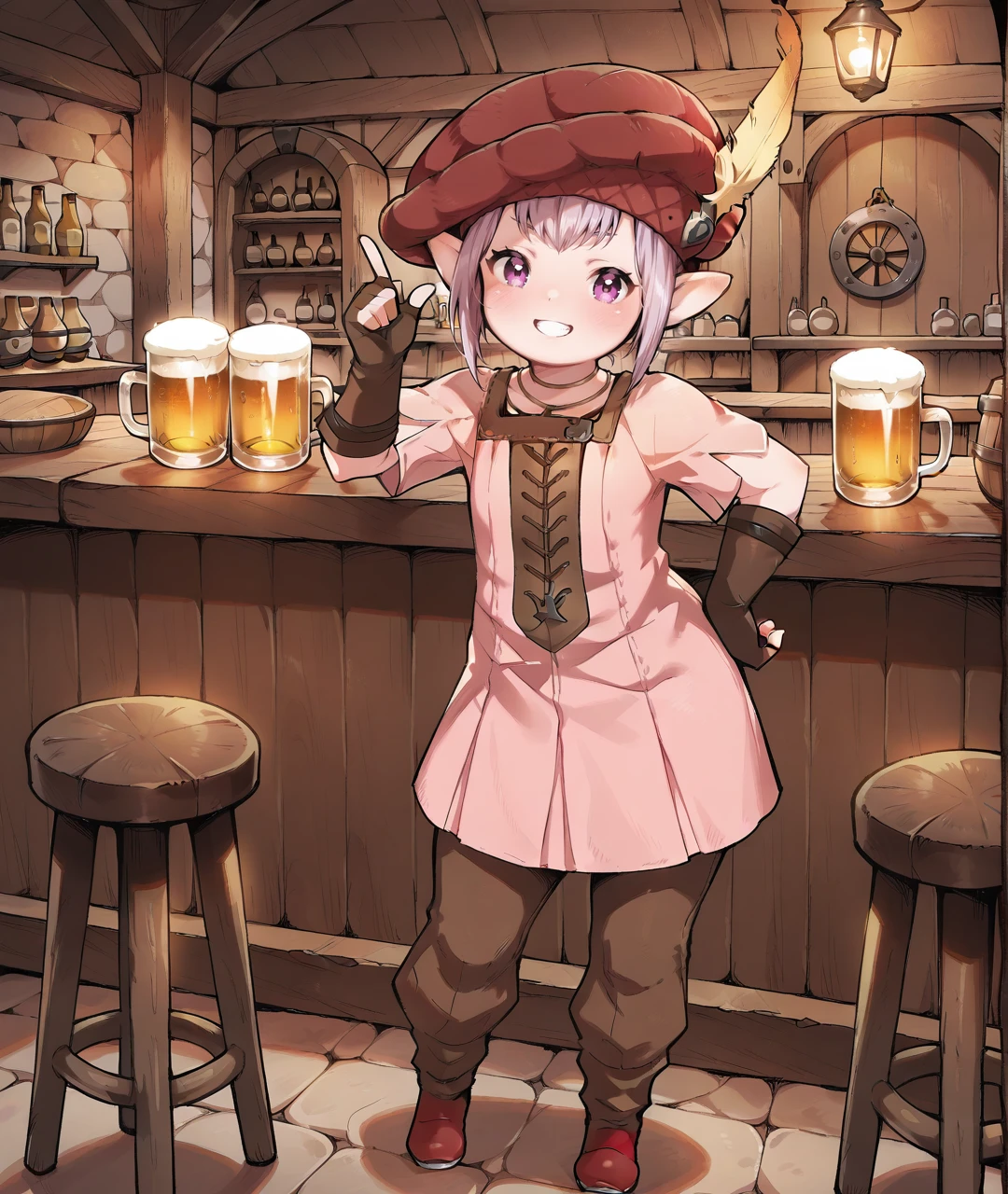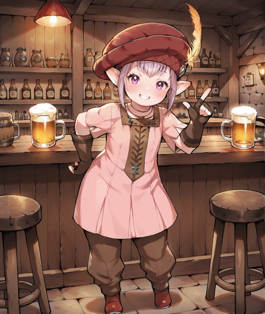 TataruBase, lalafell, pointy ears, purple eyes, light purple hair, short hair, red headwear, yellow hat feather, flat chest, pink dress, short sleeves, brown fingerless gloves, brown pants, red shoes,