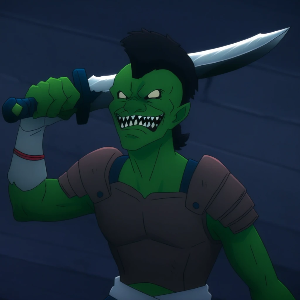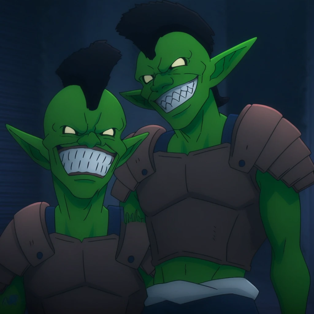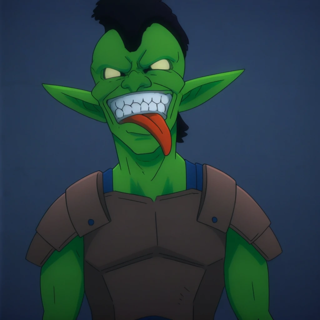 green skin, clenched teeth, colored skin, armor, smile, male focus, pointy ears, black hair, sharp teeth, teeth