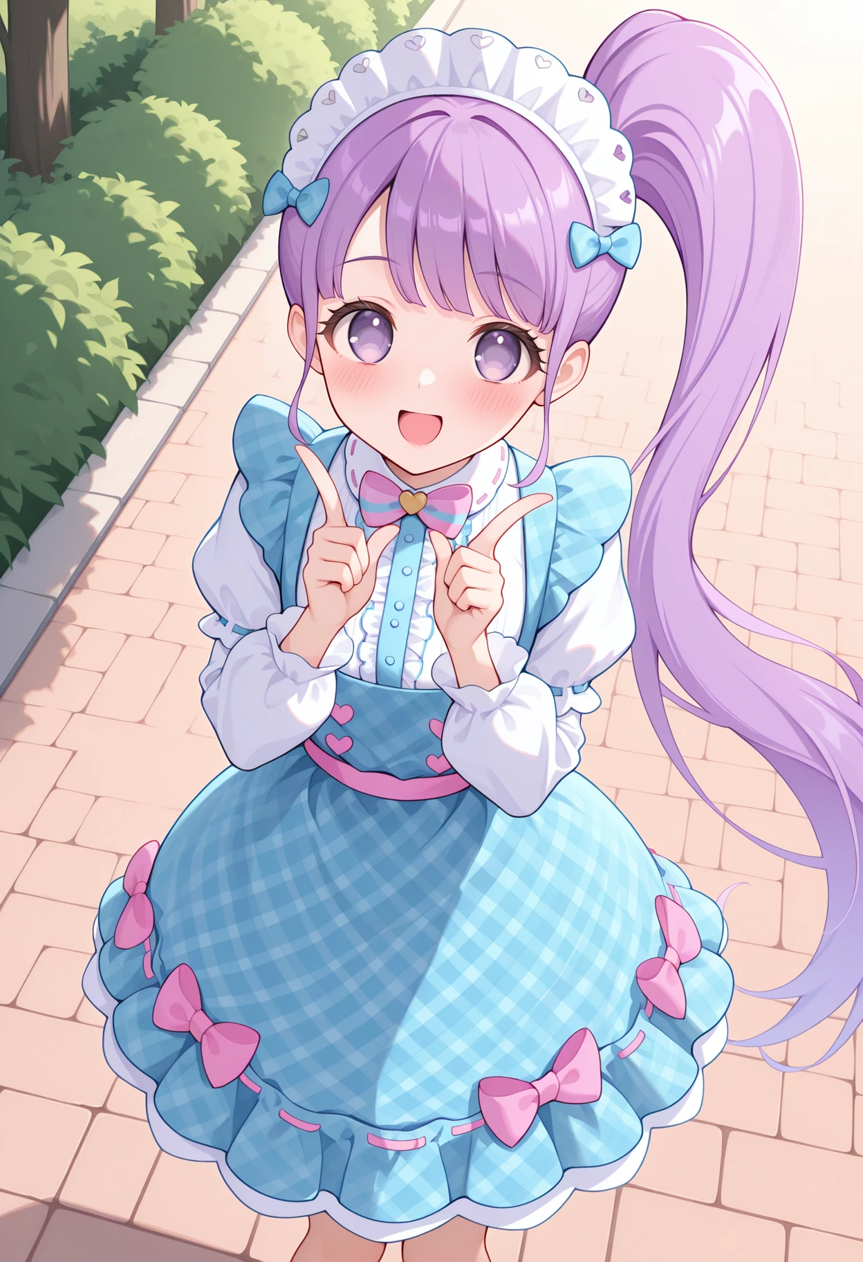 • pnongin, blue dress, plaid dress, pinafore dress, center frills, maid headdress, hair bow, blue bow, pink bow, striped bow, pink sash, puffy sleeves, long sleeves, white sleeves, ribbon trim, dress bow,