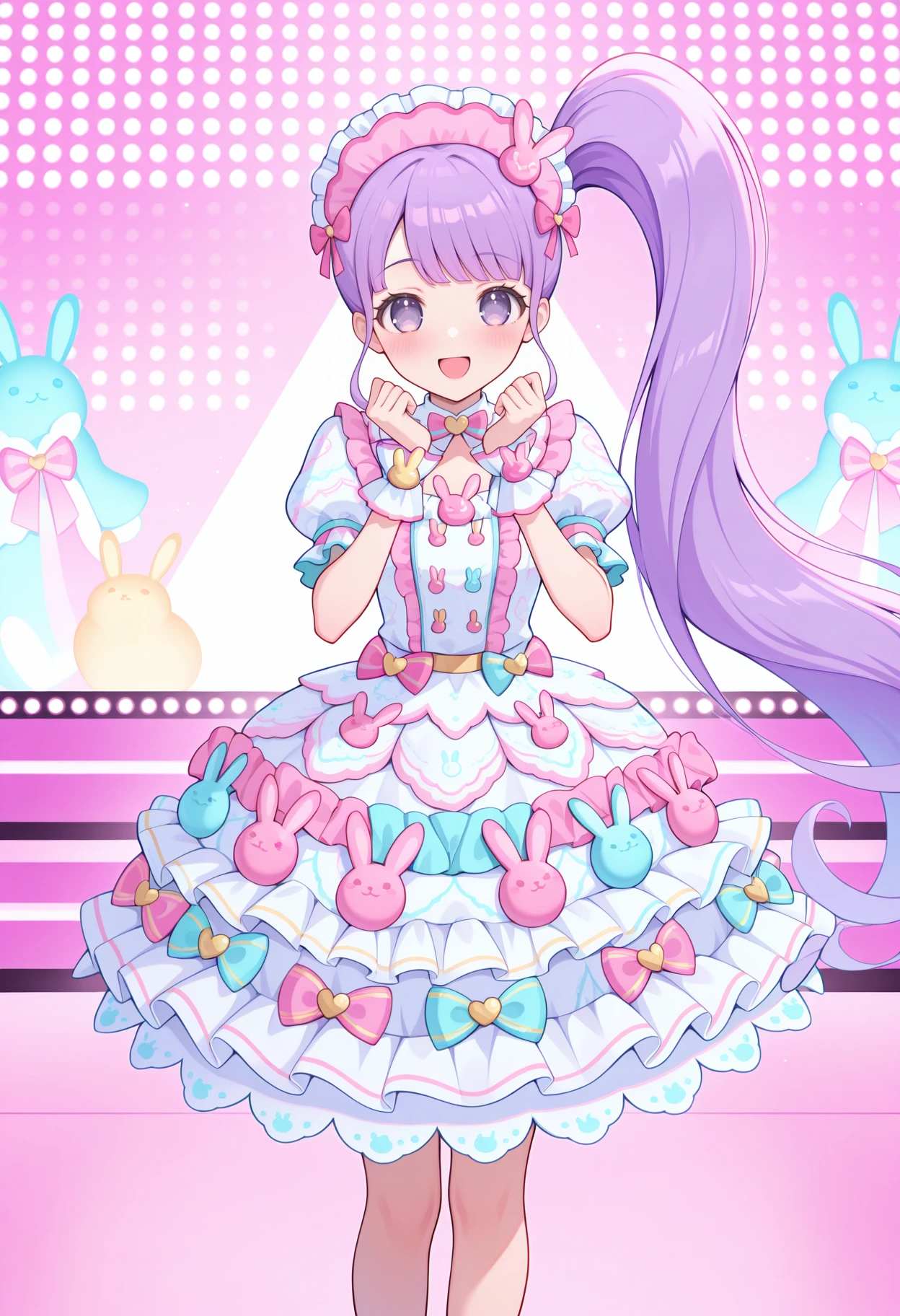pnonbny, pink headdress, frilled headwear, white dress, multicolored dress, pink bow, multicolored bow, puffy short sleeves, layered dress, print dress, dress bow, rabbit ornament, wrist cuffs, kneehighs, pink footwear, footwear bow,