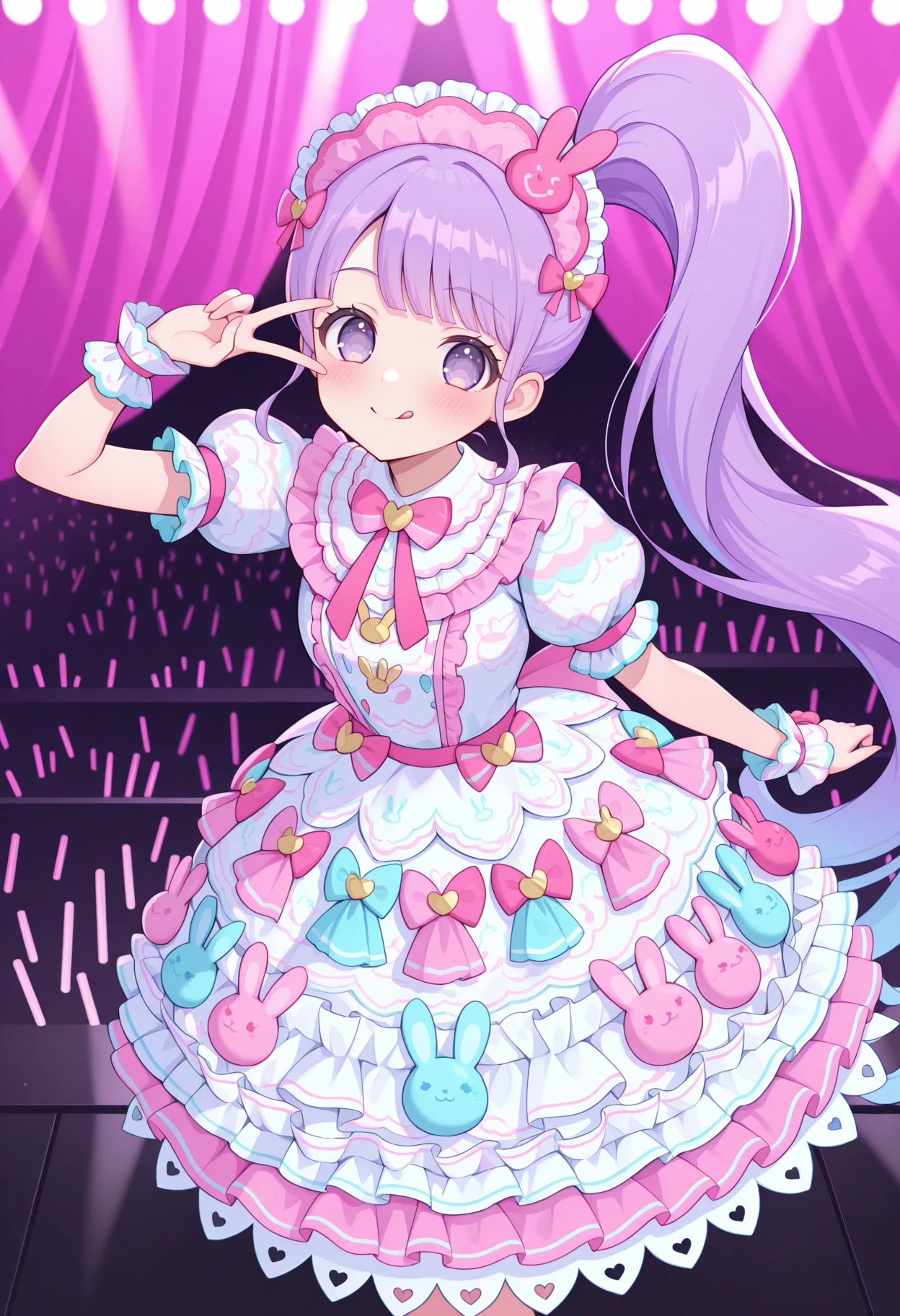 • pnonbny, pink headdress, frilled headwear, white dress, multicolored dress, pink bow, multicolored bow, puffy short sleeves, layered dress, print dress, dress bow, rabbit ornament, wrist cuffs, kneehighs, pink footwear, footwear bow,