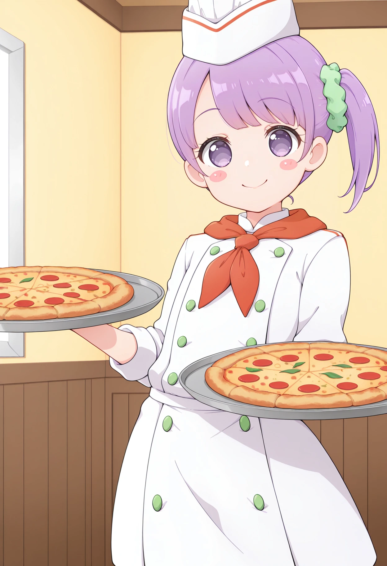 chef, chef hat, white dress, white headwear, neckerchief, buttons, sandals,