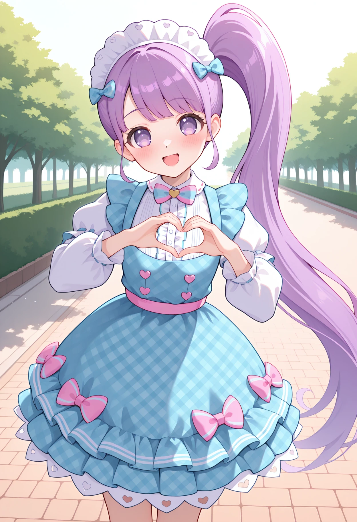 pnongin, blue dress, plaid dress, pinafore dress, center frills, maid headdress, hair bow, blue bow, pink bow, striped bow, pink sash, puffy sleeves, long sleeves, white sleeves, ribbon trim, dress bow,