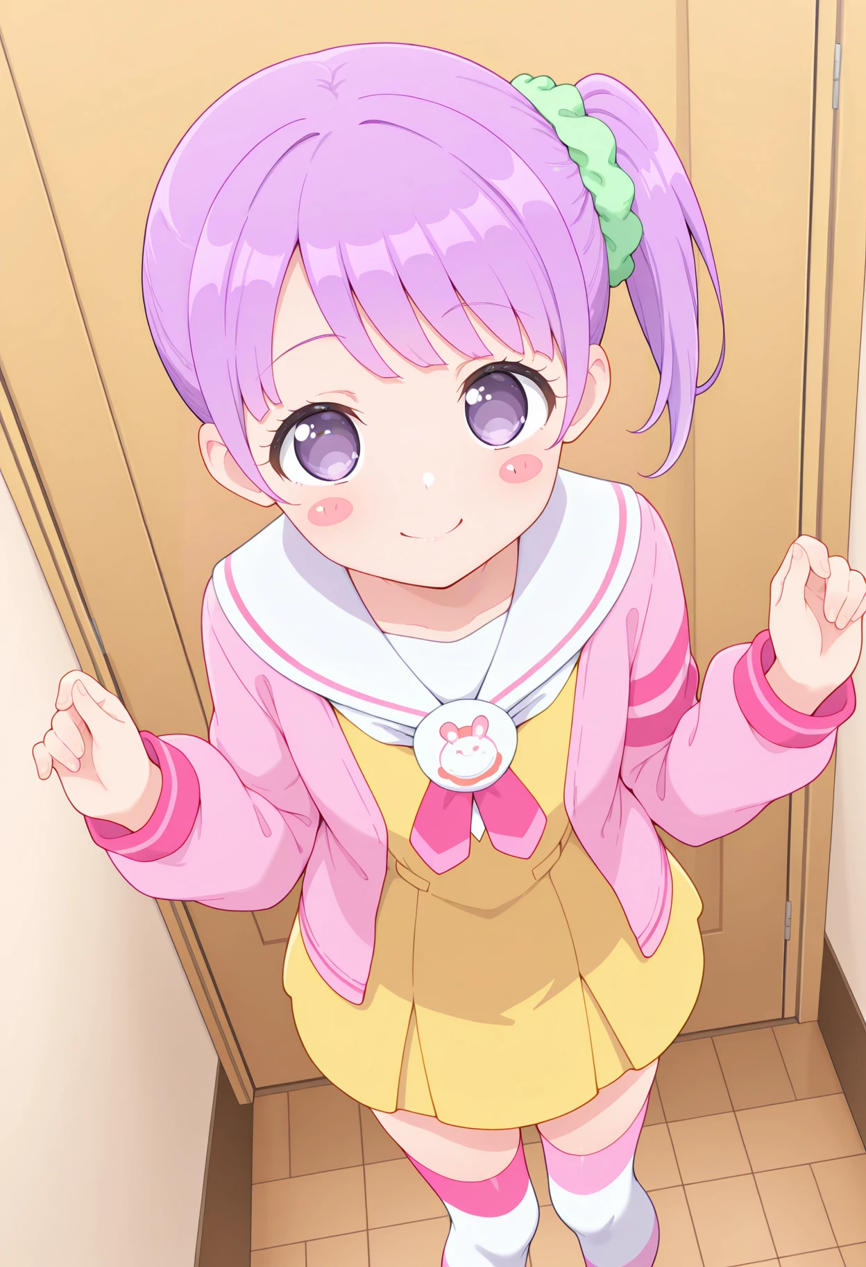 • school uniform, white sailor collar, yellow dress, pink jacket, white thighhighs, striped thighhighs, shoes,