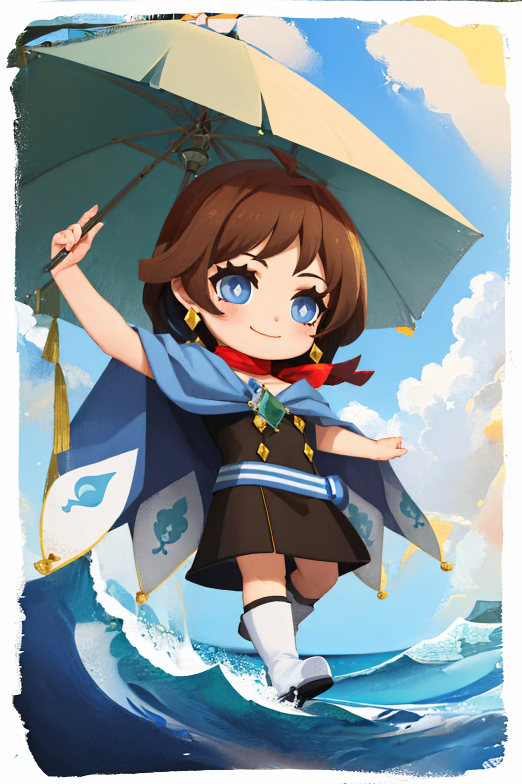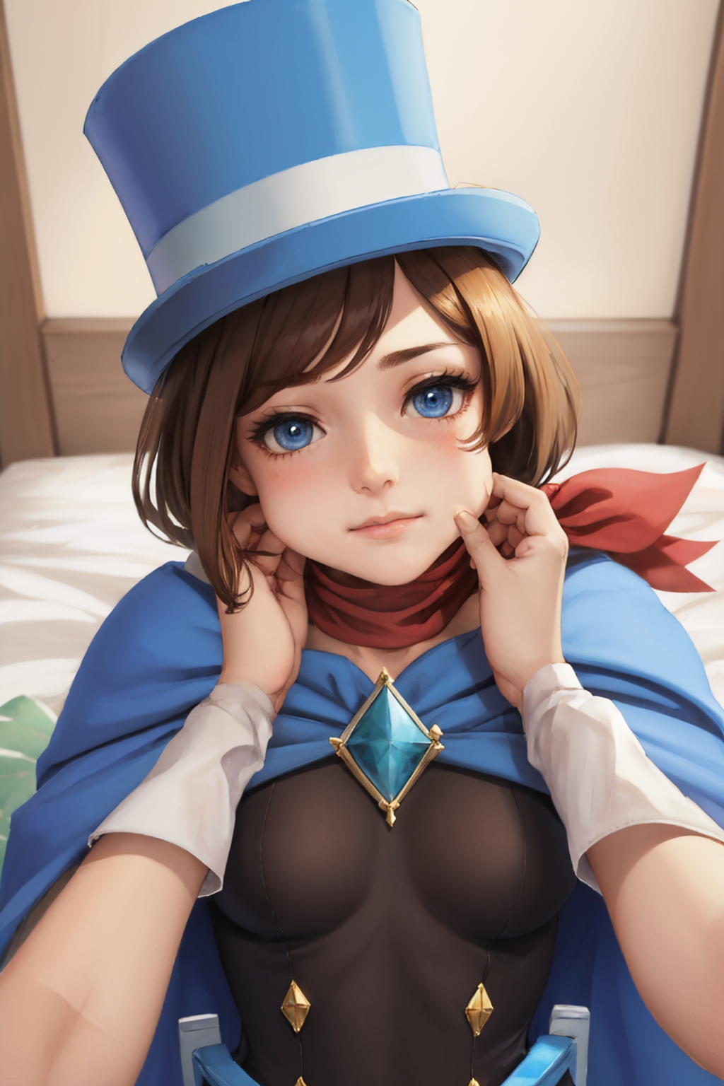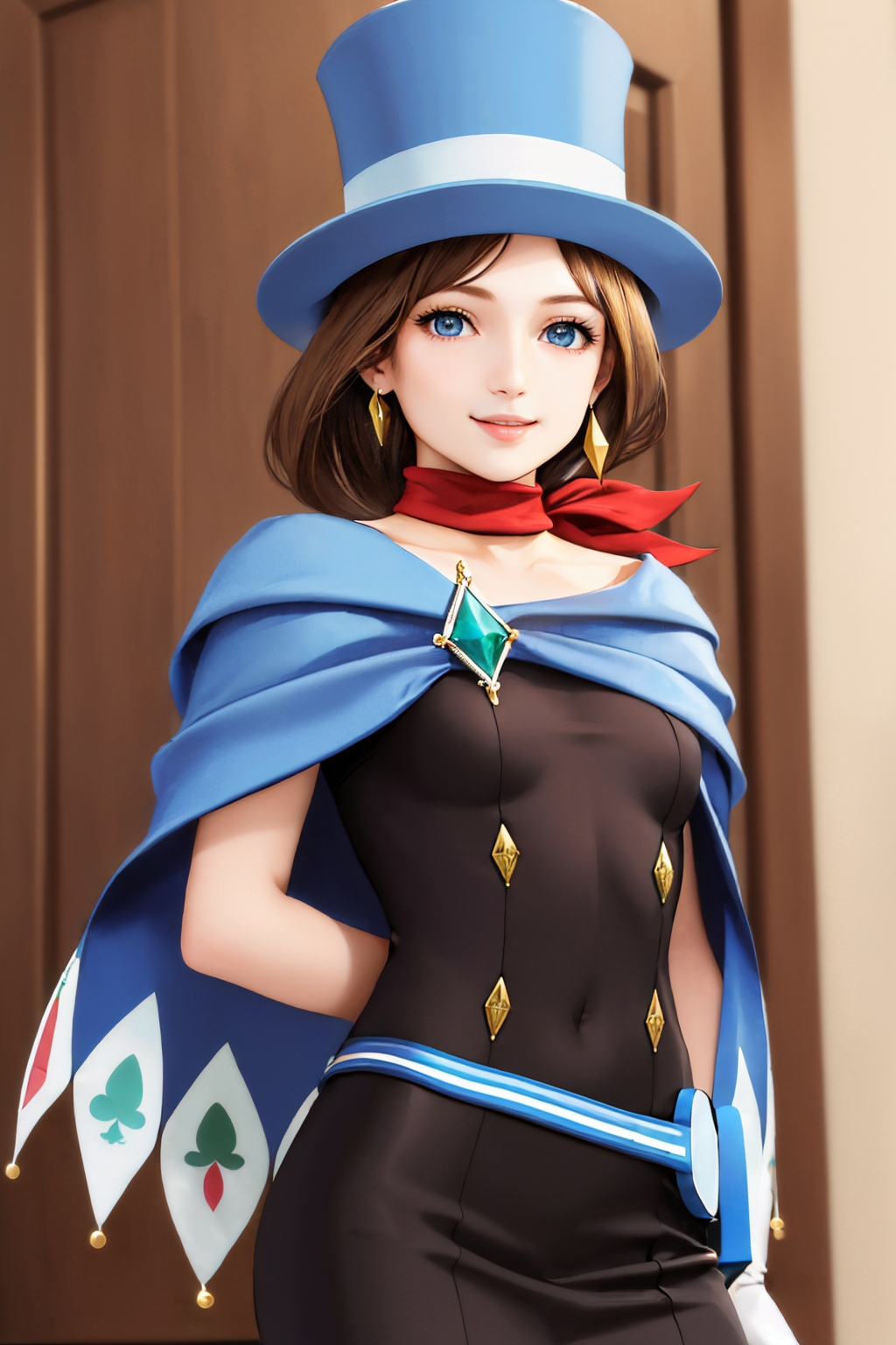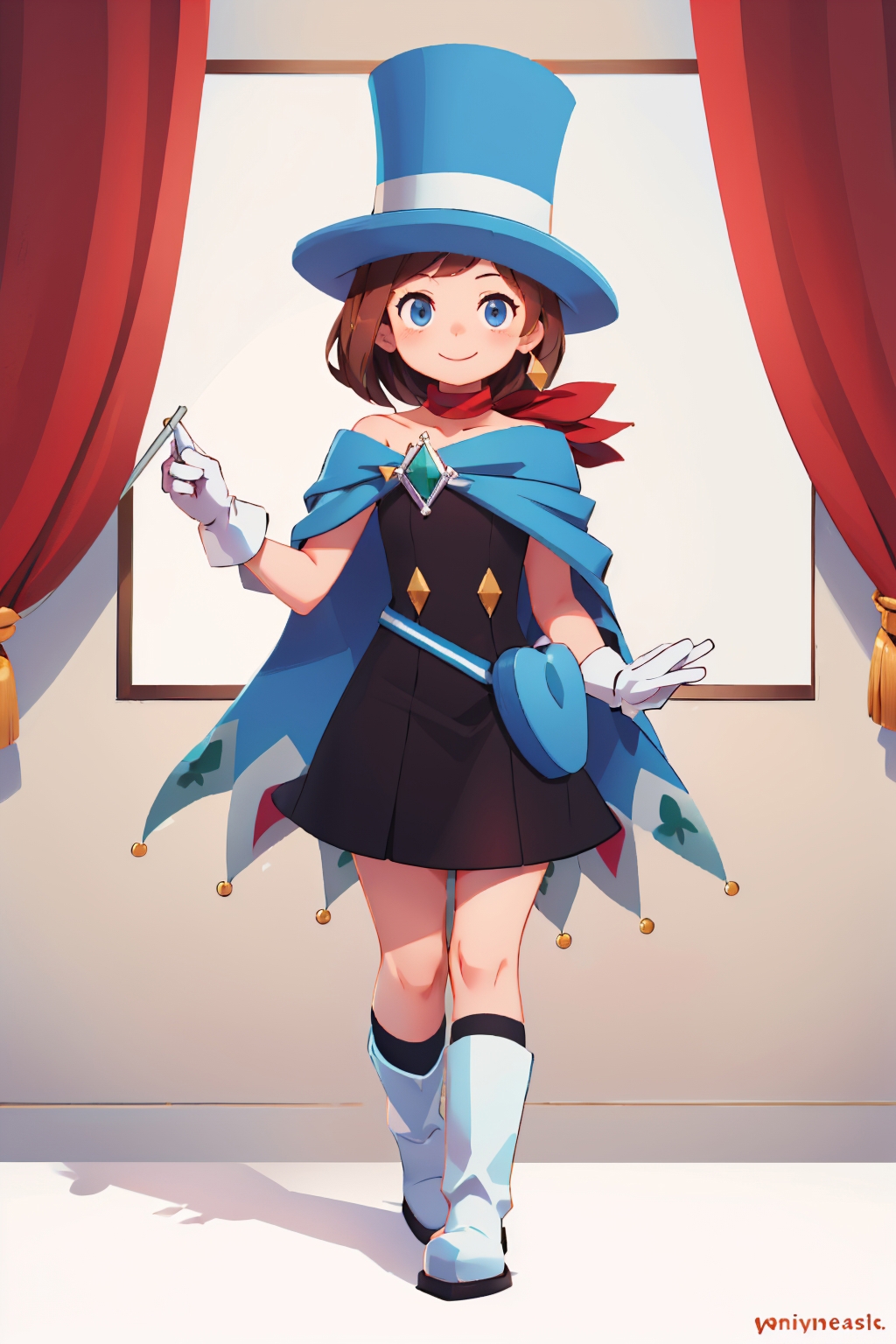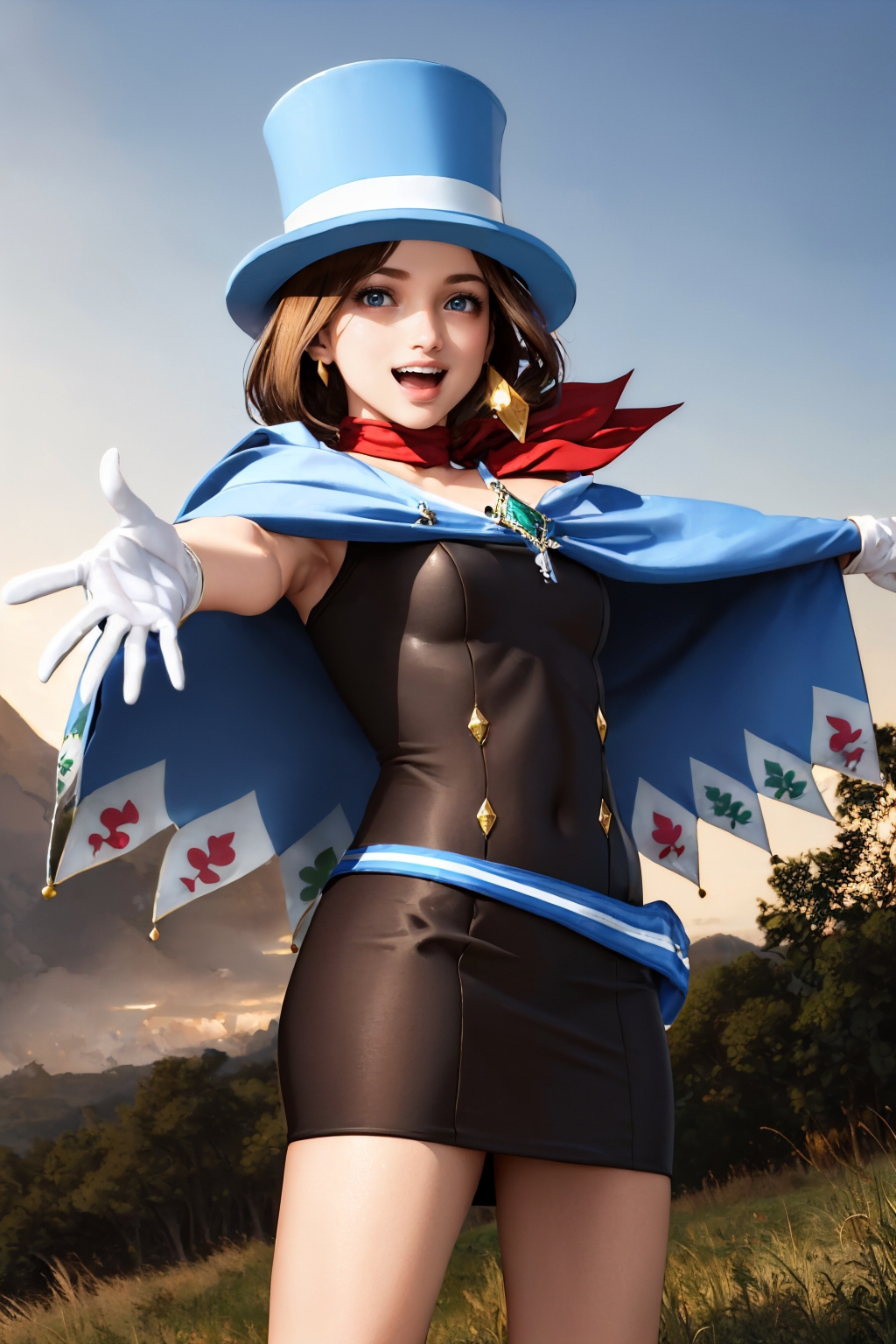 Default Outfit: top hat, dress, cape, white gloves, boots, scarf, earrings