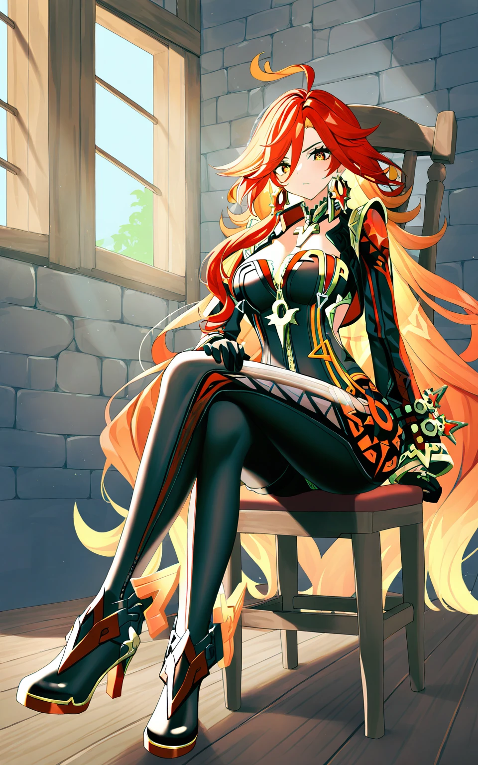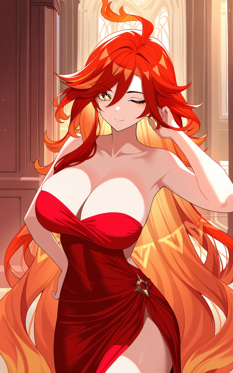 mavuikagenshin, xomaheu-shaped pupils, long hair, bangs, red hair, orange hair, multicolored hair, large breasts, eyes, hair between eyes, very long hair, ahoge, gradient hair