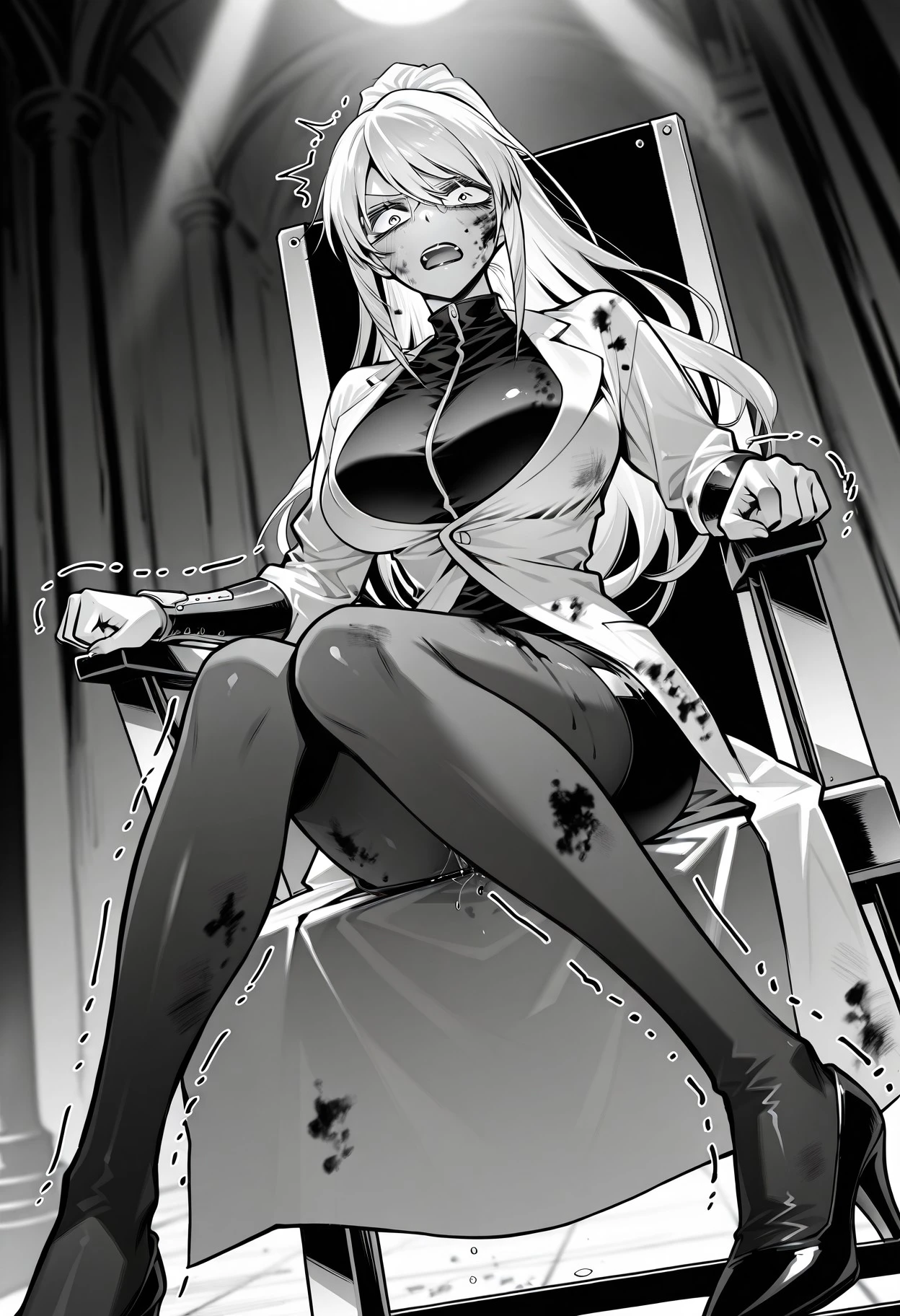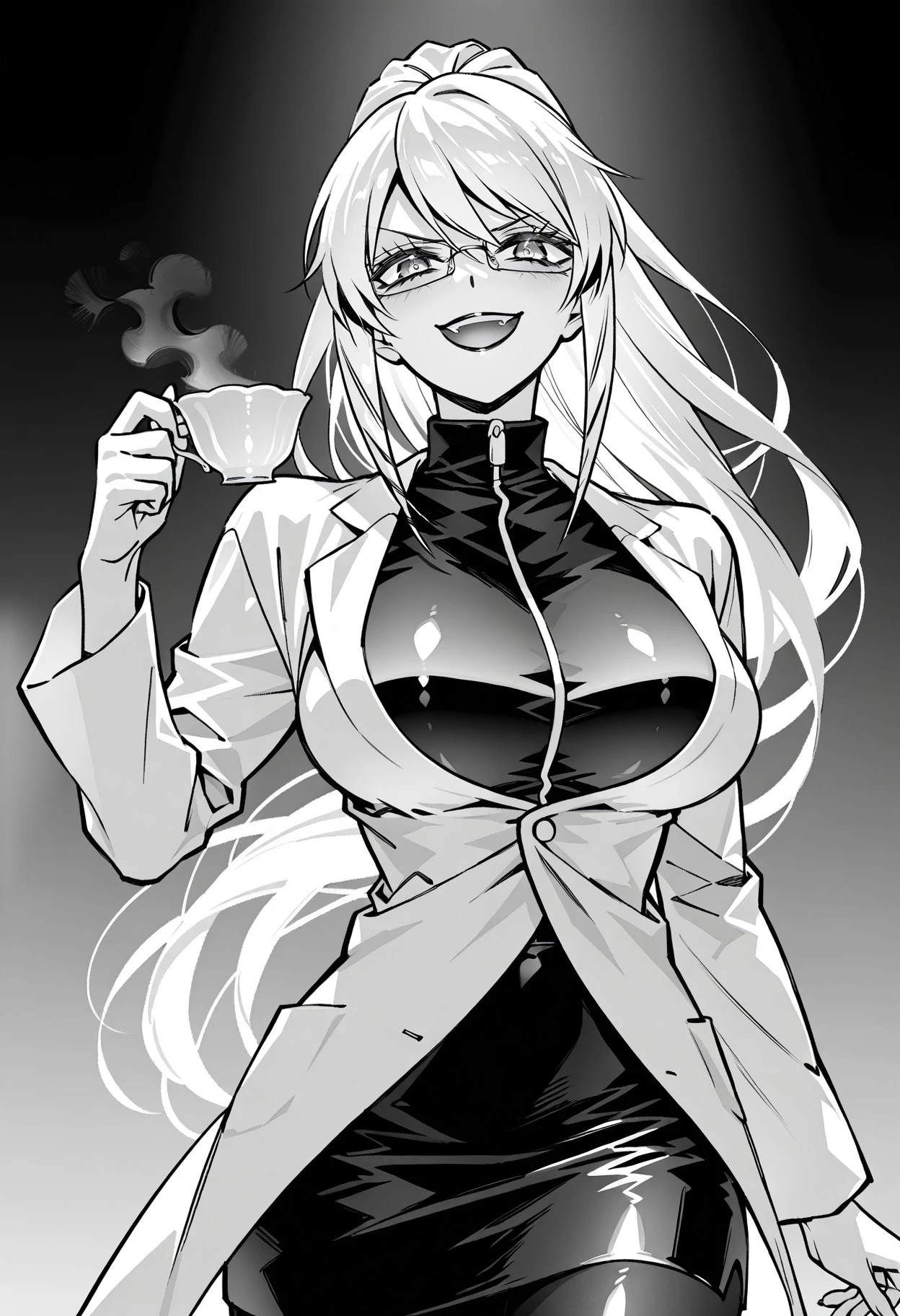 1girl, solo, Dr_RBeneke, long blonde hair, waist-length hair, high ponytail, voluminous high ponytail, side-parted long bangs, long drill-shaped sidelocks, oval face, thin eyebrows, long eyelashes, long lower eyelashes, big eyes, rectangular glasses, slim body, slim waist, narrow waist, large breasts, slim long legs, Outfit: