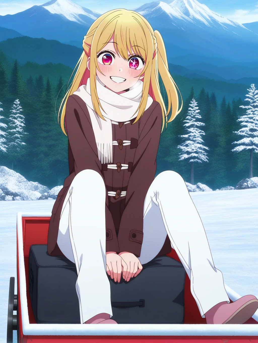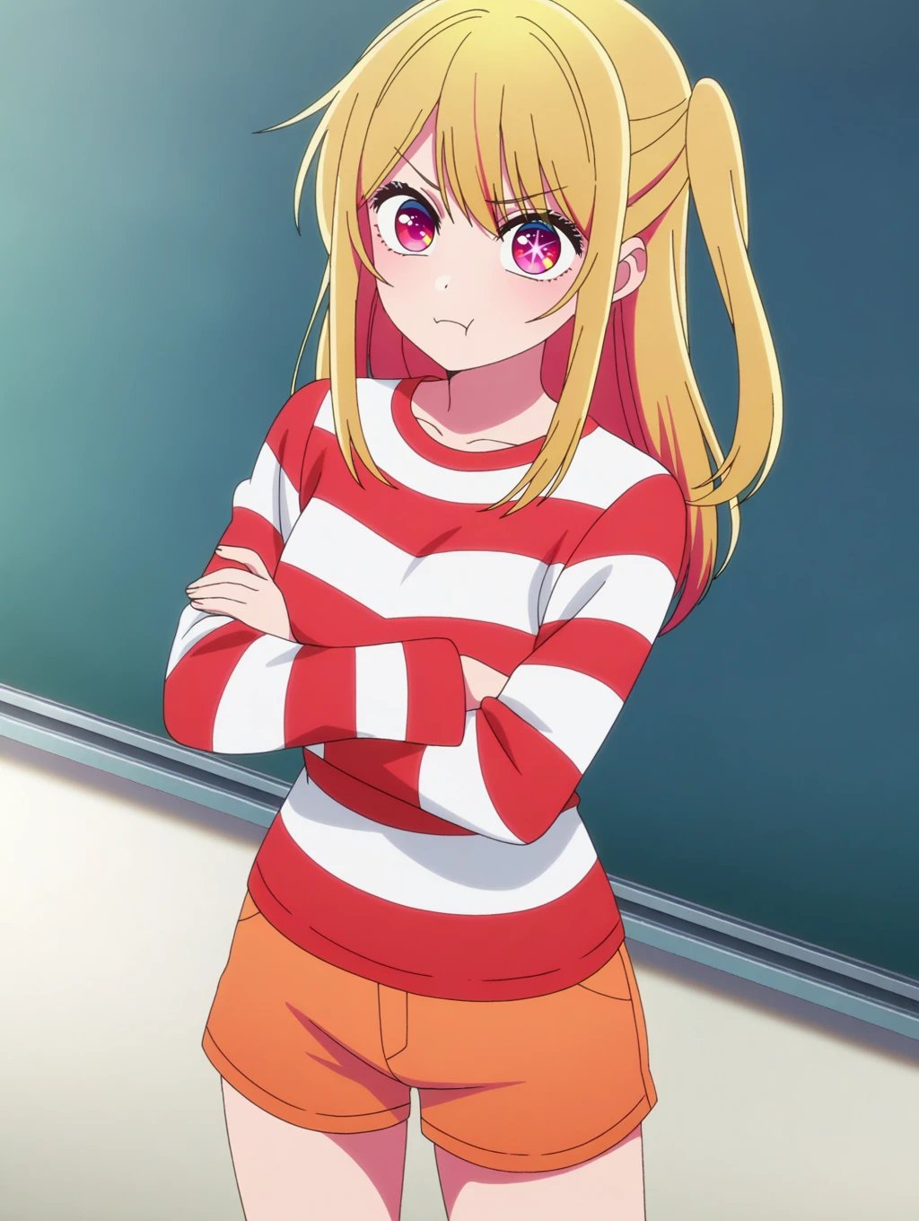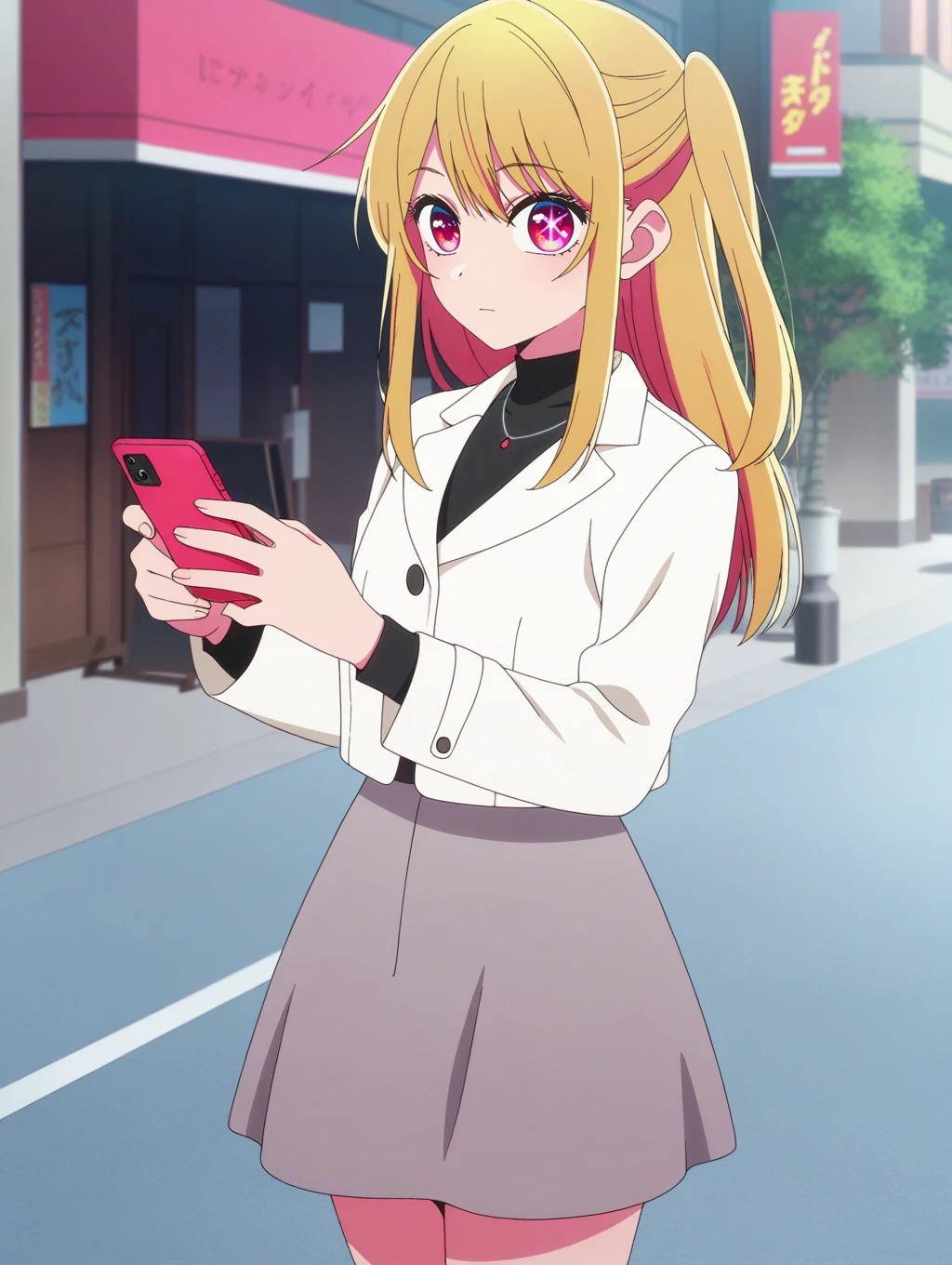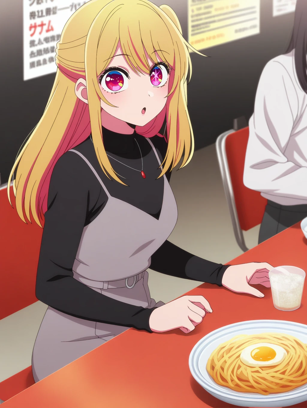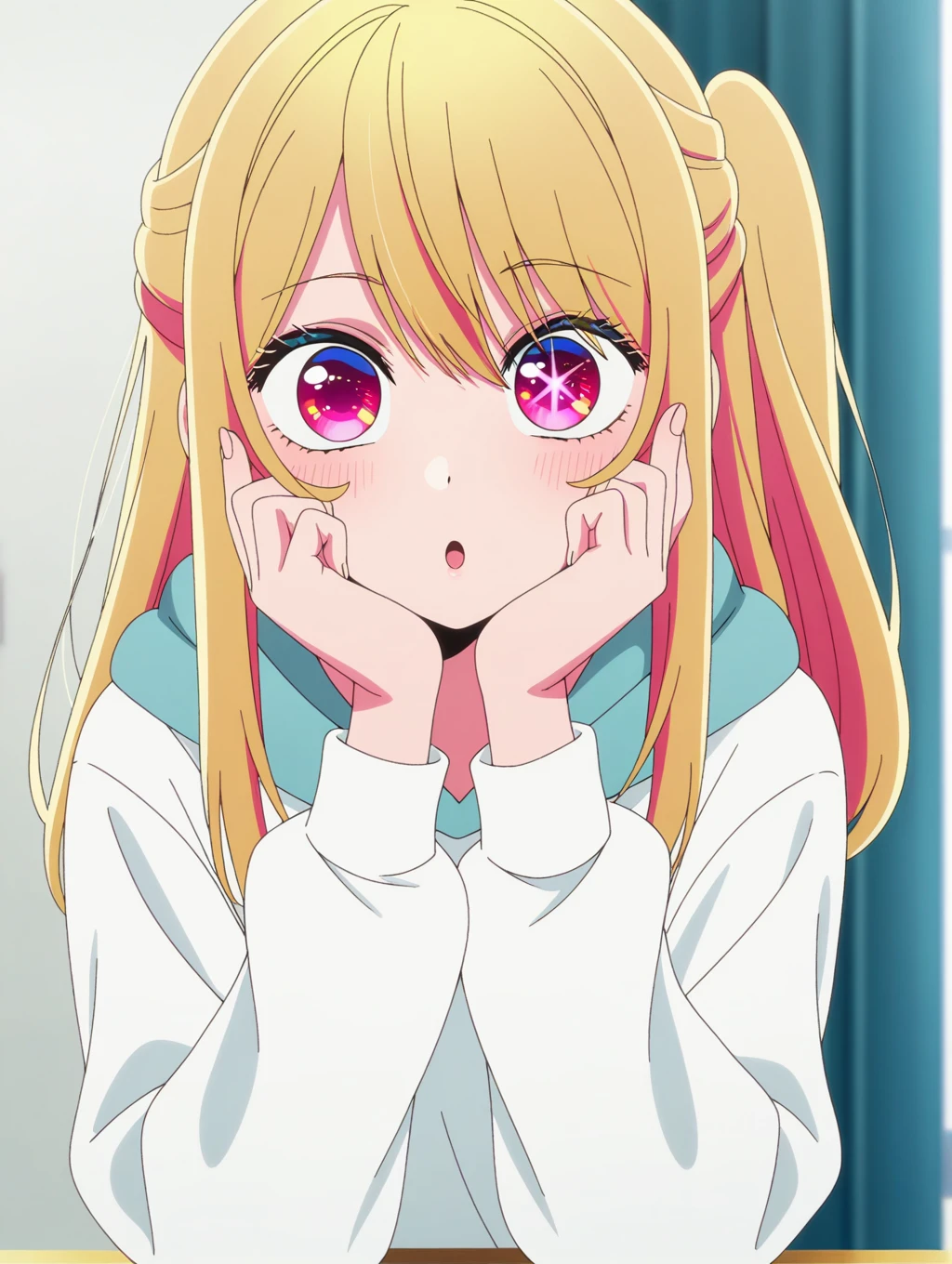 ONK_Ruby, 1girl, solo, blonde hair, long hair, bangs, sidelocks, side ponytail, pink eyes, one star-shaped pupils, anime screencap, official style
