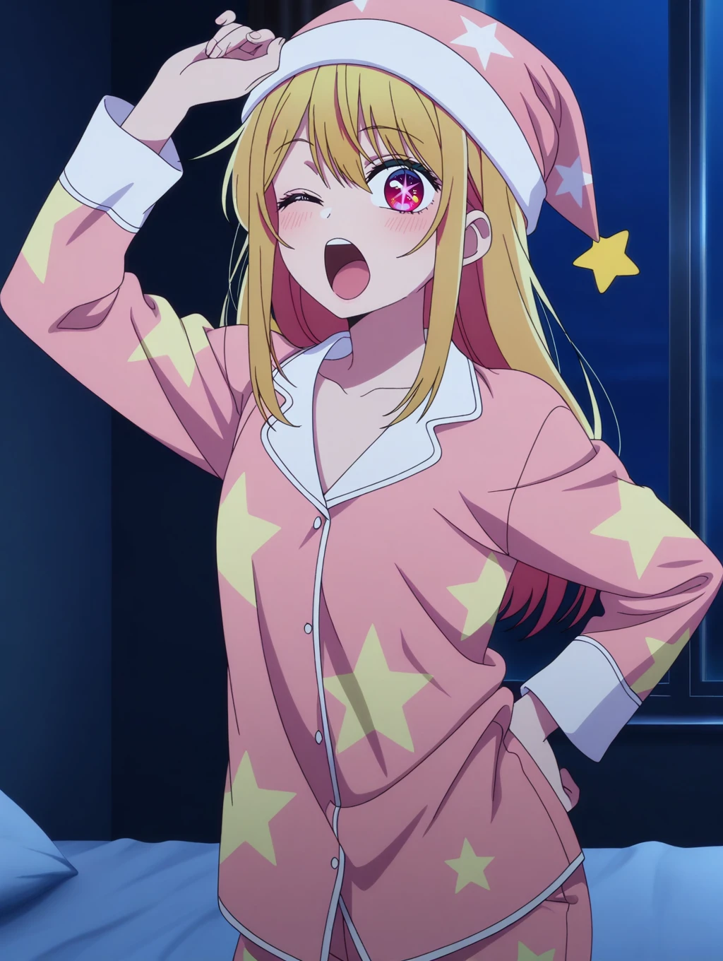 pajamas_outfit, pink pajamas, collared pajamas, white collar, star print, long sleeves, pink nightcap, star-shaped tassel, white cuffs