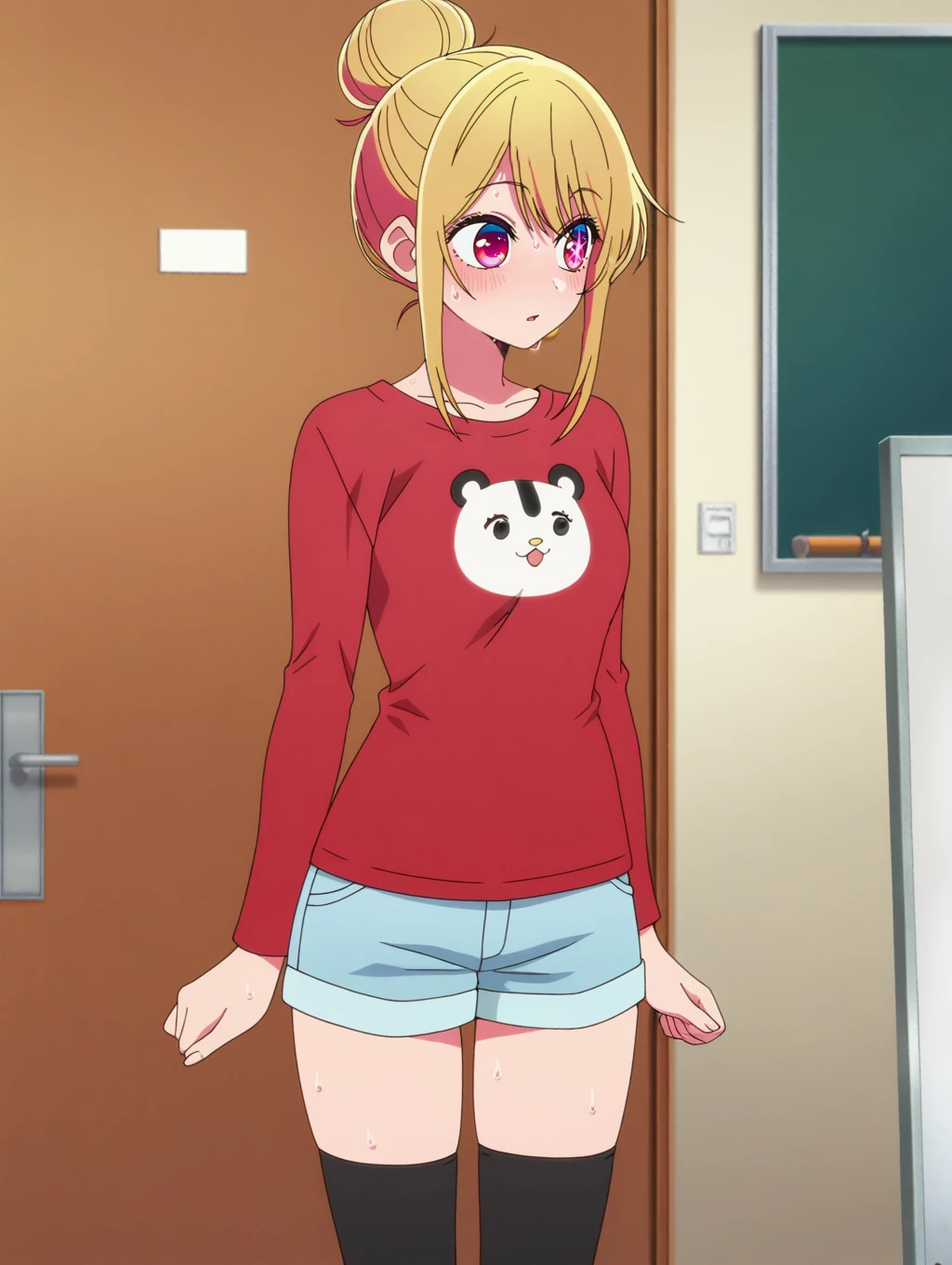casual_outfit, red shirt, long sleeves, short shorts, denim shorts, black thighhighs, animal print, thighhighs